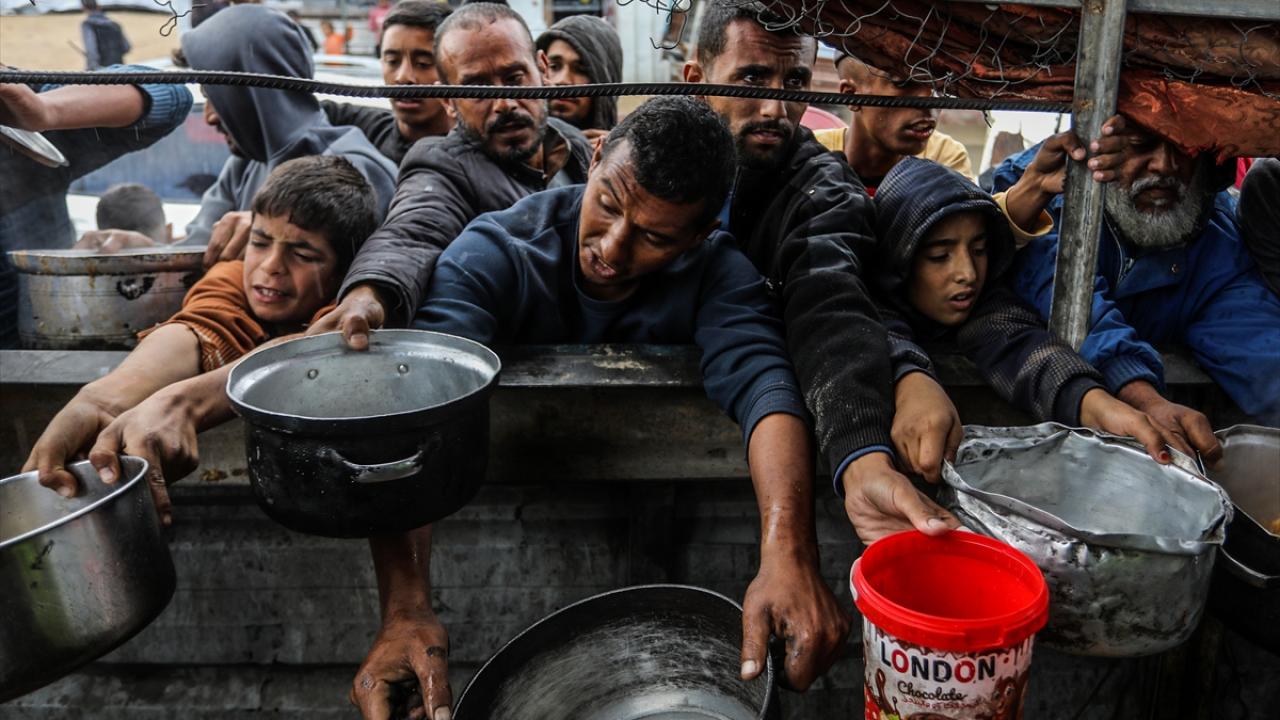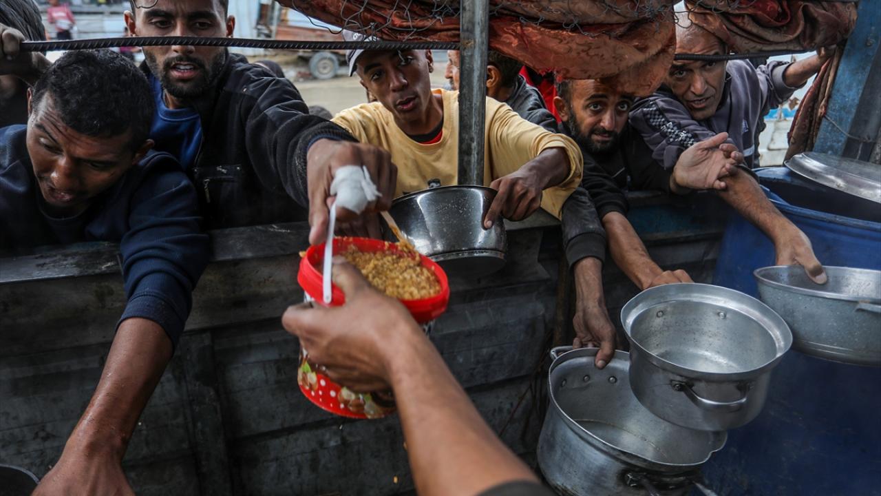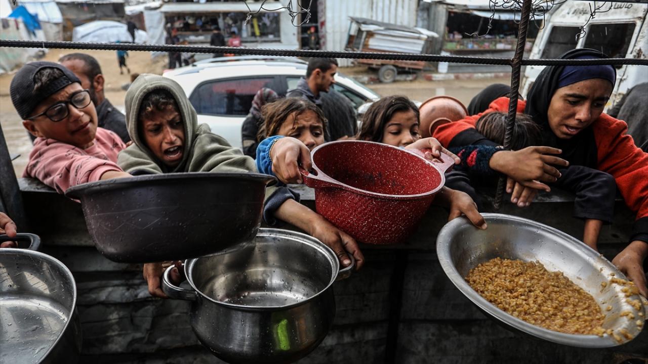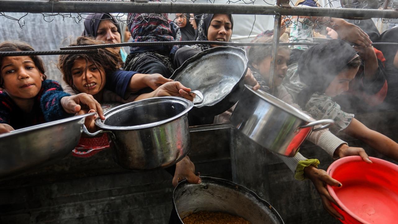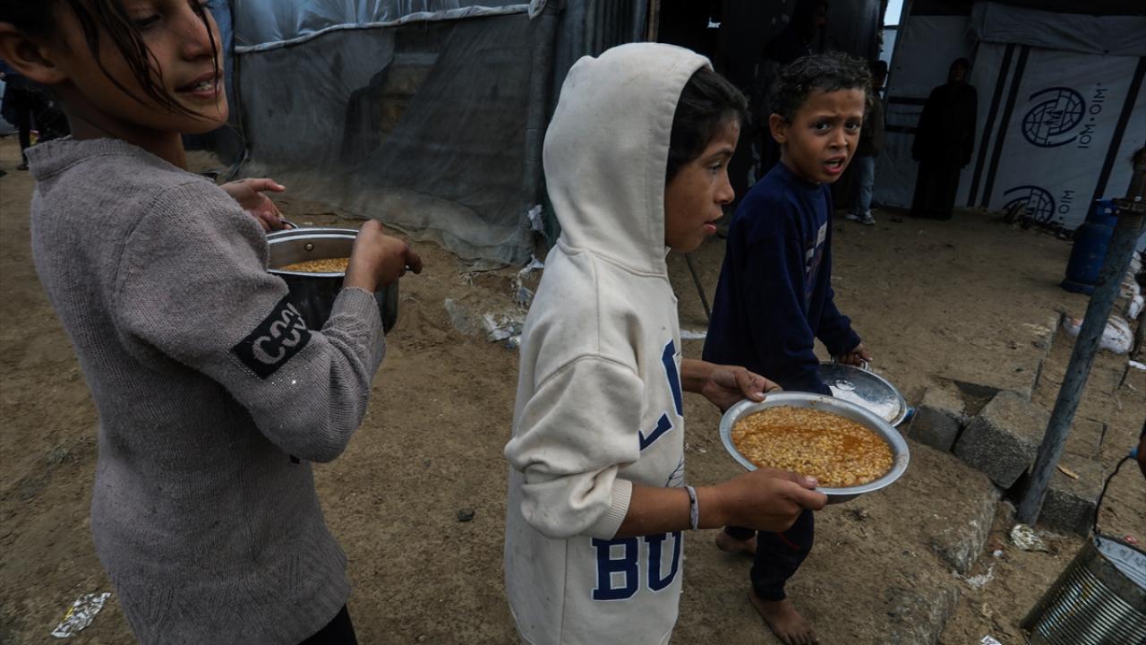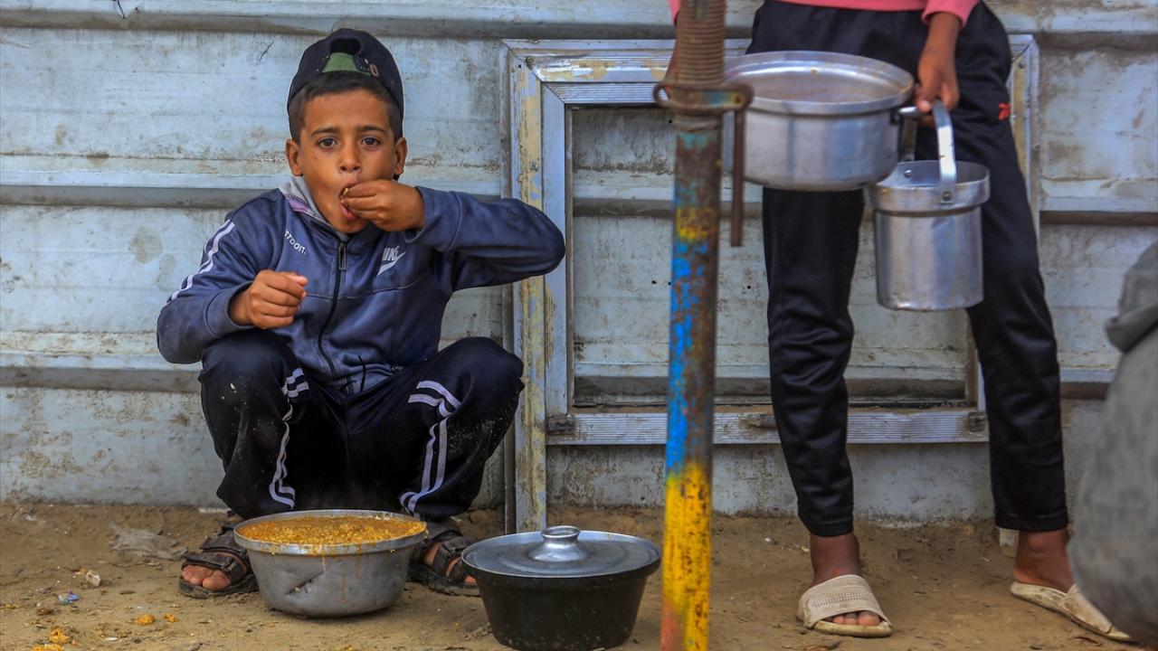 İsrail’in Gazze Şeridi’ne sınırlı sayıda insani yardım girişine izin vermesi nedeniyle gıda krizi sürerken, Han Yunus’taki el-Mevasi bölgesinde bir hayır kurumu tarafından yerinden edilen Filistinlilere yemek dağıtımı yapıldı.