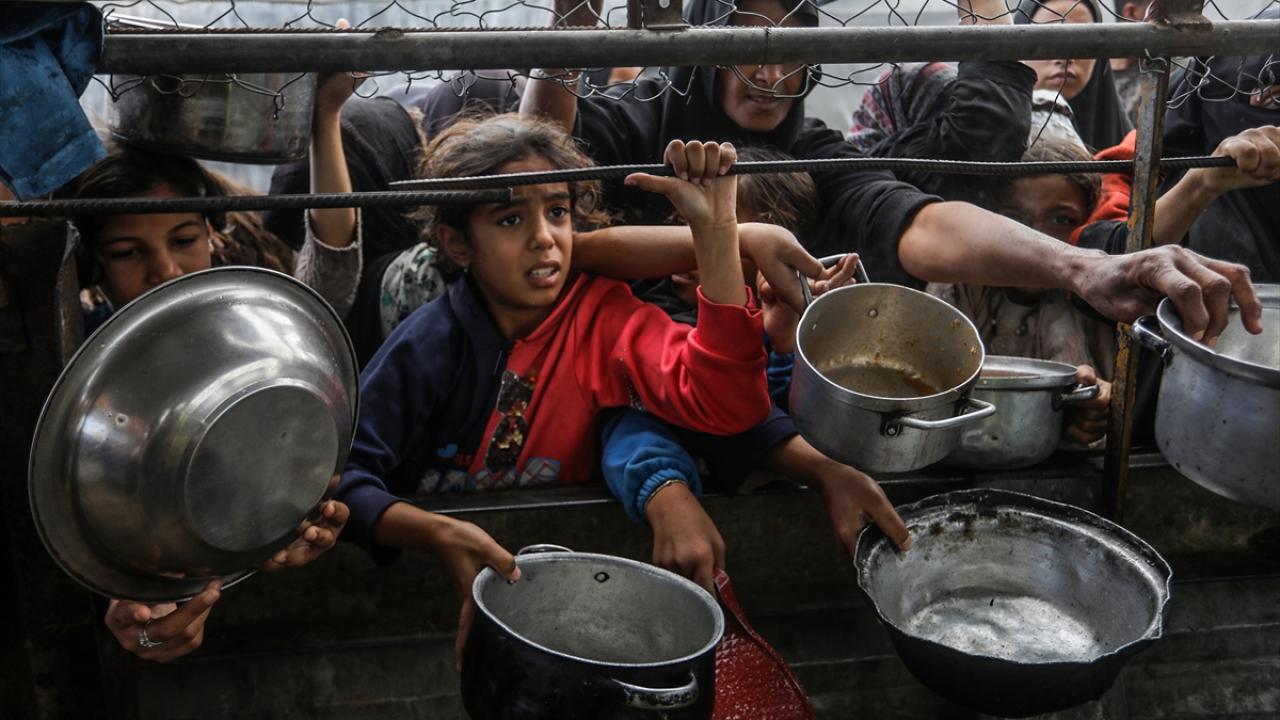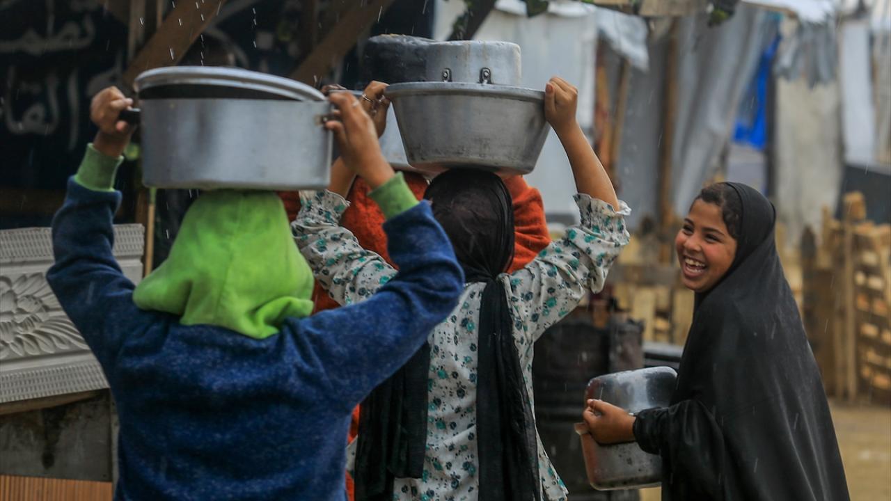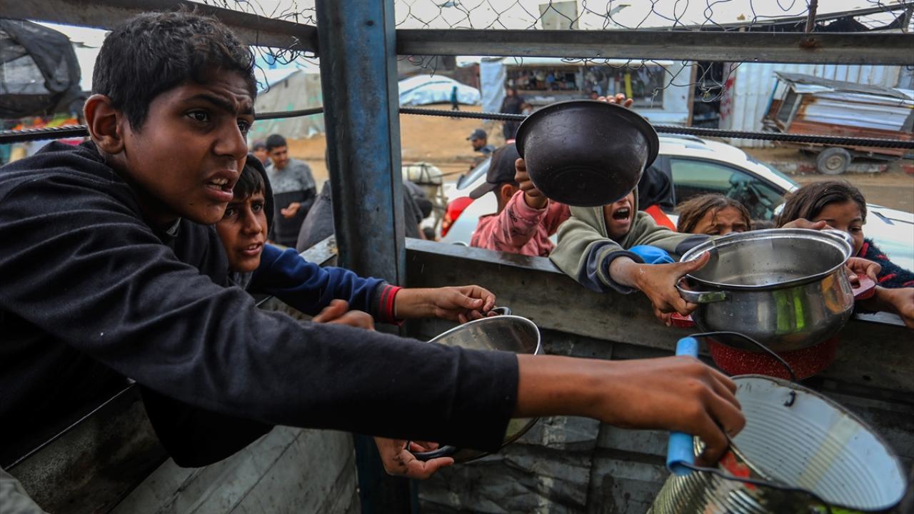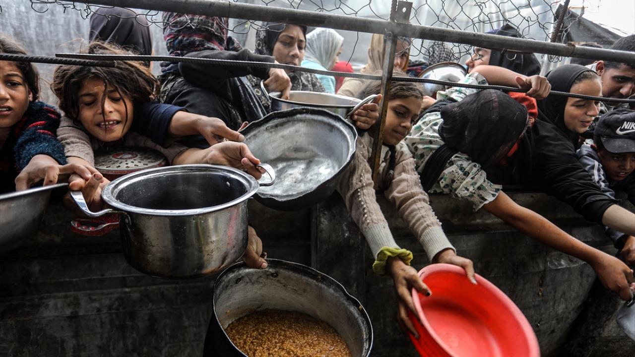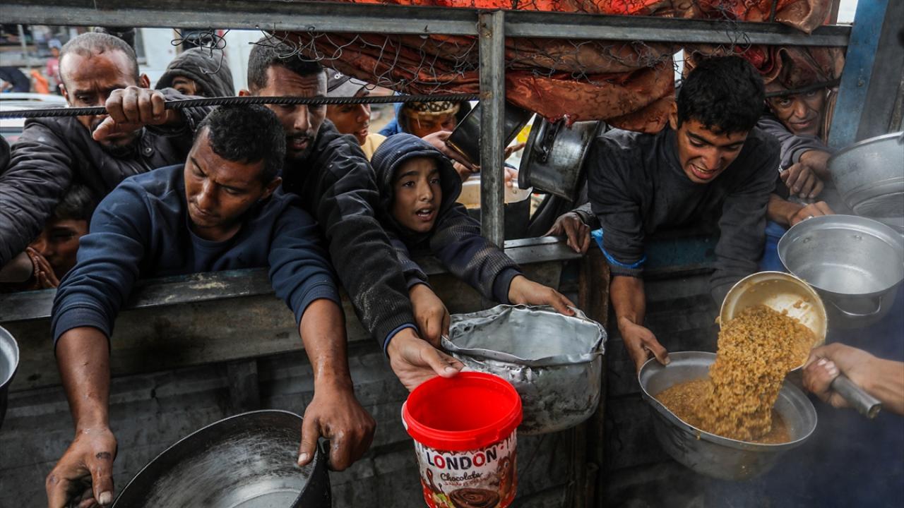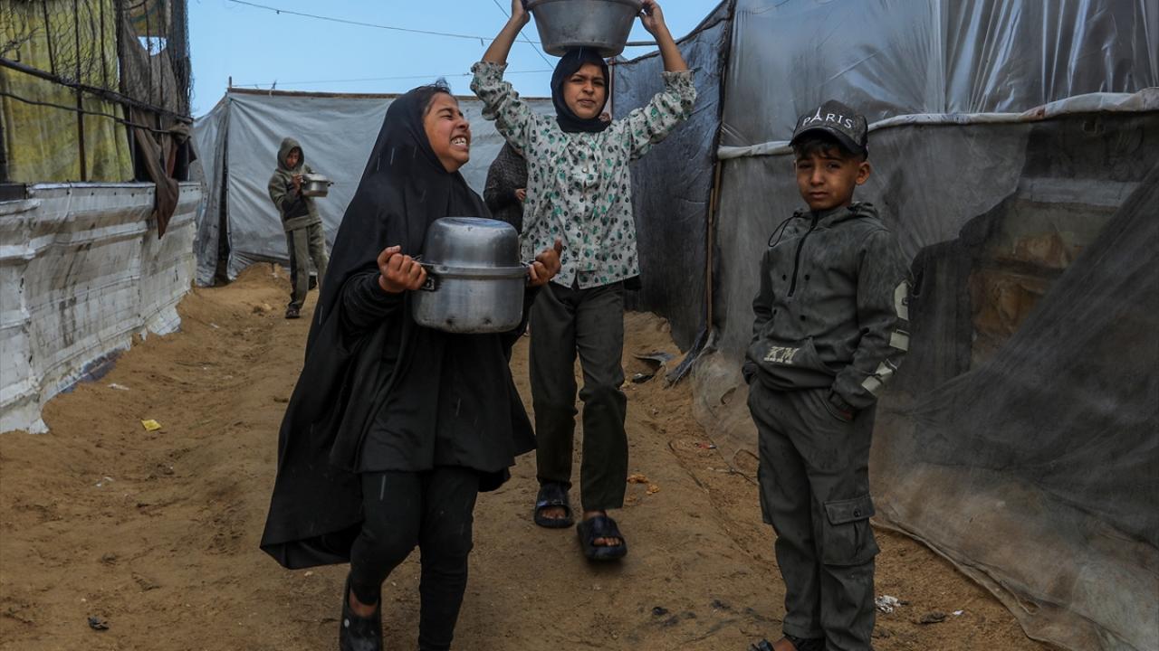 İsrail’in Gazze Şeridi’ne sınırlı sayıda insani yardım girişine izin vermesi nedeniyle gıda krizi sürerken, Han Yunus’taki el-Mevasi bölgesinde bir hayır kurumu tarafından yerinden edilen Filistinlilere yemek dağıtımı yapıldı.