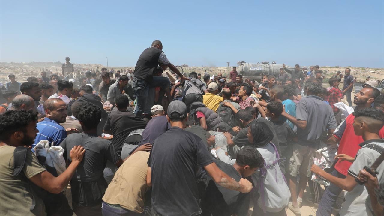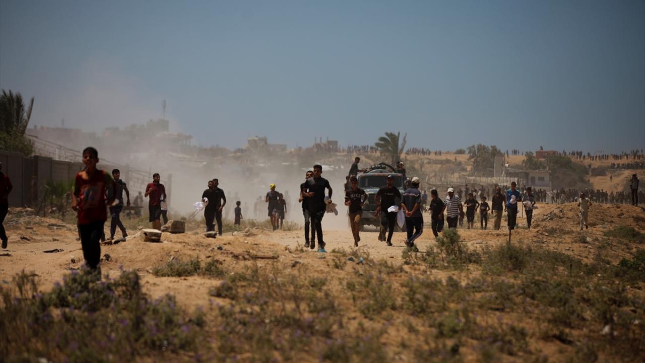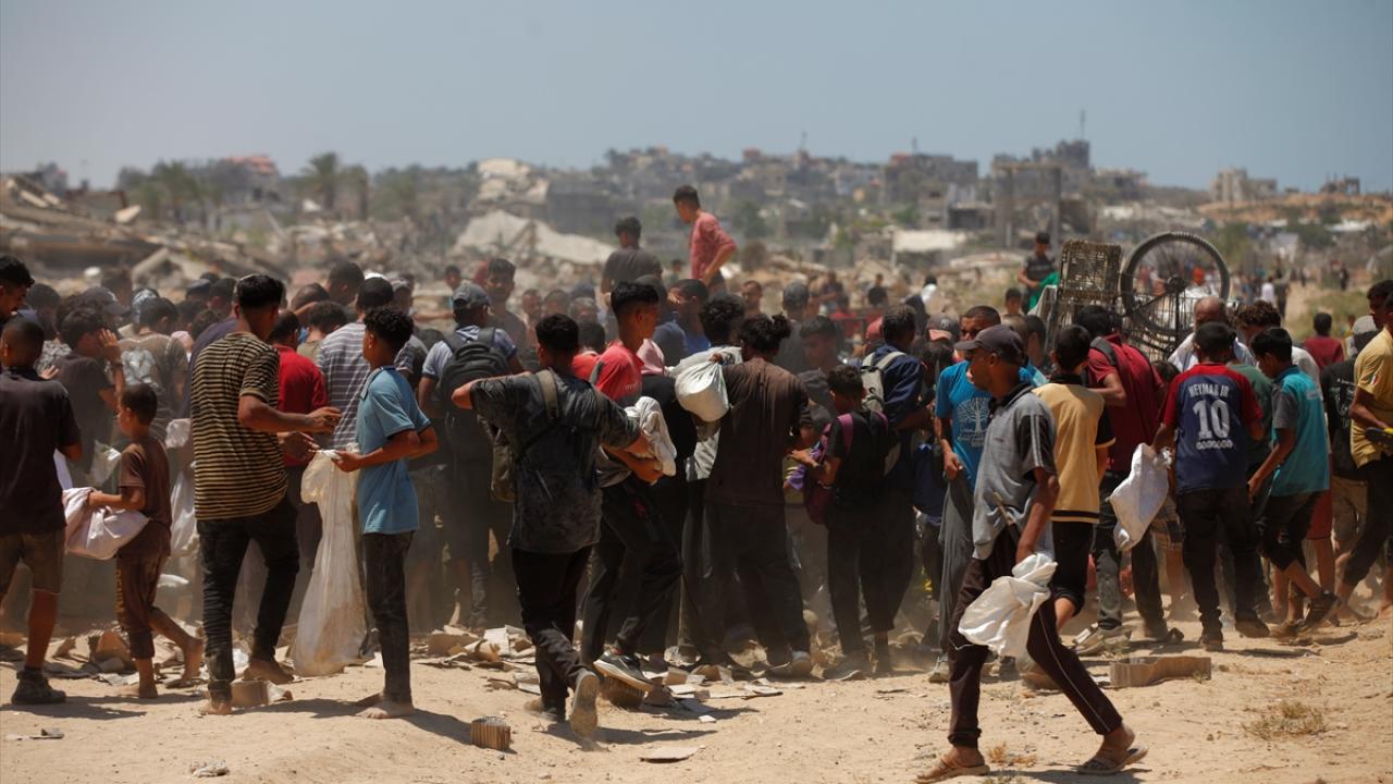 Askeri kargo uçakları tarafından bırakılan yardım malzemelerine ulaşmak isteyen bir grup Filistinli, Gazze Şeridi’nin orta kesimindeki Nuseyrat bölgesinde toplandı.