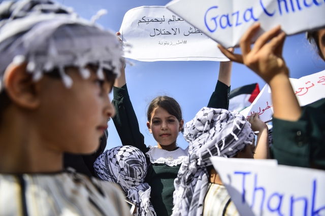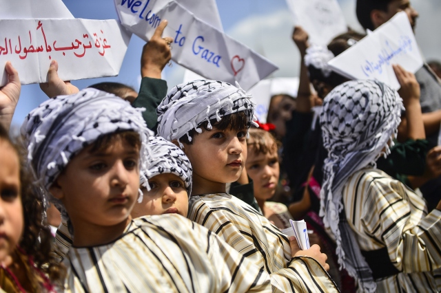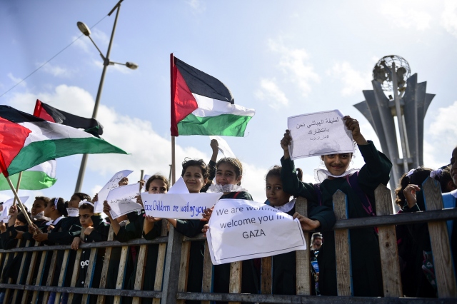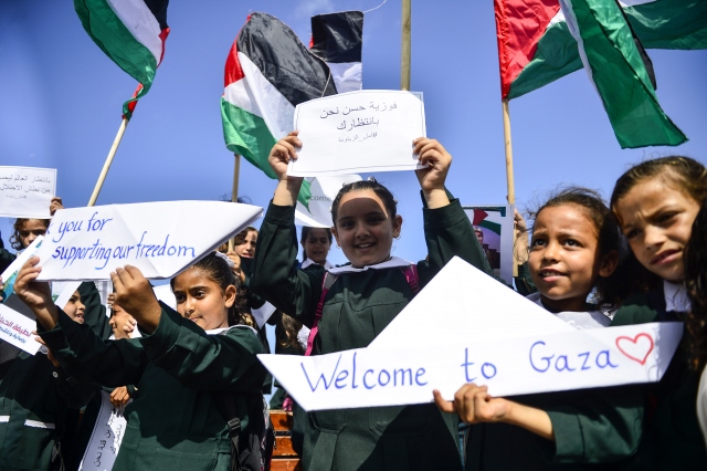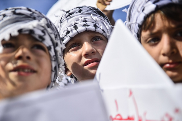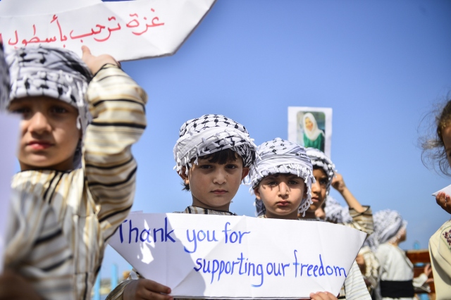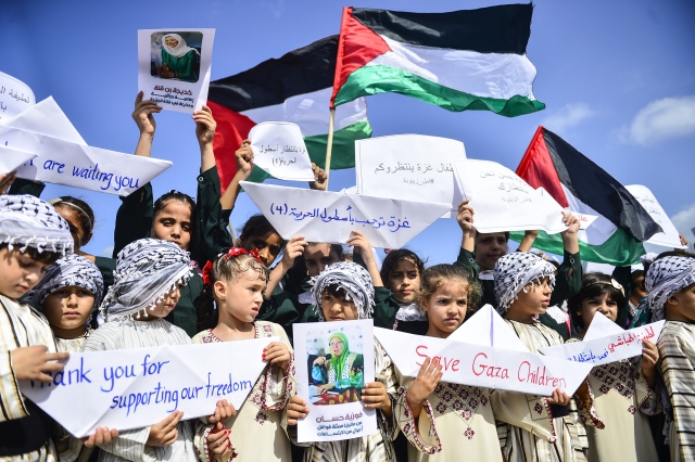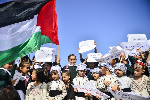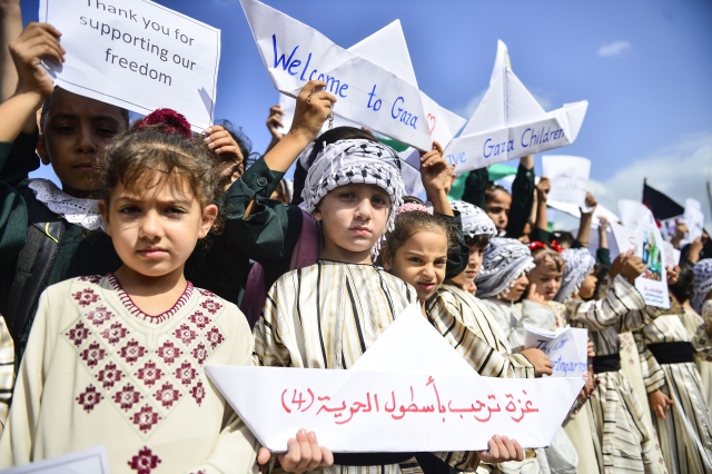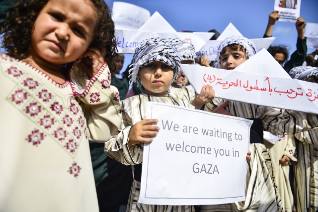 Gazze sahilinde toplanan Filistinli çocuklar, İsrail'in Gazze'ye uygulanan ablukasını delmek amacıyla yola çıkan ve Ekim ayının ilk haftası ulaşması beklenen 4. Özgürlük filosuna destek gösterisi düzenledi.