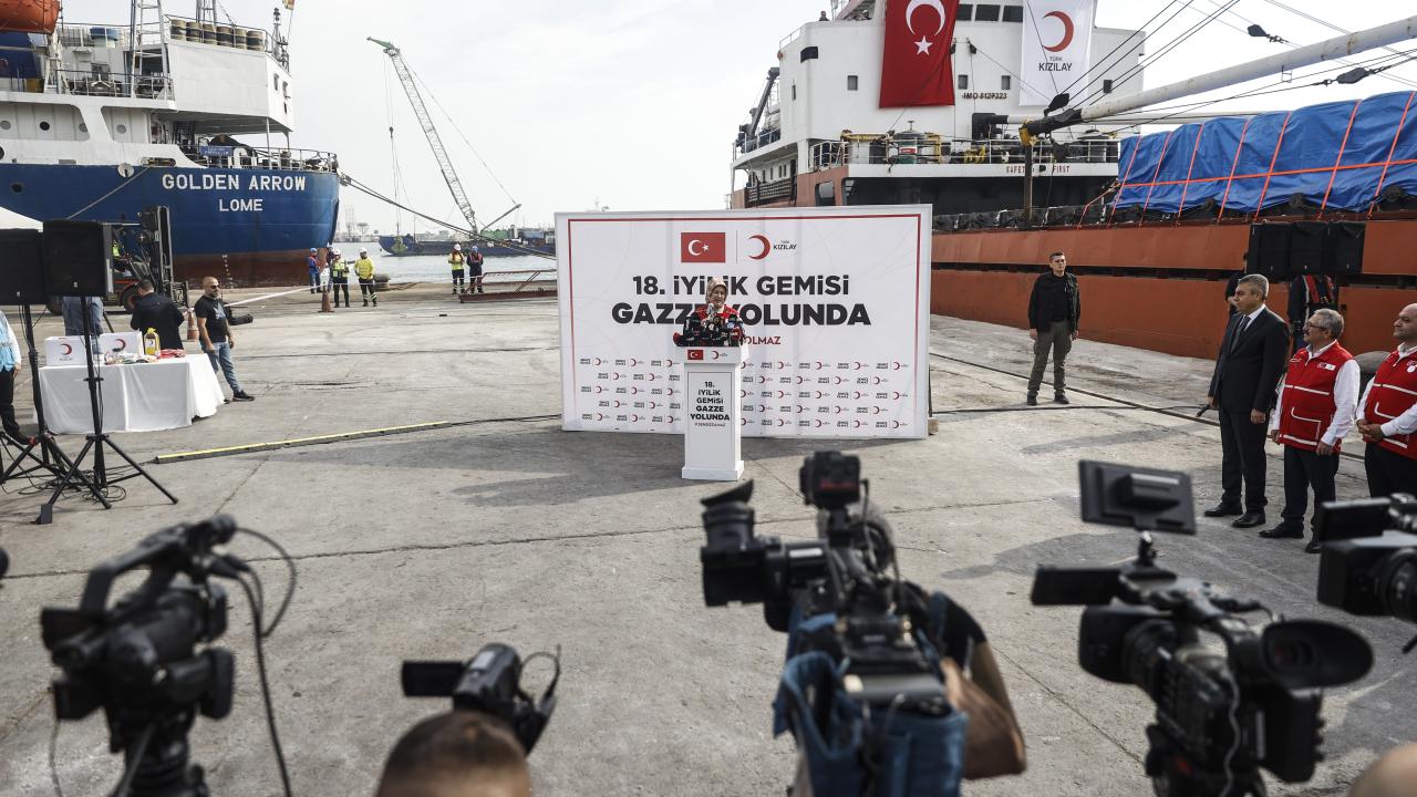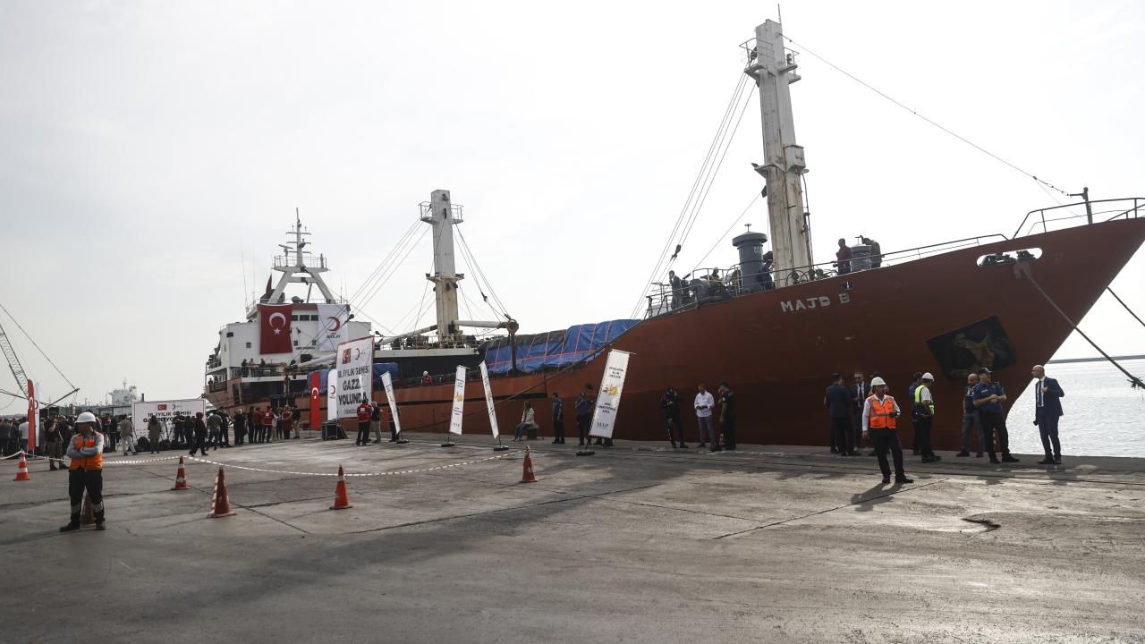 Türk Kızılayın Gazze'ye gönderilmek üzere hazırladığı, içerisinde yaklaşık 800 ton insani yardım malzemesi bulunan 18. 'İyilik Gemisi' Mersin Uluslararası Limanı'ndan uğurlandı.