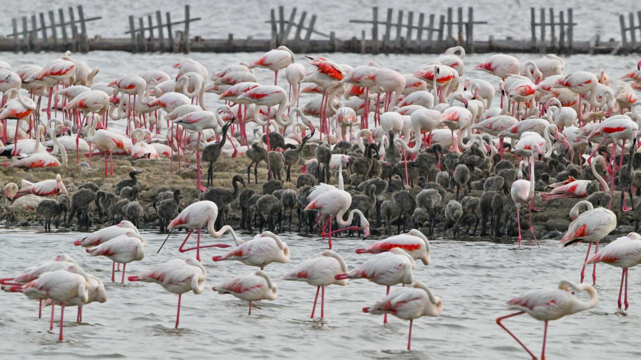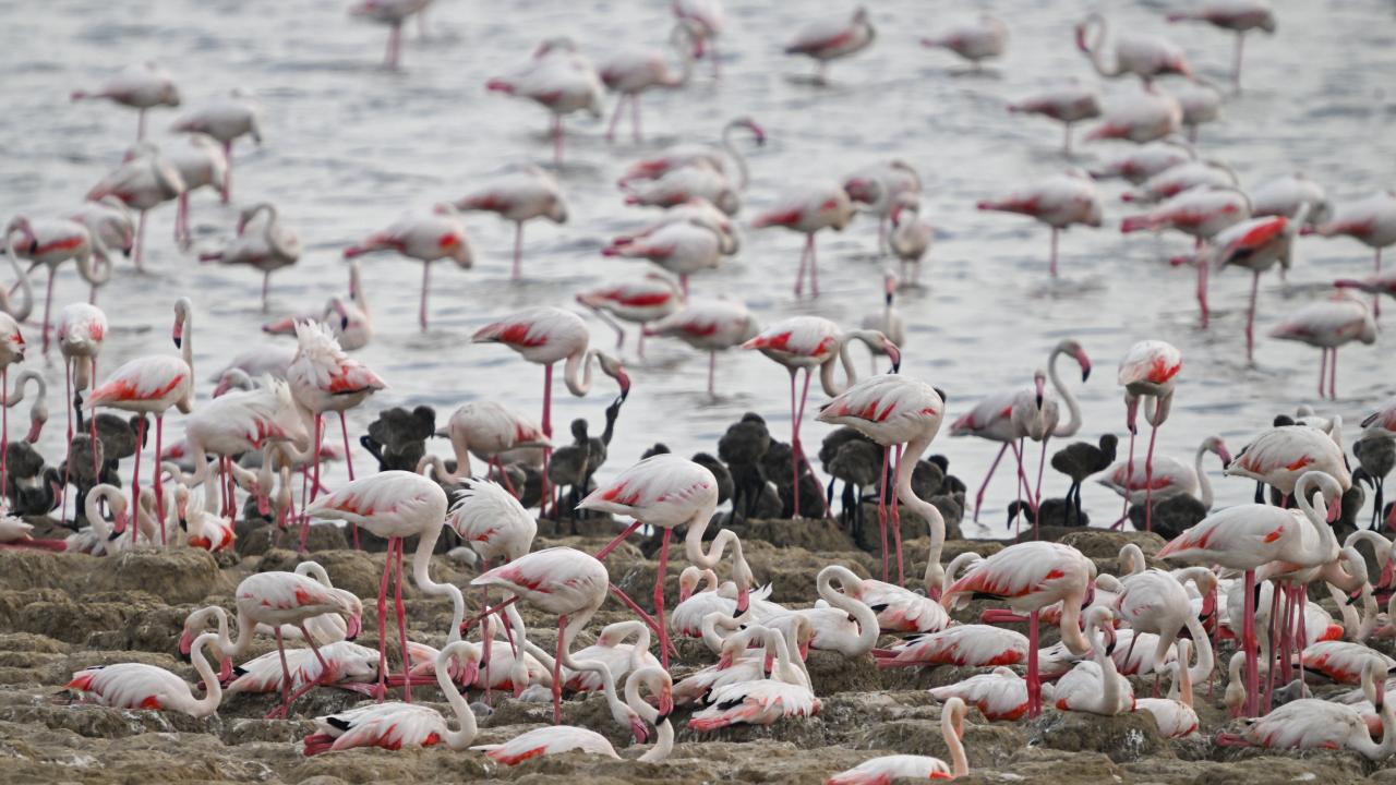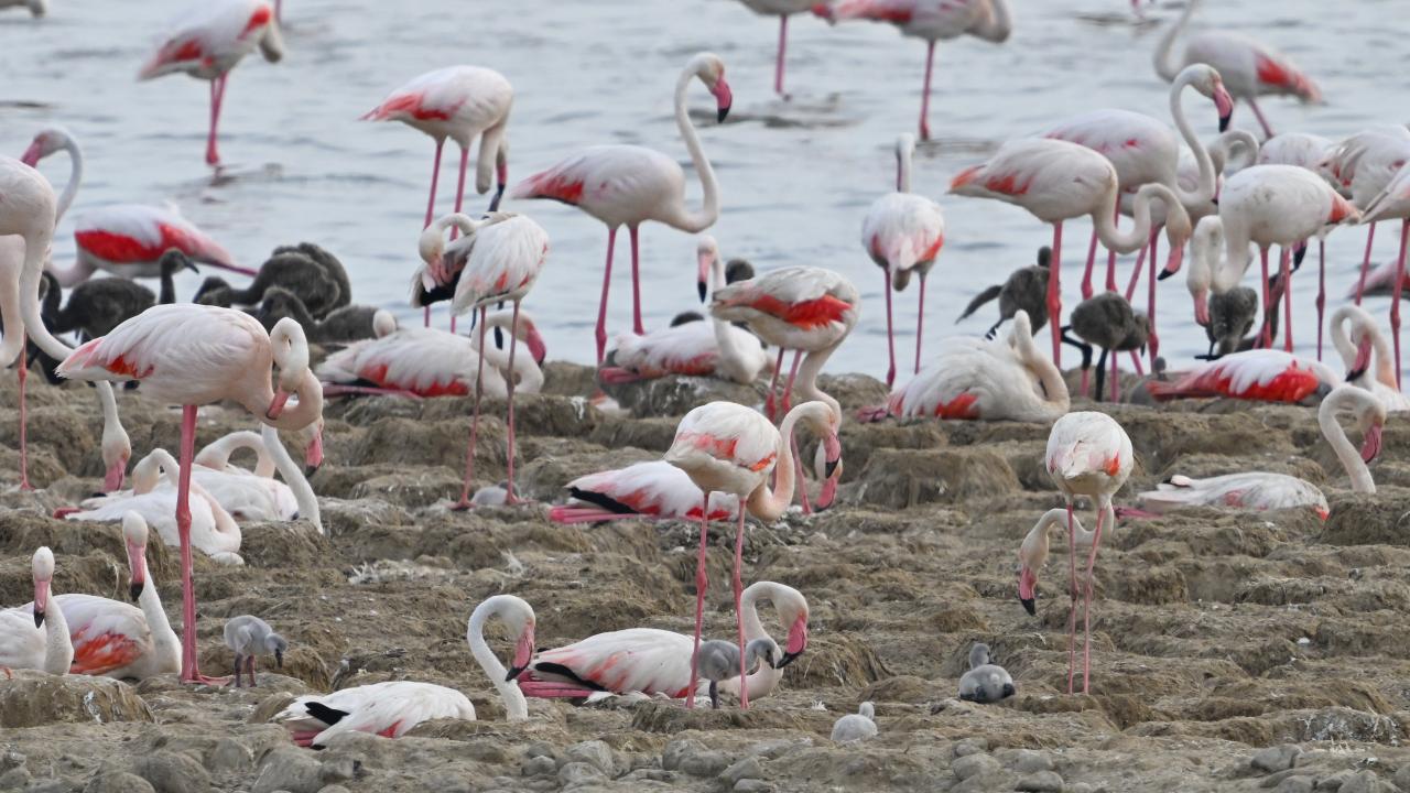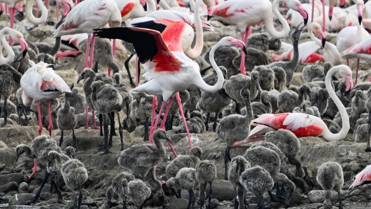 Adada binlerce yavru yumurtadan çıktı. Yavru flamingolar yumurtadan çıktıktan 20-25 gün sonra suyla tanışıyor.