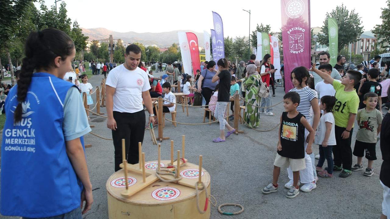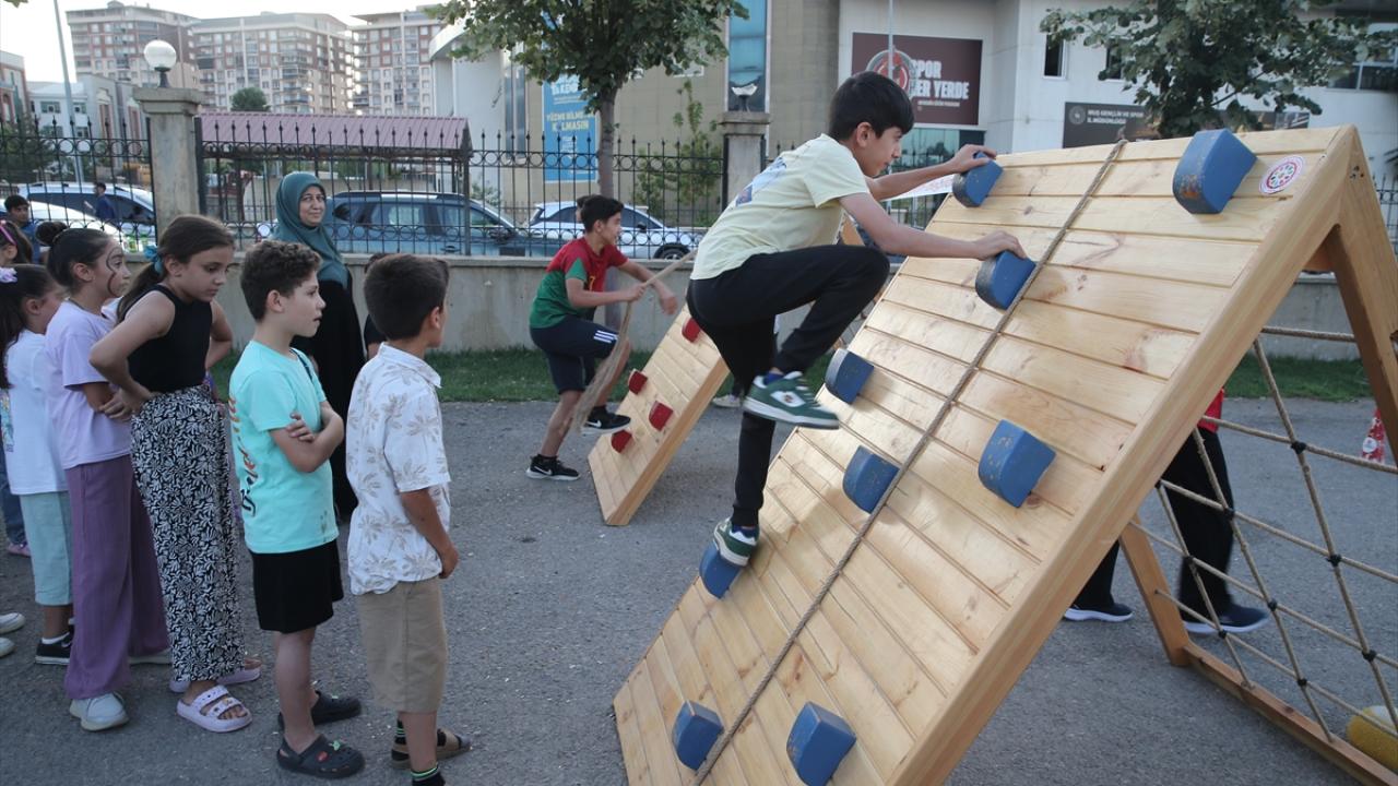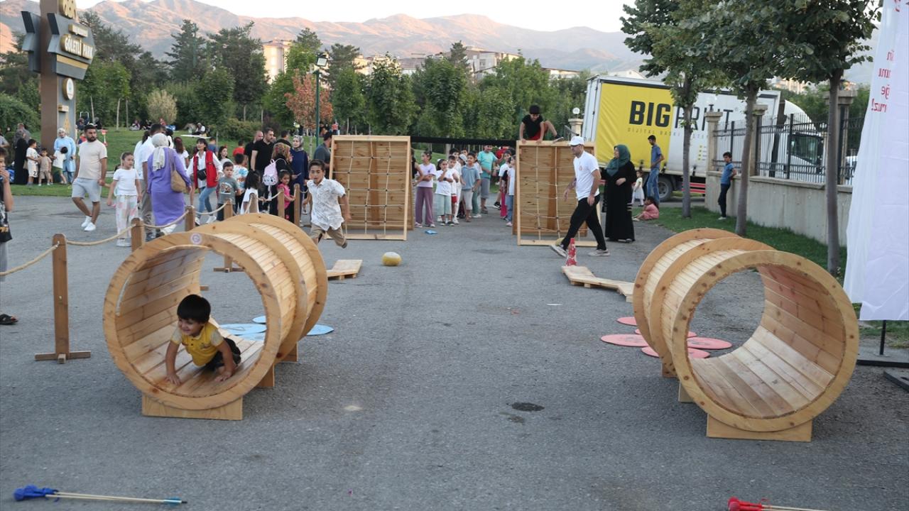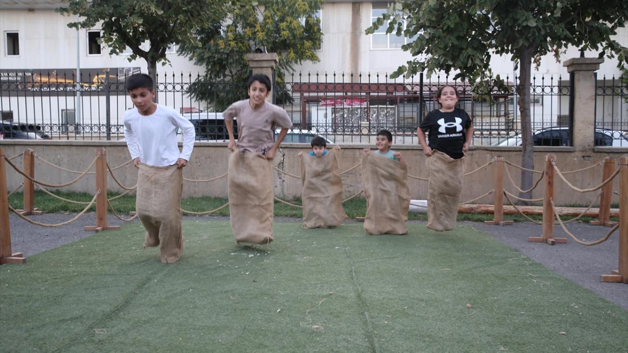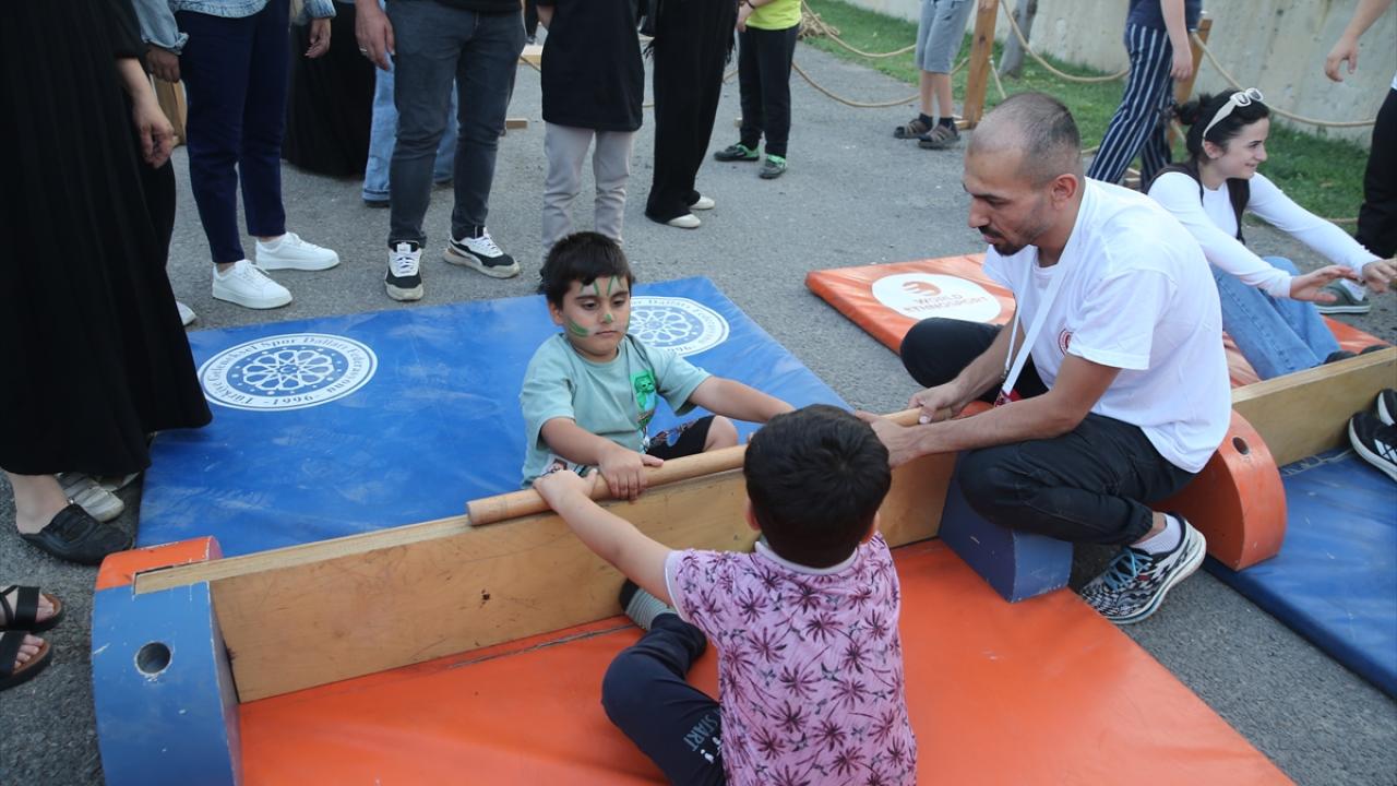 Burada oluşturulan parkurda yer alan halat çekme, koca ayak, mangala, çember çevirme ve mas güreşi gibi oyunları deneyimleyen çocuklar doyasıya eğlendi.