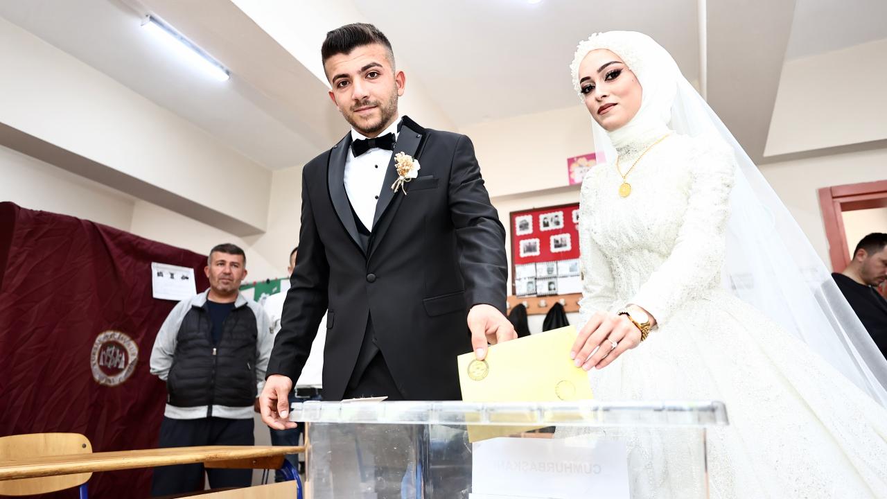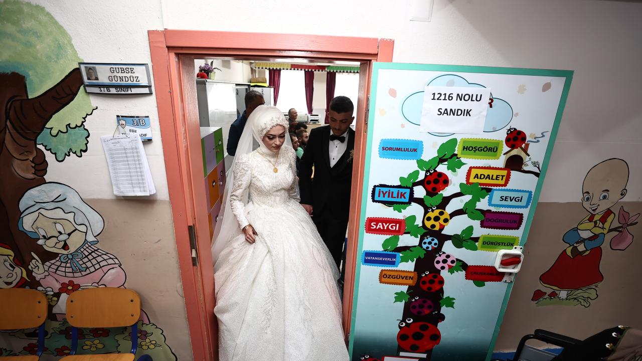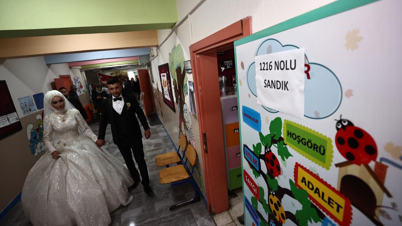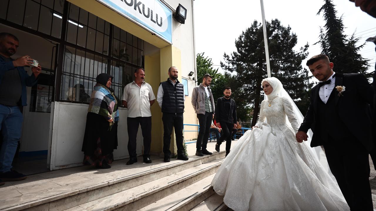 Akşam saatlerinde düzenlenecek düğün töreni öncesi gelinlik ve damatlıkla merkeze bağlı Karaca Mahallesi`ndeki 100. Yıl Ortaokulu`na gelen Özge ve İsmail Çoban çifti, kayıtlı oldukları sandıkta oy kullandı.