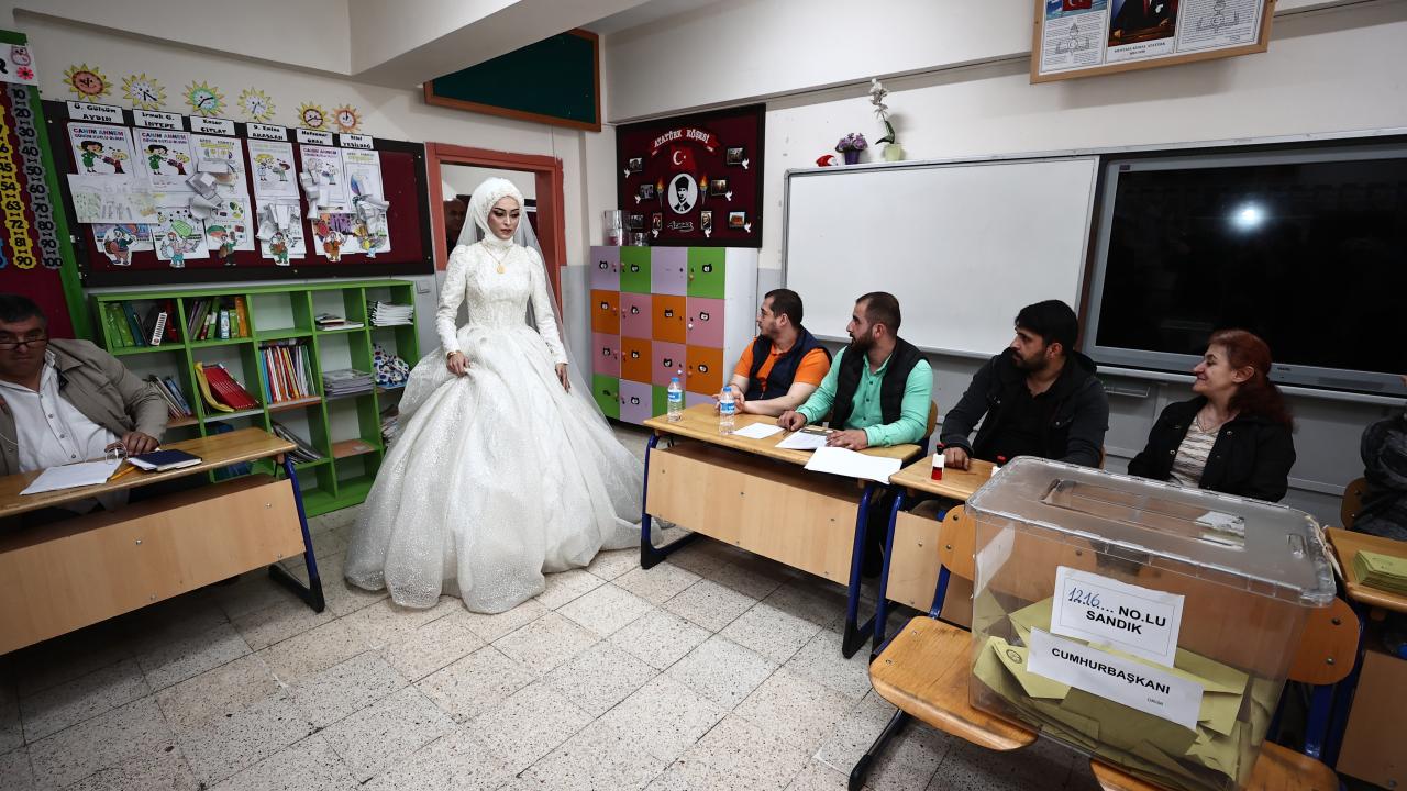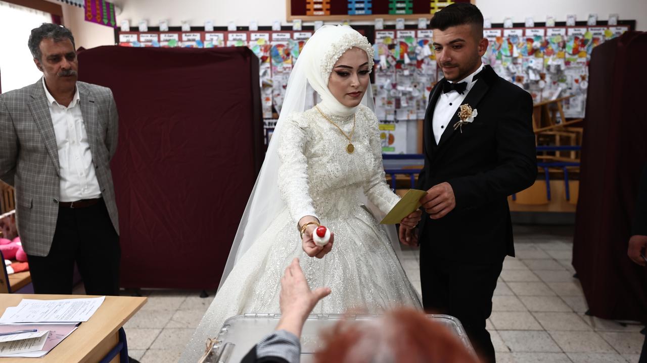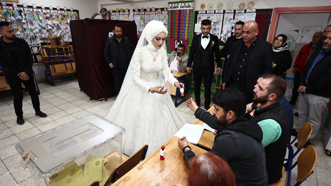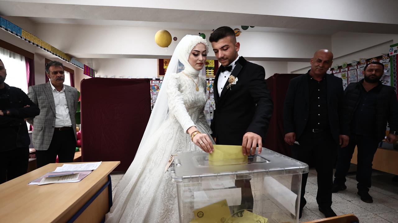 Akşam saatlerinde düzenlenecek düğün töreni öncesi gelinlik ve damatlıkla merkeze bağlı Karaca Mahallesi`ndeki 100. Yıl Ortaokulu`na gelen Özge ve İsmail Çoban çifti, kayıtlı oldukları sandıkta oy kullandı.
