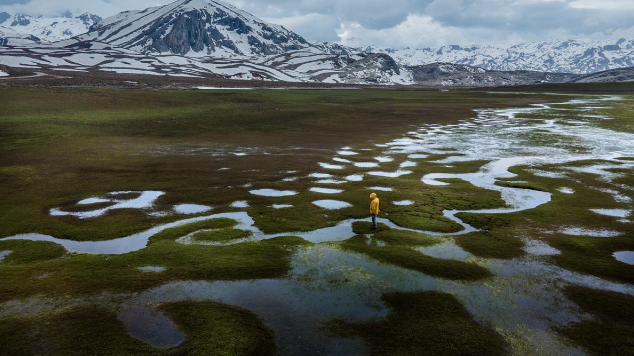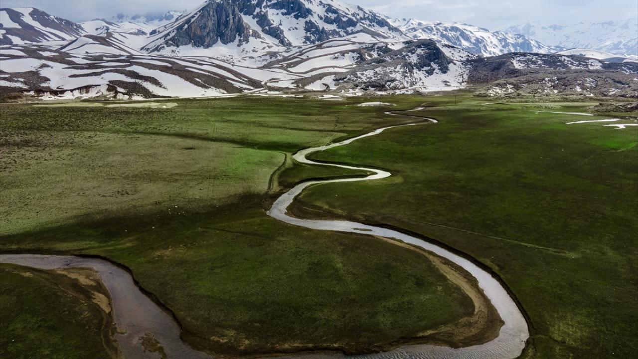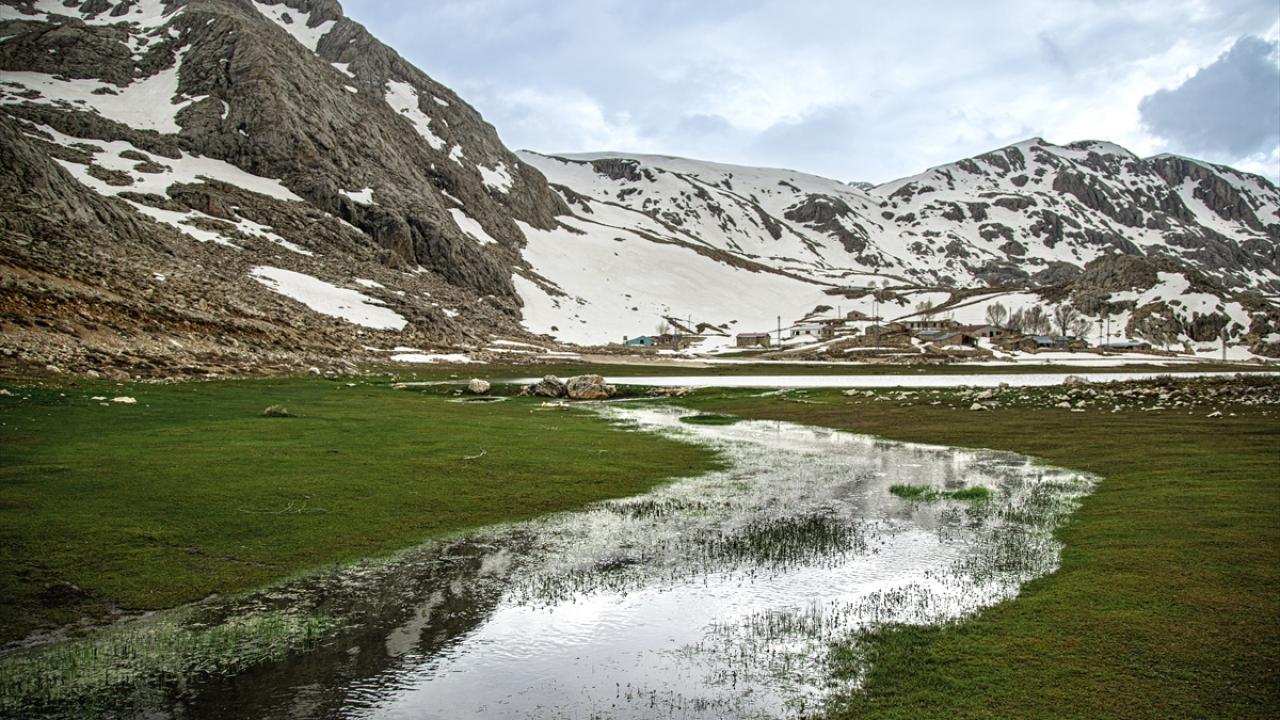 Konya, Karaman ve Antalya illeri arasında sınır çizgisi çizen Geyik Dağları'nın beyaza bürünen zirvelerinde kış adeta devam ederken, eteklerinde ise bahar mevsiminin renkleri görülüyor.