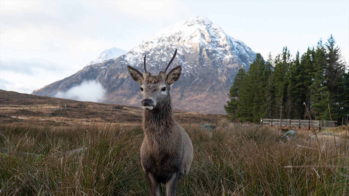 Karla kaplı dağ zirvesi, uçsuz bucaksız topraklar ve geyikler ilgi çekici görüntüler sergiledi.