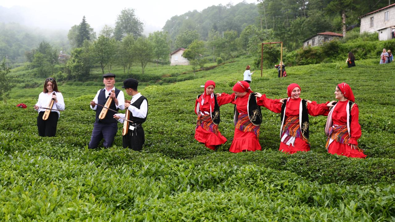 Etkinlikte, kemençe ve horon eşliğinde bahçeye giren üreticiler çay topladı.