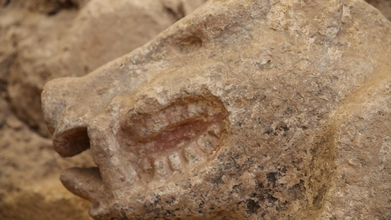 Göbeklitepe`nin `D yapısında` bulunan, kireç taşından yapılmış, gerçek boyutlu yaban domuzu heykelinin yüzeyinde kırmızı, beyaz ve siyah pigment kalıntılar görülüyor.