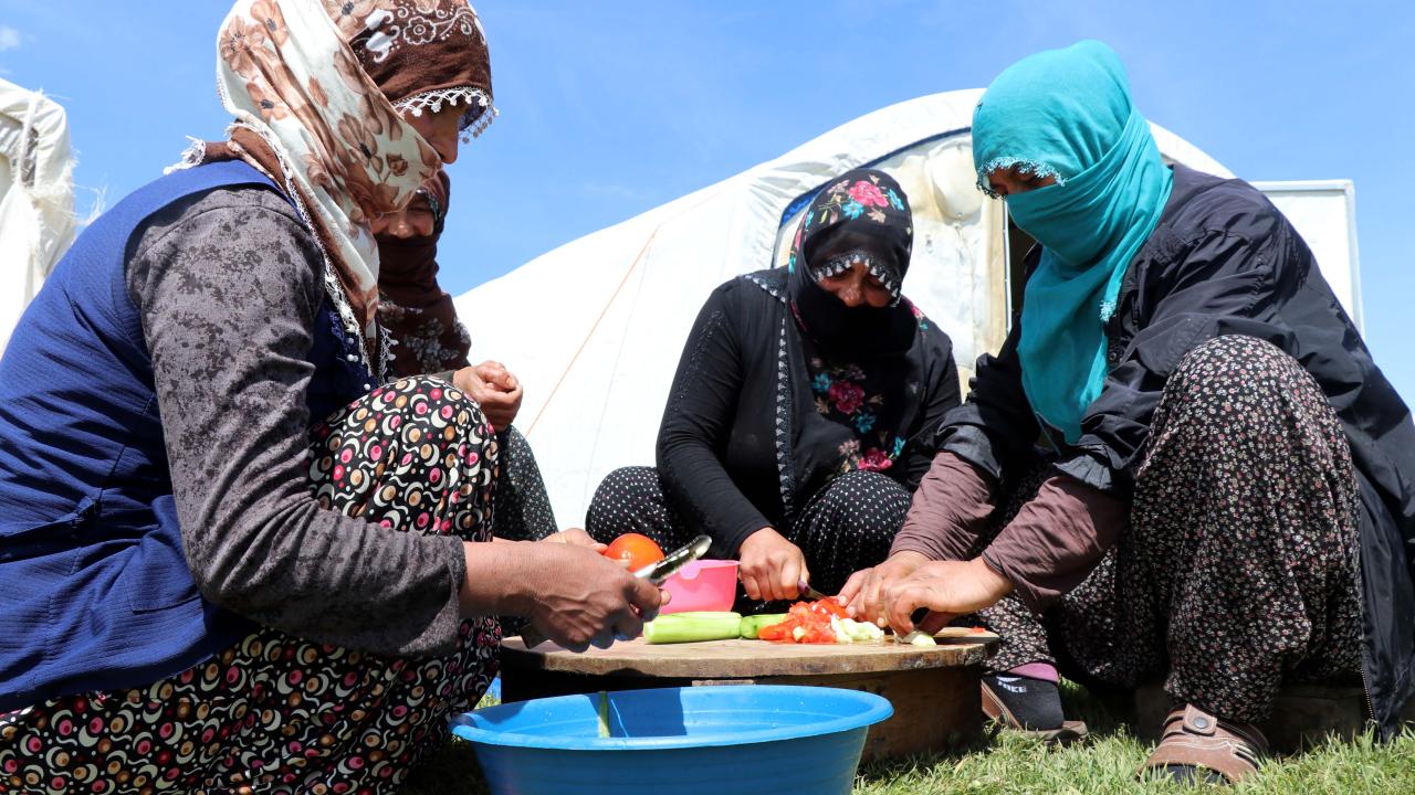 Eşlerine destek olmak, çocuklarına iyi bir gelecek sağlamak amacıyla bu zorlu yaşamı sürdüren kadın göçerlerin mesaisi günün ilk ışıklarıyla başlıyor.