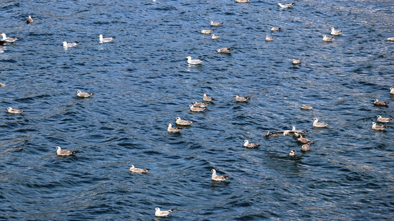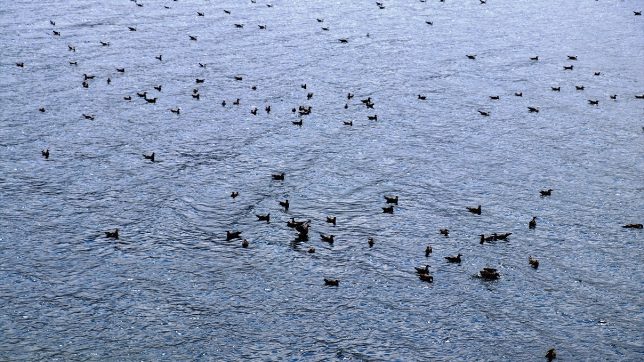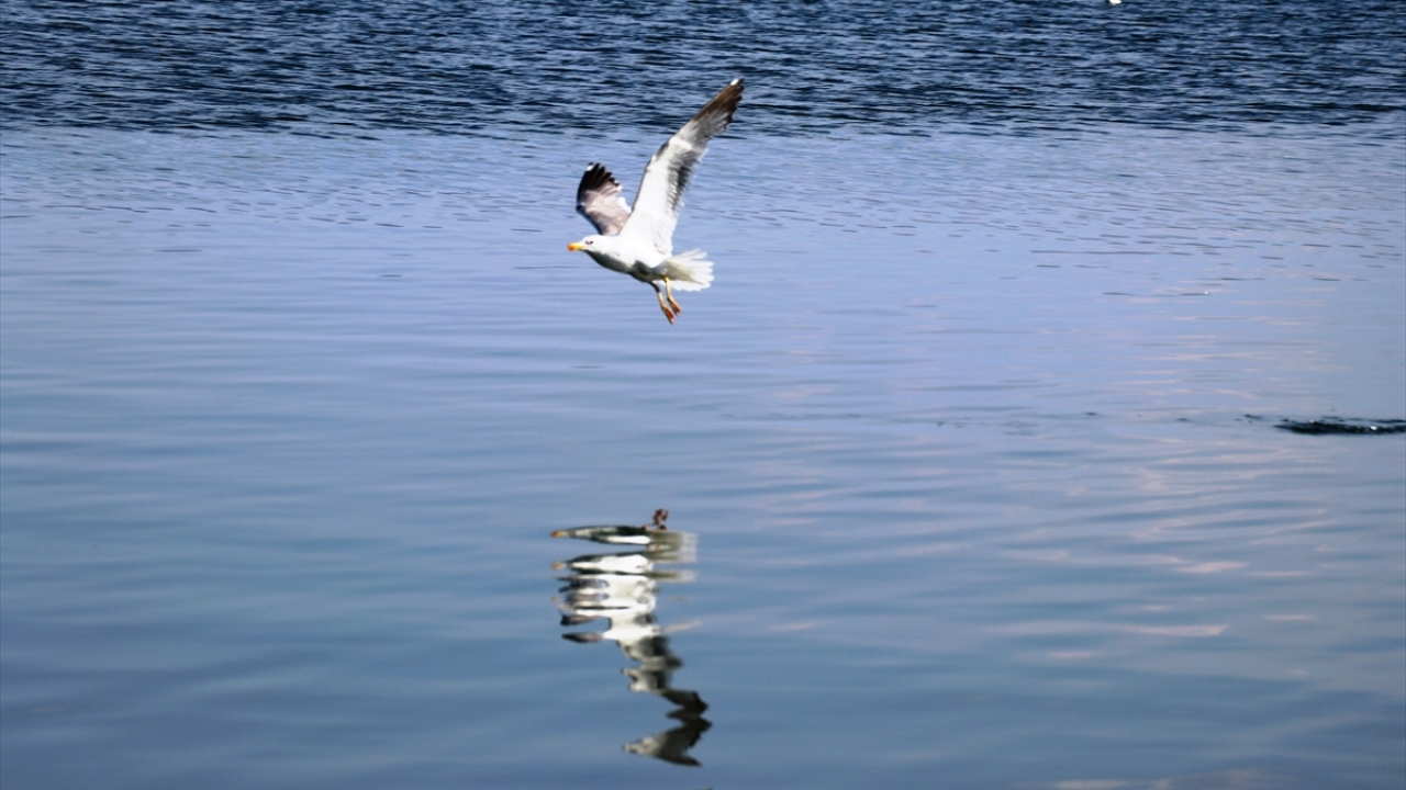 Toplu halde adaların üzerinde uçan göçmen kuşlar, yüksek sıcaklıklar nedeniyle zaman zaman göle girerek serinliyor.