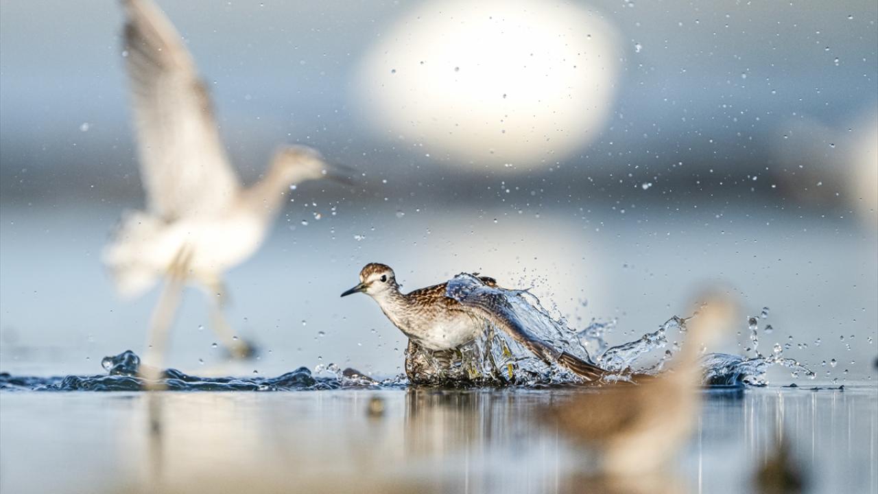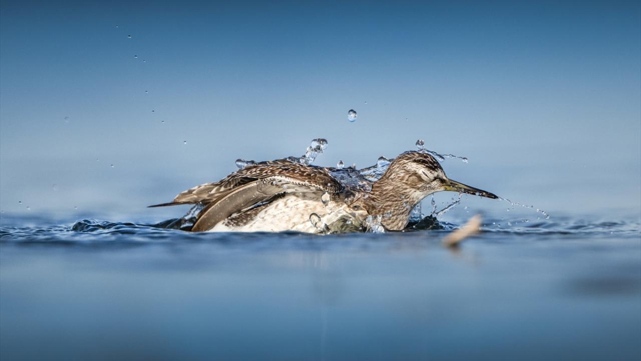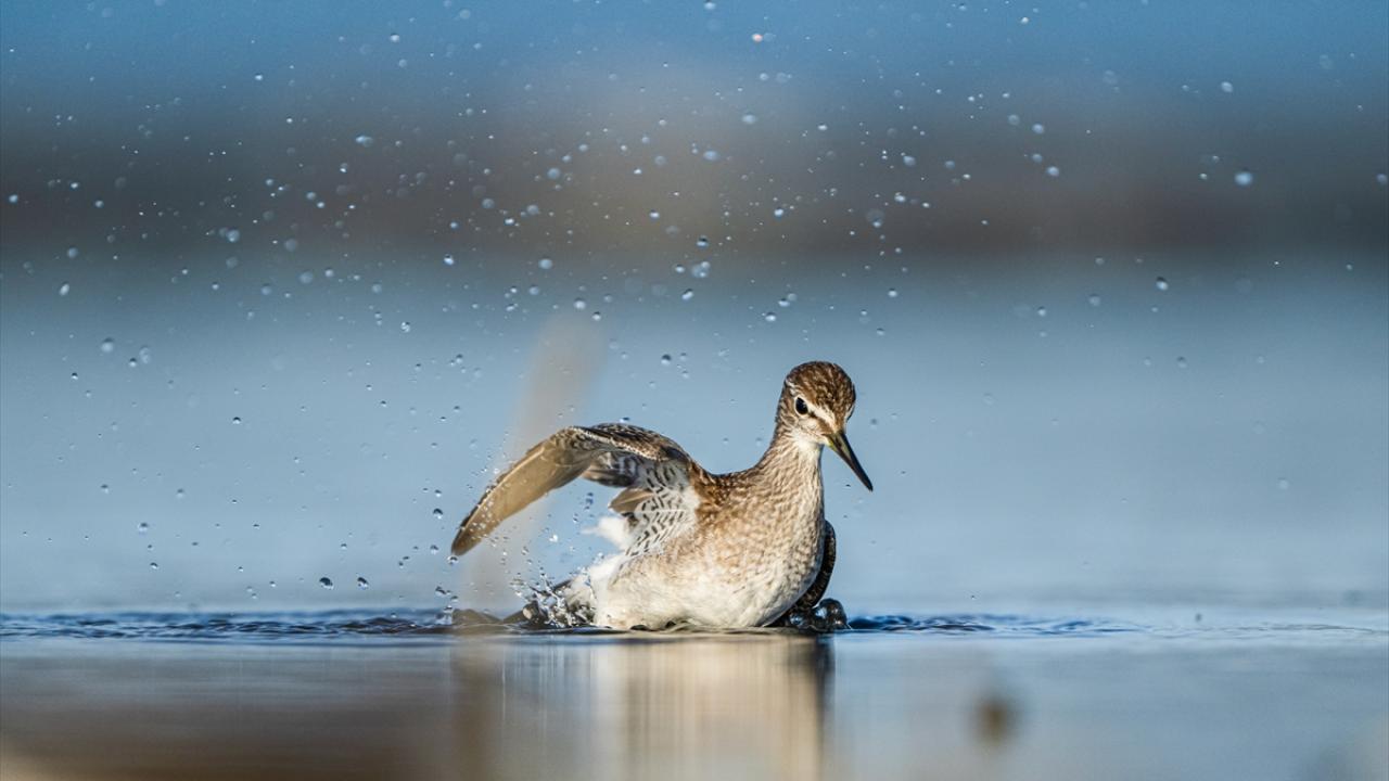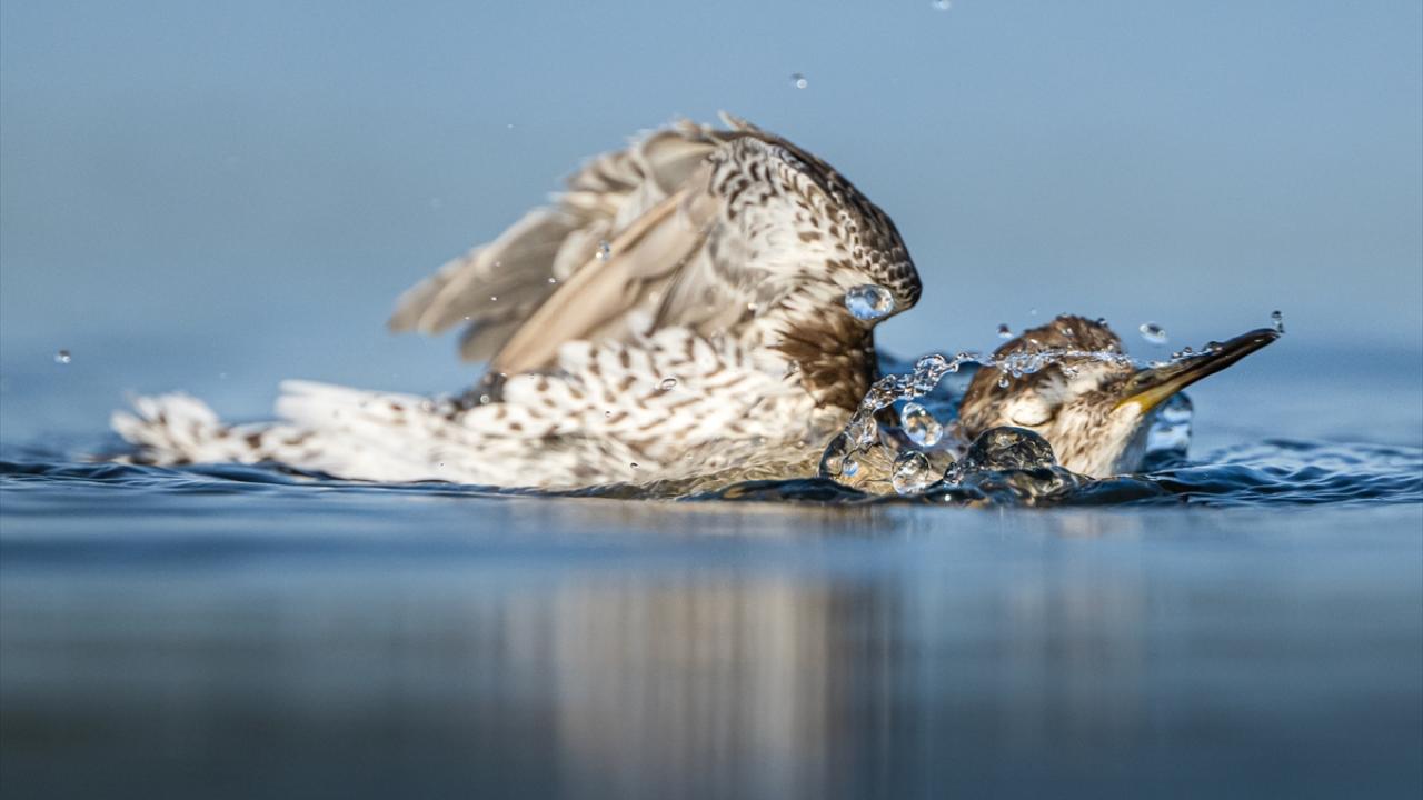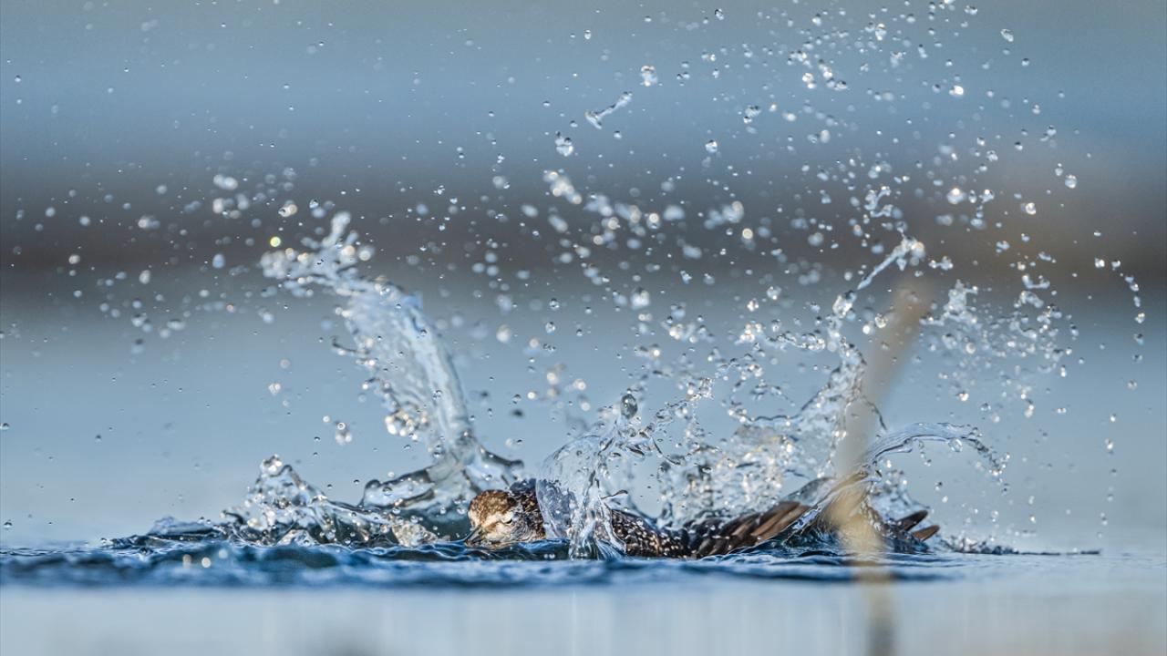 Sonbahar göçü sırasında Bursa’daki göl ve nehir kıyılarında mola veren göçmen kuşların, tüylerini temizlemek ve serinlemek için kıyı şeridinde toplanarak yaptıkları su banyoları dikkati çekti.