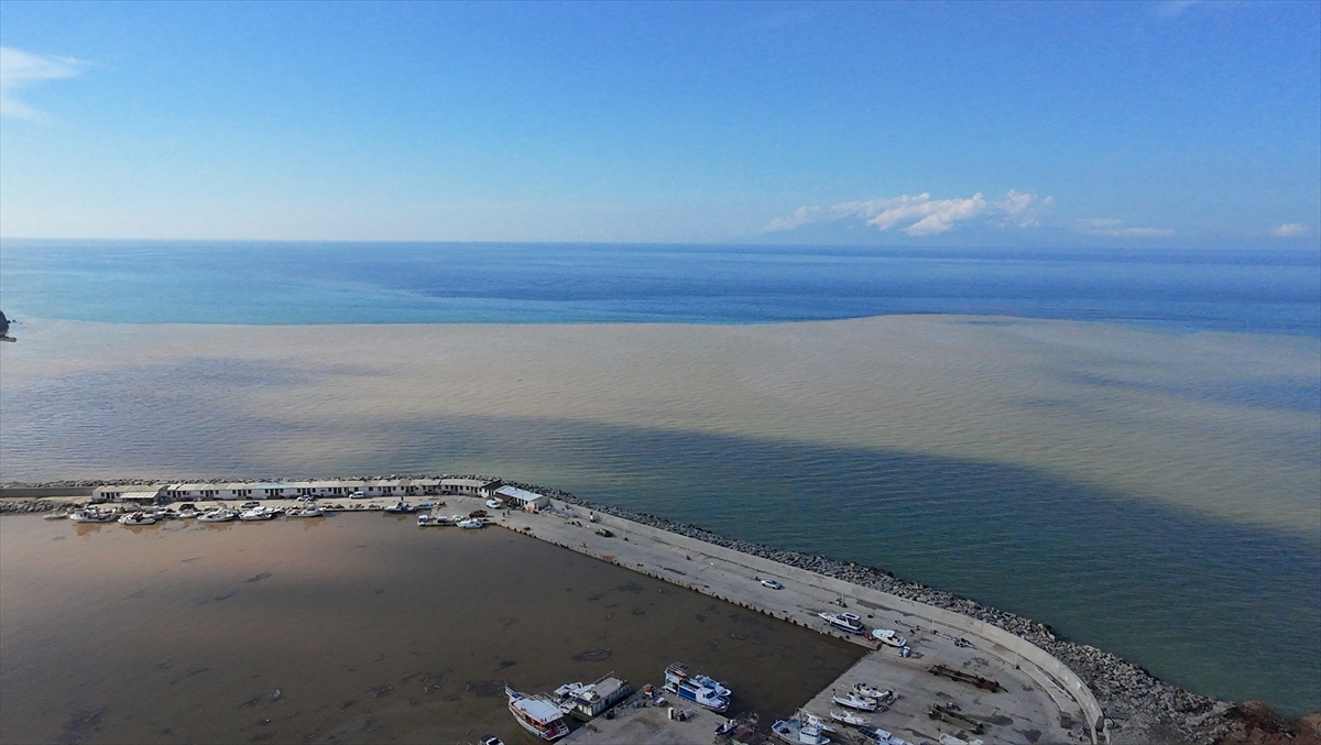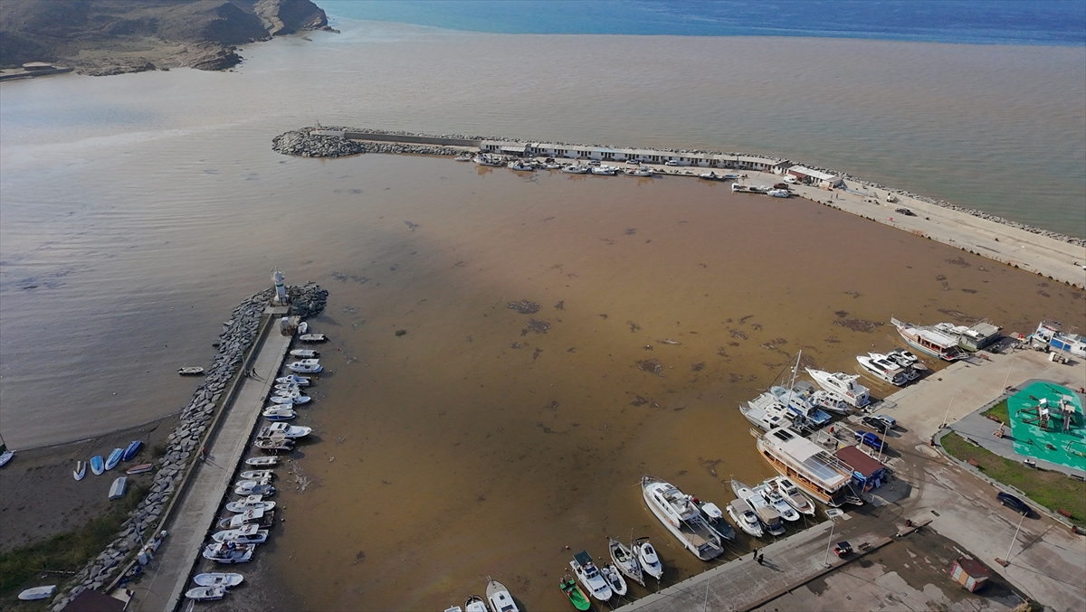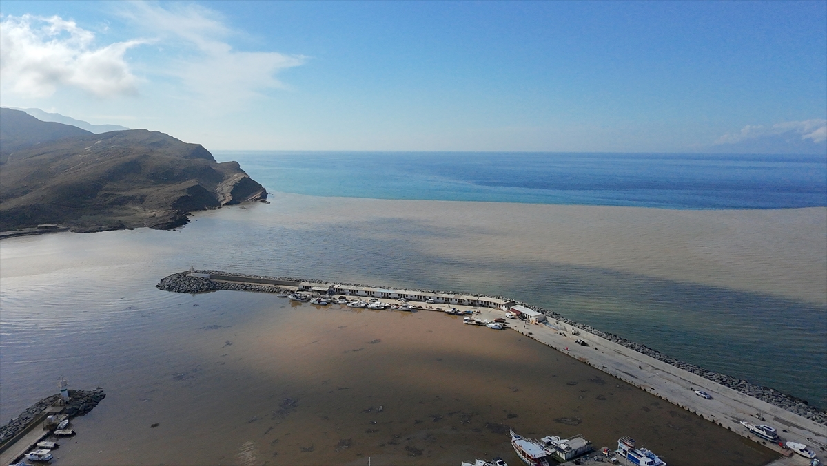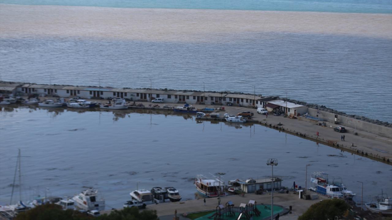 Çanakkale'nin Gökçeada ilçesinde gece yarısı başlayan kuvvetli sağanak nedeniyle oluşan yağmur suları ve çamur denizin rengini değiştirdi.