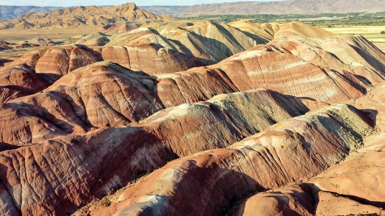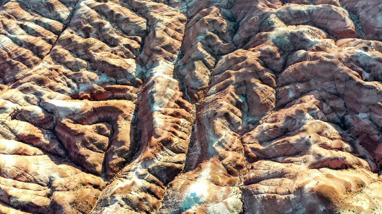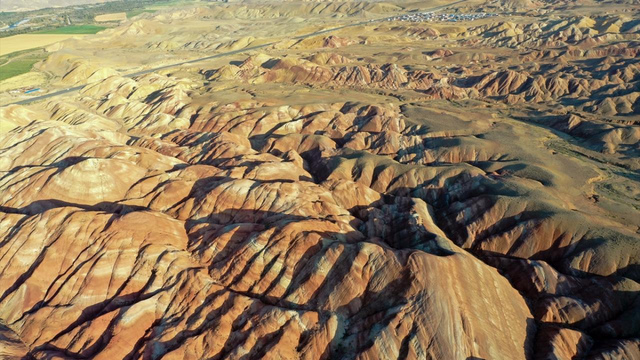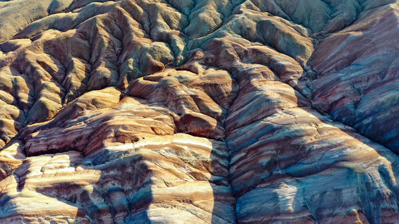 Iğdır'ın Tuzluca ilçesinde bulunan Gökkuşağı Tepeleri, farklı toprak yapılarını ve katmanlarını bir arada barındırması nedeniyle rengarenk görüntü sunuyor.