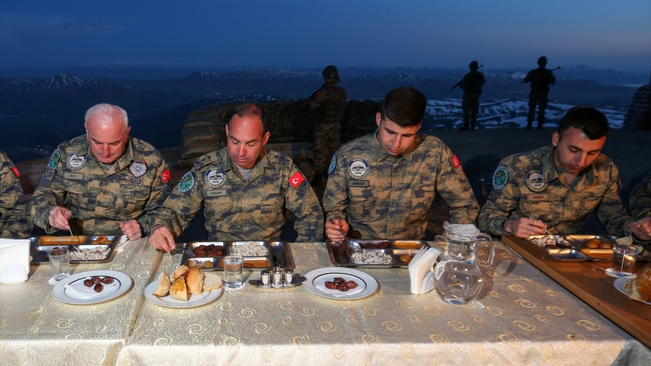 Bölgenin çatısı konumundaki zirvede hava tehditlerini önlemek için elleri tetikte nöbet tutan Mehmetçik, iftar saatinde bir araya geldikleri sofrada da oruçlarını nöbetleşe açıyor.