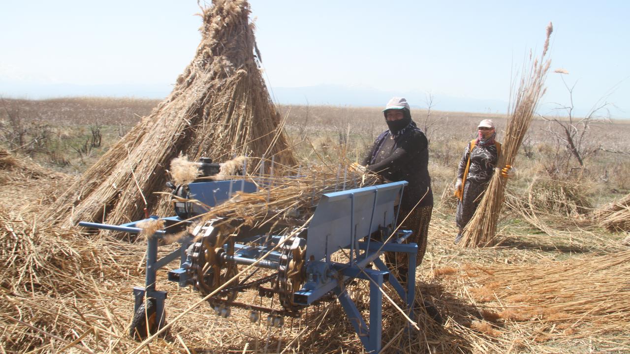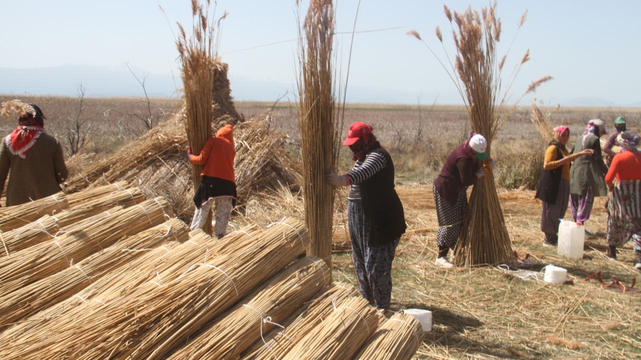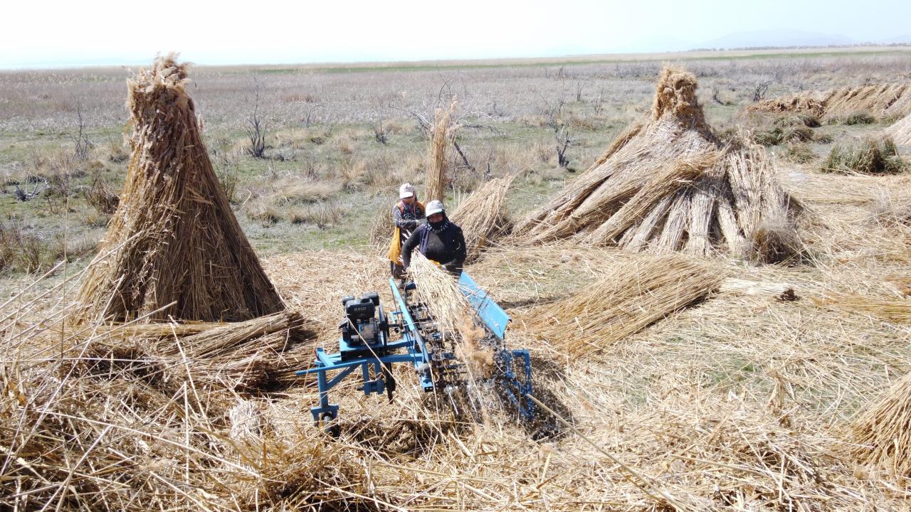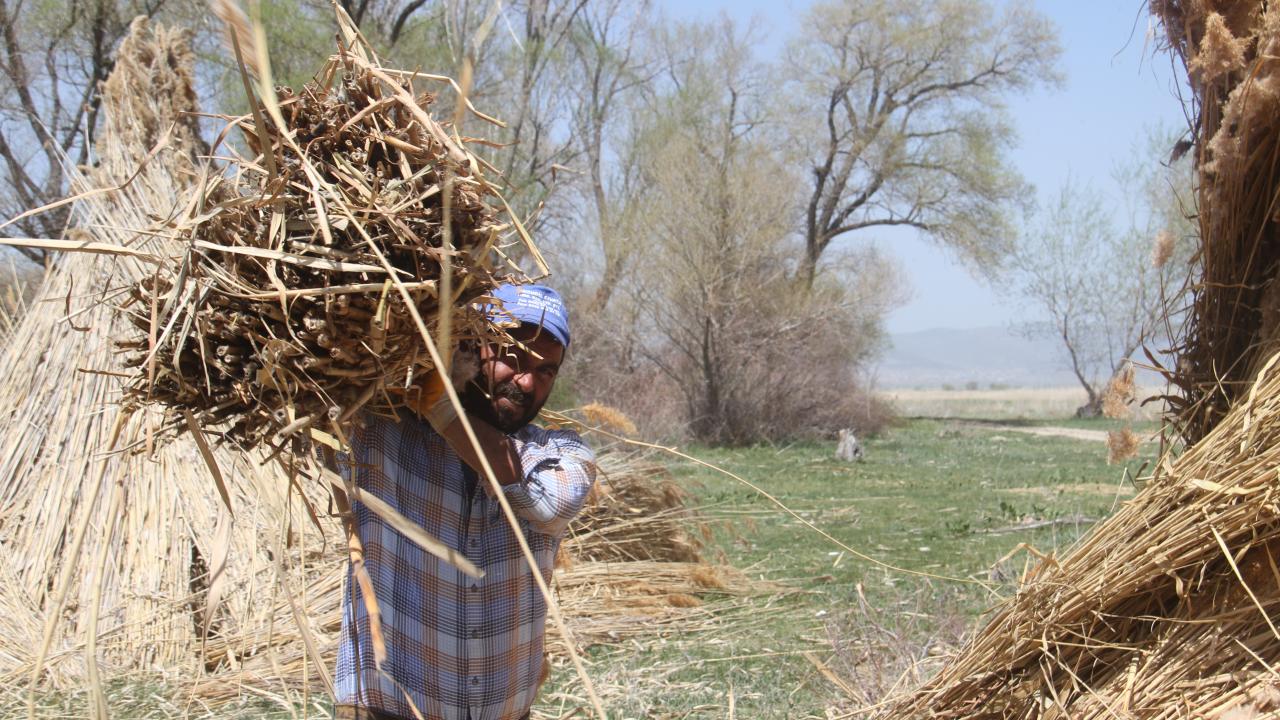 "Sezonumuz 12. ayın sonunda başlar. Özel izin istenirse ve coğrafya da uygunsa bu şubat başına kadar devam edebilir. Göl kıyısında orakla, elle hasat edip biçtiğimiz kamışları, kıyıda `hu` diye adlandırdığımız öbek haline getiriyoruz. Olgunlaşması için bunların üzerinden bir kış geçirmesini bekliyoruz. Bu şekilde yaprağını döküp kuruyor, renkleniyor. Olgunlaştıktan sonra ilkbaharda işlemeye başlıyoruz. Kamışların yaprağını, yabani otlarını, kalınlarını ayırmak suretiyle belli bir standart ölçüye getiriyoruz. Kelepçe dediğimiz malzemelerle de bağlıyoruz. Şu anda bu işte sadece depolarda çalışan kişi sayısı 60. Bunların yaptığı iş temizlik, balyalama ve getir götür çalışması."
