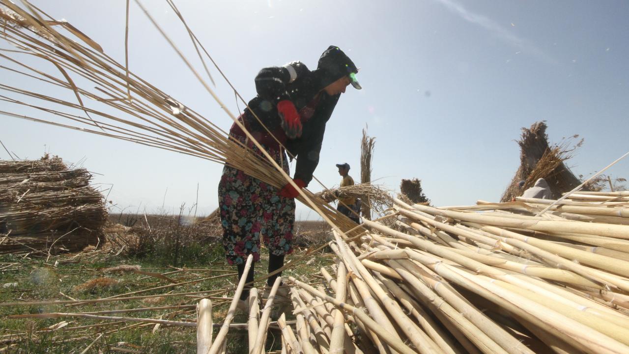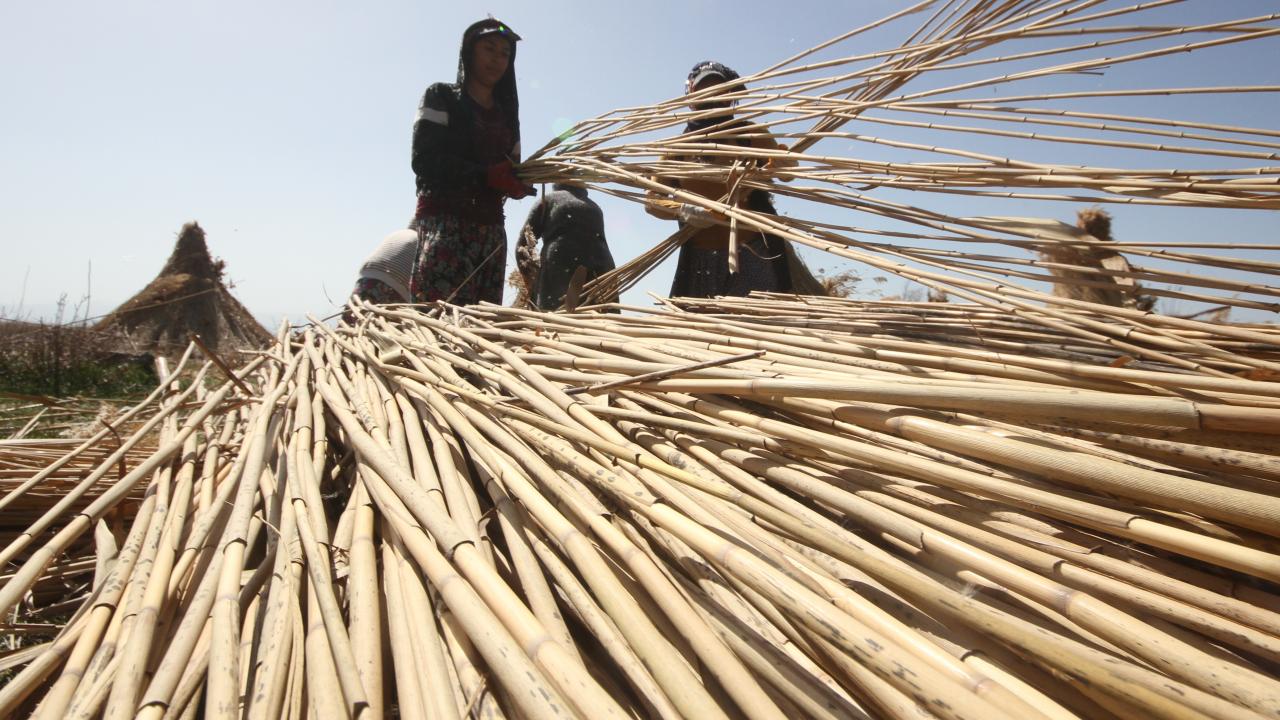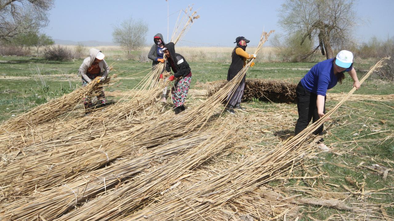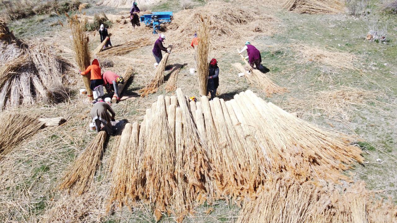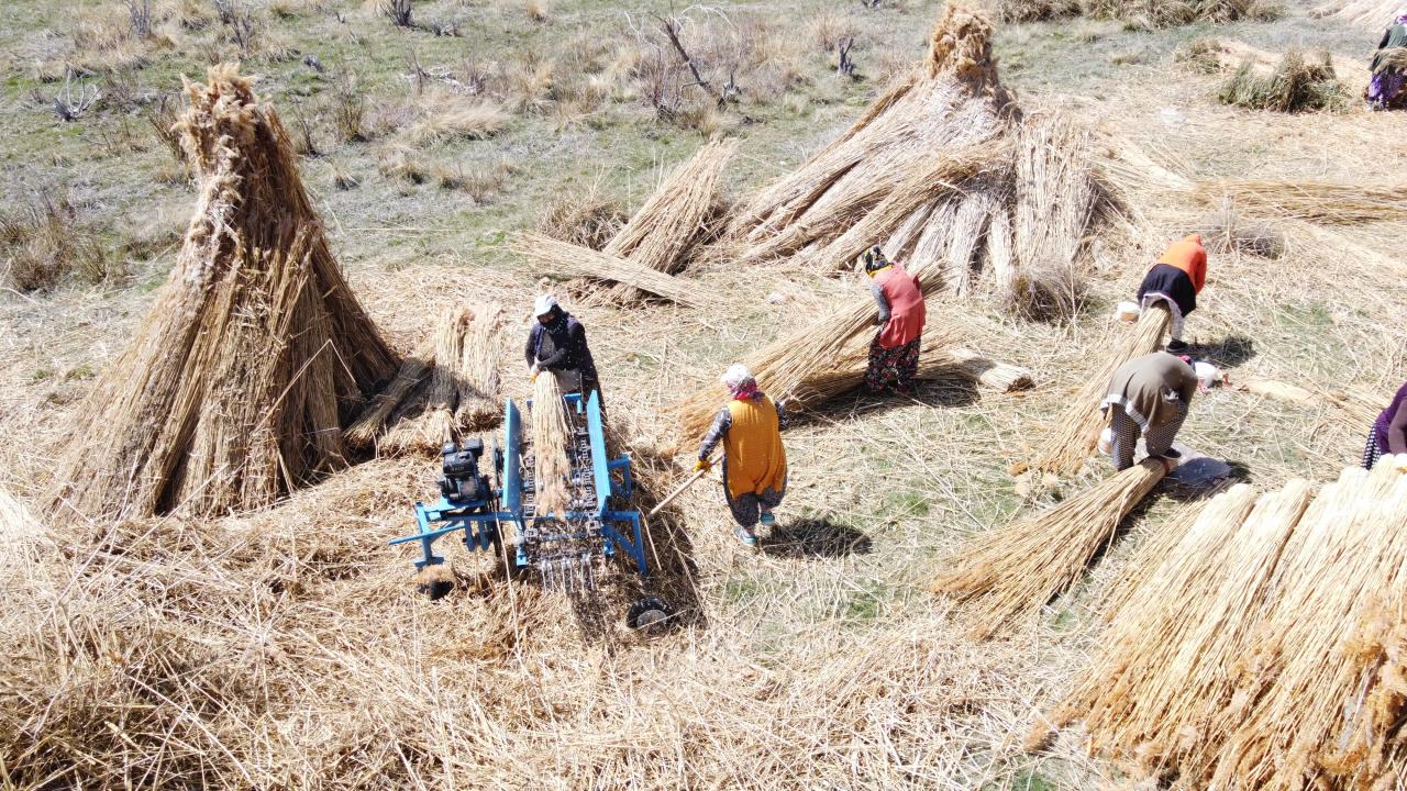 "Sezonumuz 12. ayın sonunda başlar. Özel izin istenirse ve coğrafya da uygunsa bu şubat başına kadar devam edebilir. Göl kıyısında orakla, elle hasat edip biçtiğimiz kamışları, kıyıda `hu` diye adlandırdığımız öbek haline getiriyoruz. Olgunlaşması için bunların üzerinden bir kış geçirmesini bekliyoruz. Bu şekilde yaprağını döküp kuruyor, renkleniyor. Olgunlaştıktan sonra ilkbaharda işlemeye başlıyoruz. Kamışların yaprağını, yabani otlarını, kalınlarını ayırmak suretiyle belli bir standart ölçüye getiriyoruz. Kelepçe dediğimiz malzemelerle de bağlıyoruz. Şu anda bu işte sadece depolarda çalışan kişi sayısı 60. Bunların yaptığı iş temizlik, balyalama ve getir götür çalışması."