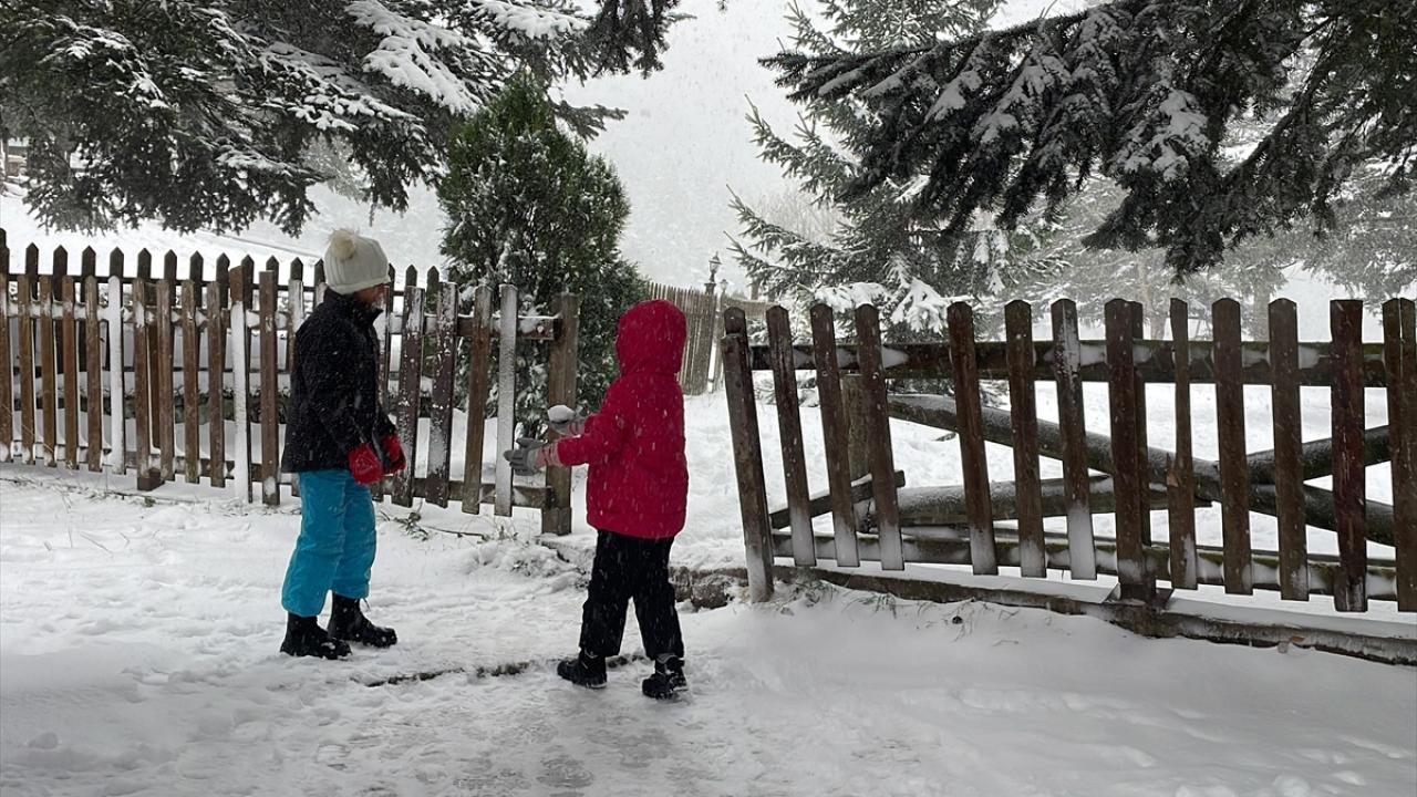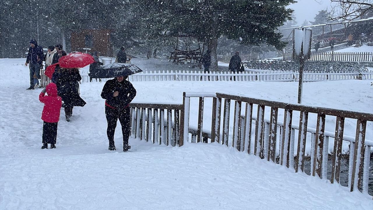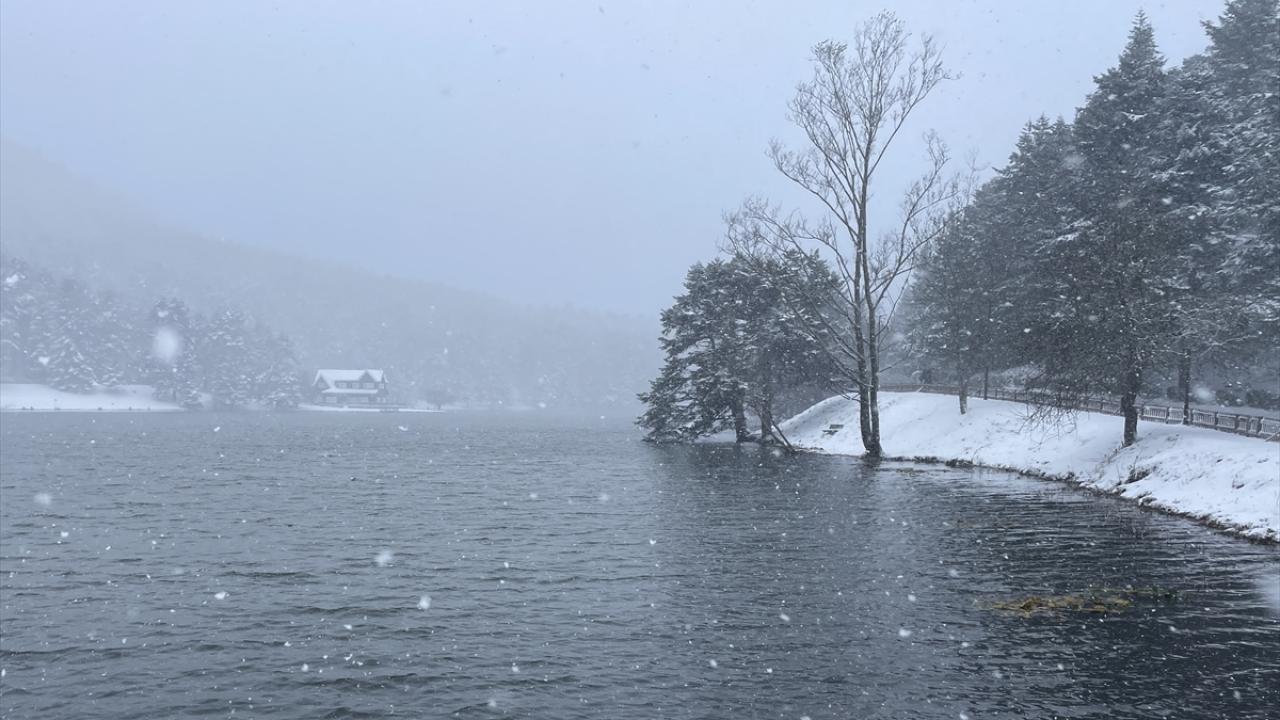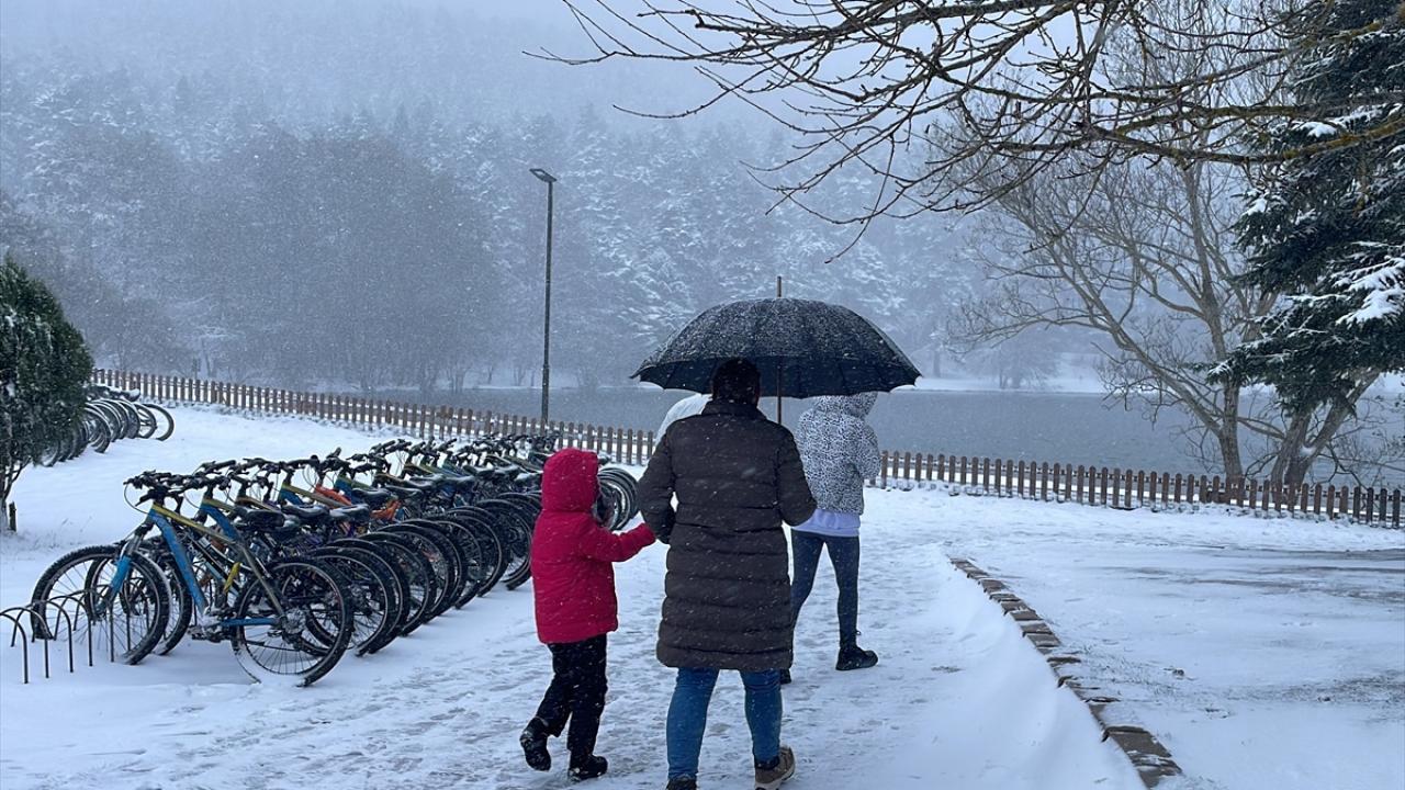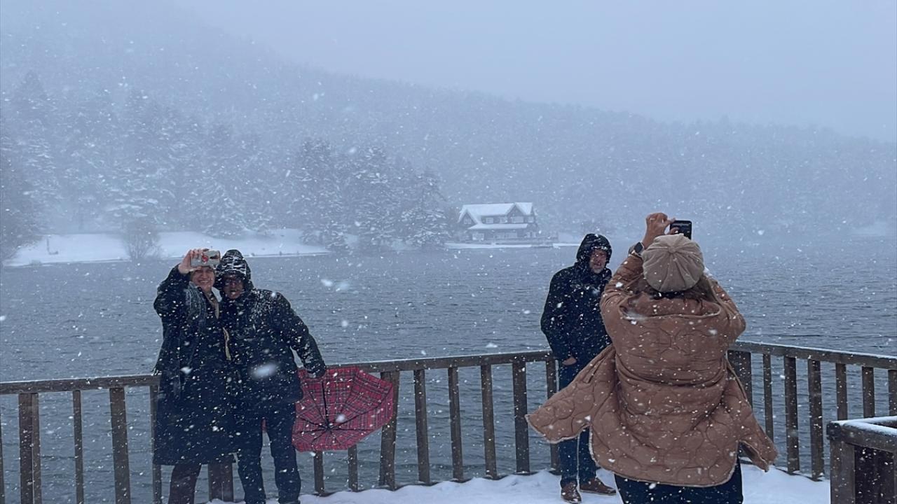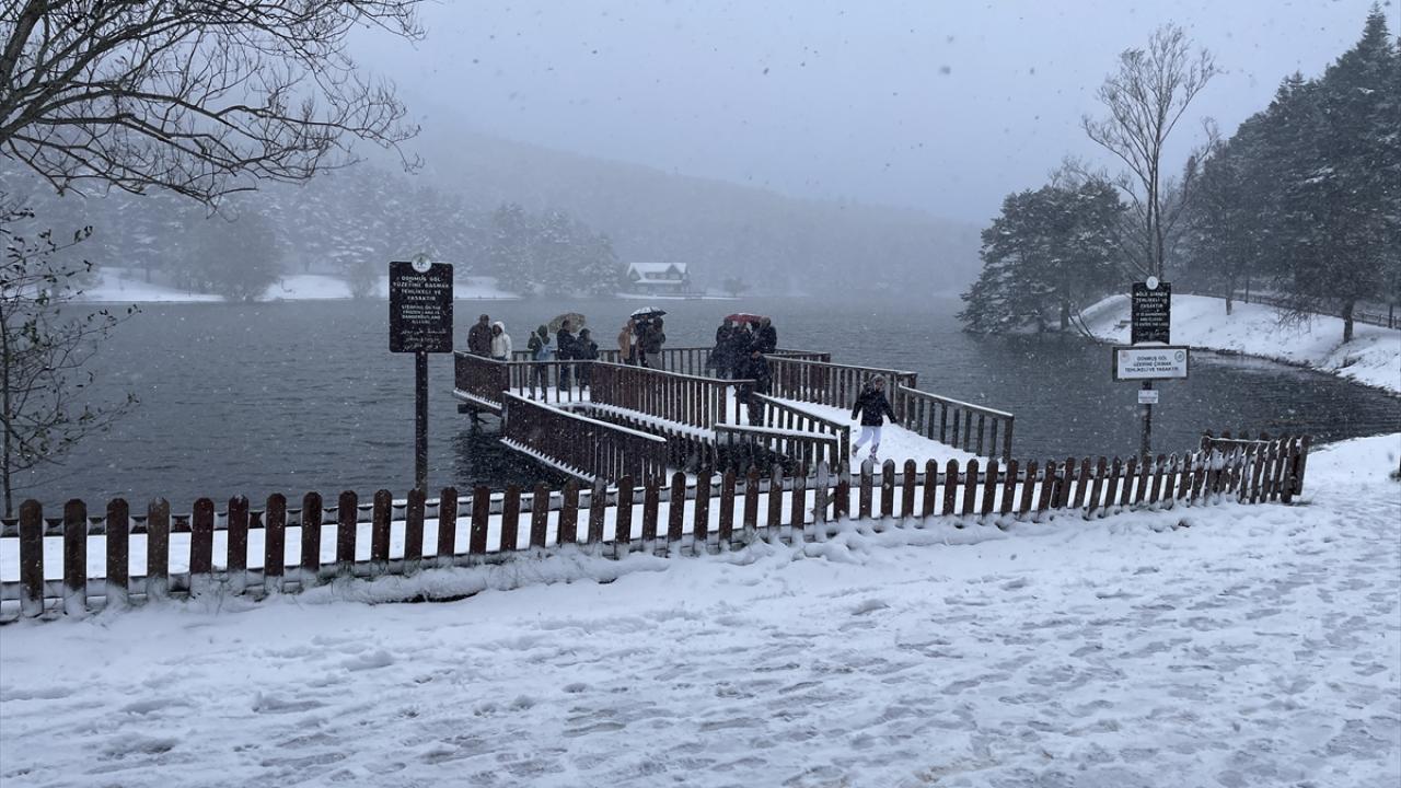 Bolu'daki Gölcük Tabiat Parkı'nda kar yağışı etkisini sürdürüyor. Parka gelen tatilciler, yağış altında yürüyüş yaptı, hatıra fotoğrafı çekti. Bazı vatandaşlar da göl kenarındaki iskeleden manzarayı izledi.