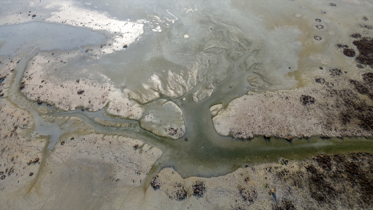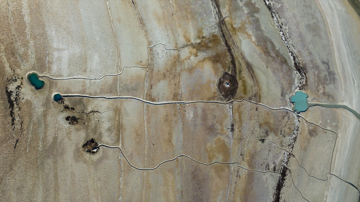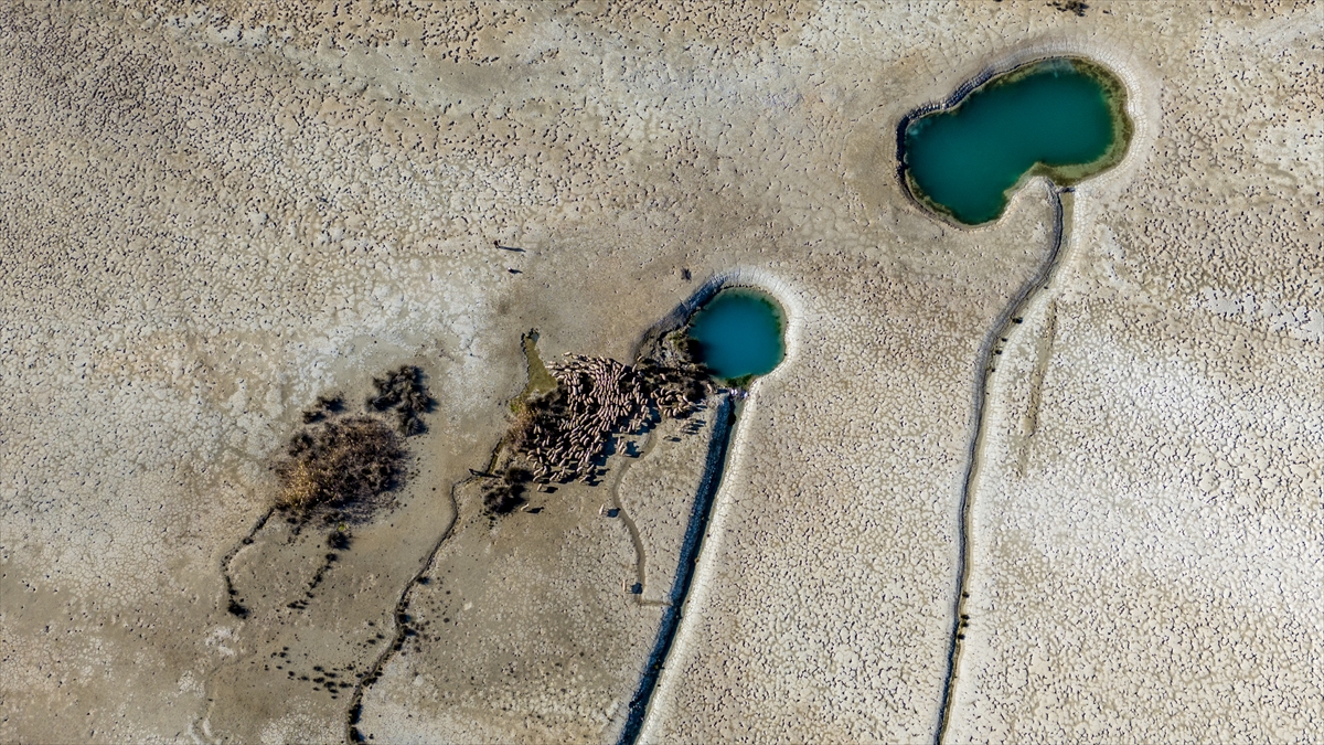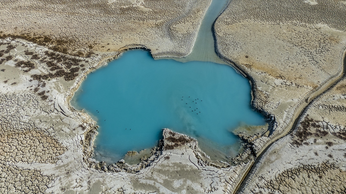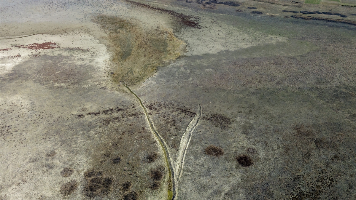 Suların çekildiği alanlarda oluşan çatlaklar kuraklığın boyutlarını gözler önüne sererken bazı bölgelerde derinlik farkı nedeniyle oluşan küçük göletler ve akarsuyu andıran su yolları dikkati çekiyor.