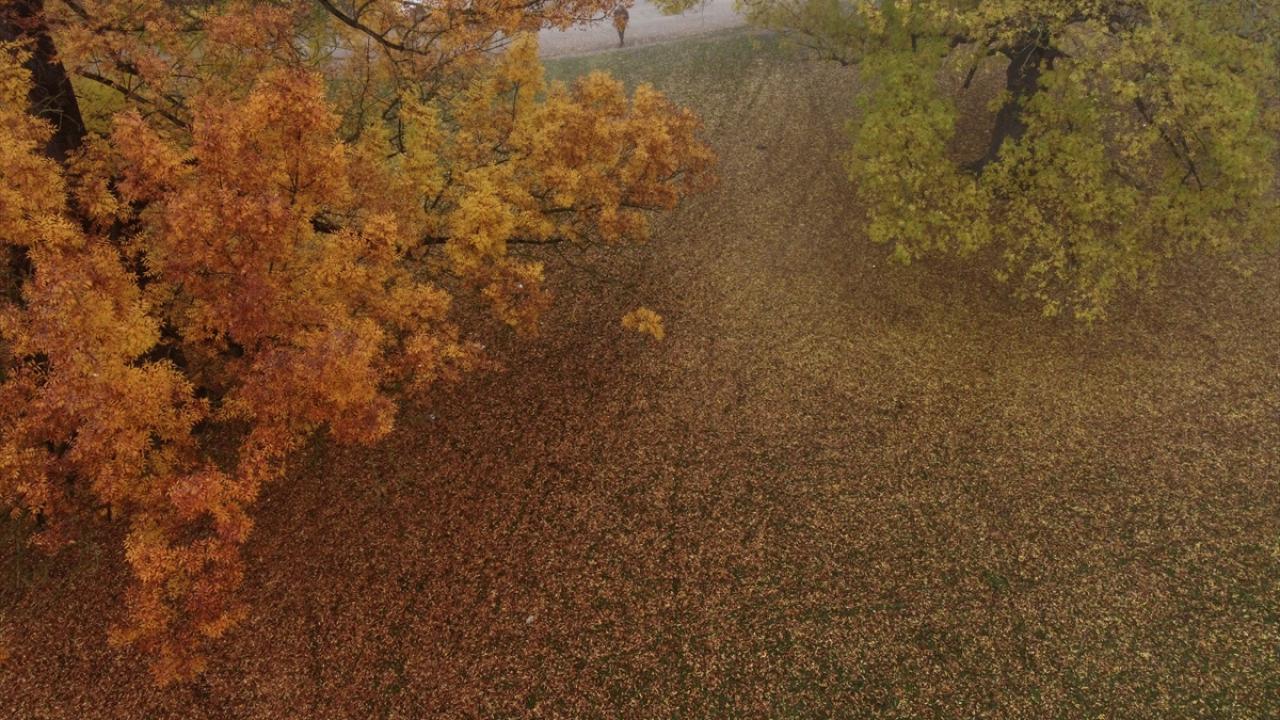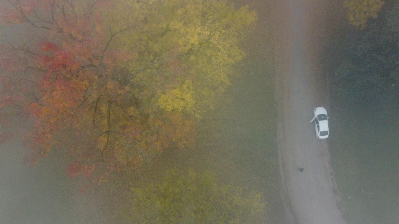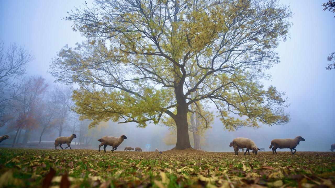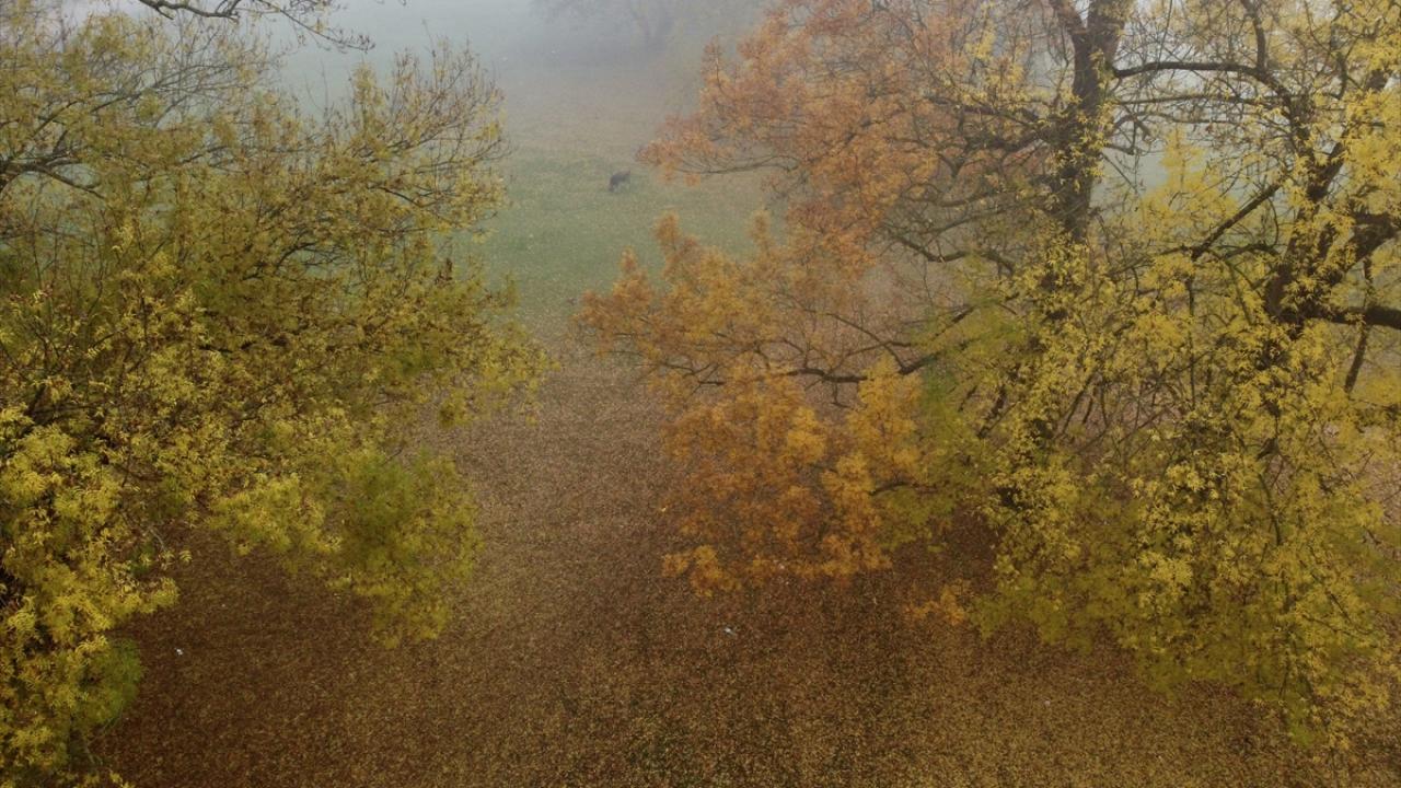 Her mevsim ziyaretçilerine ayrı güzellik sunan Gölyaka Kültür Park`taki çınar ağaçları, sonbahar renkleriyle sis altında etkileyici görünüme büründü.