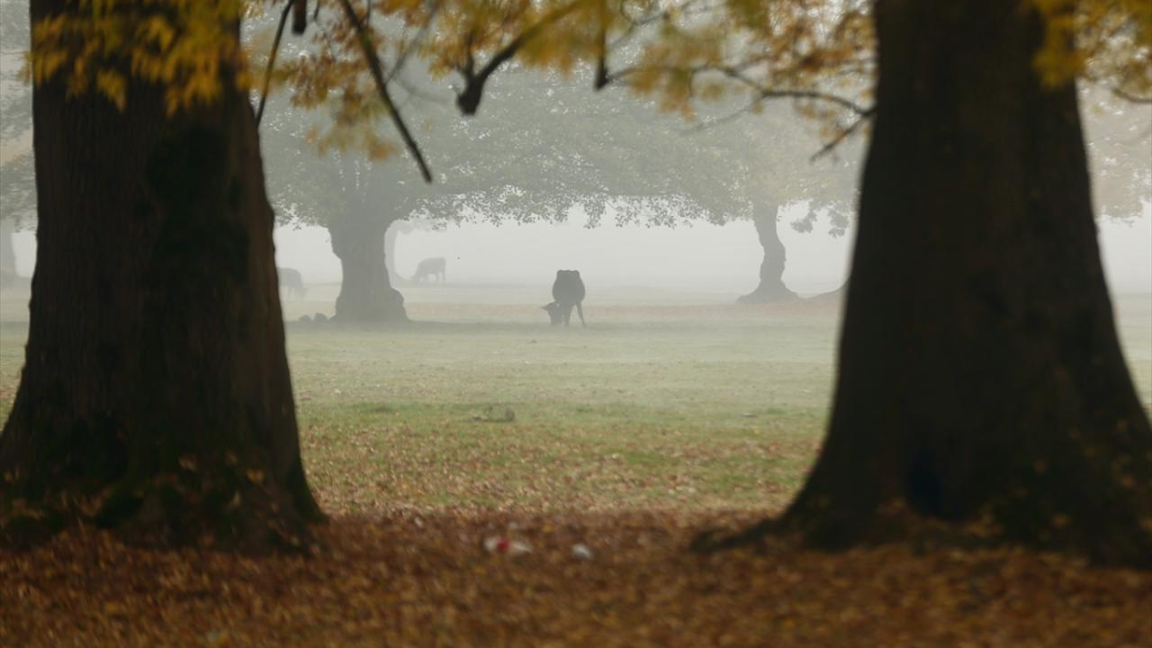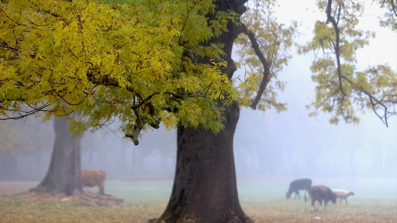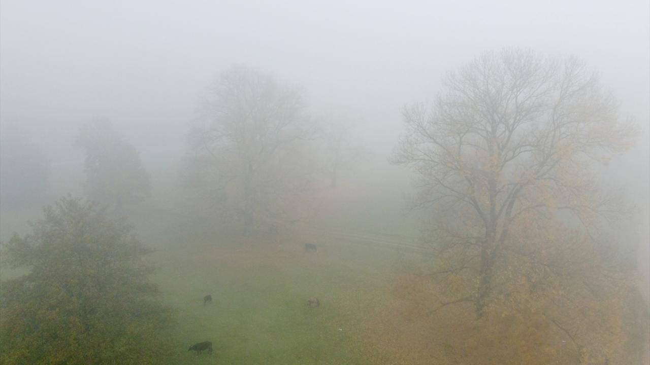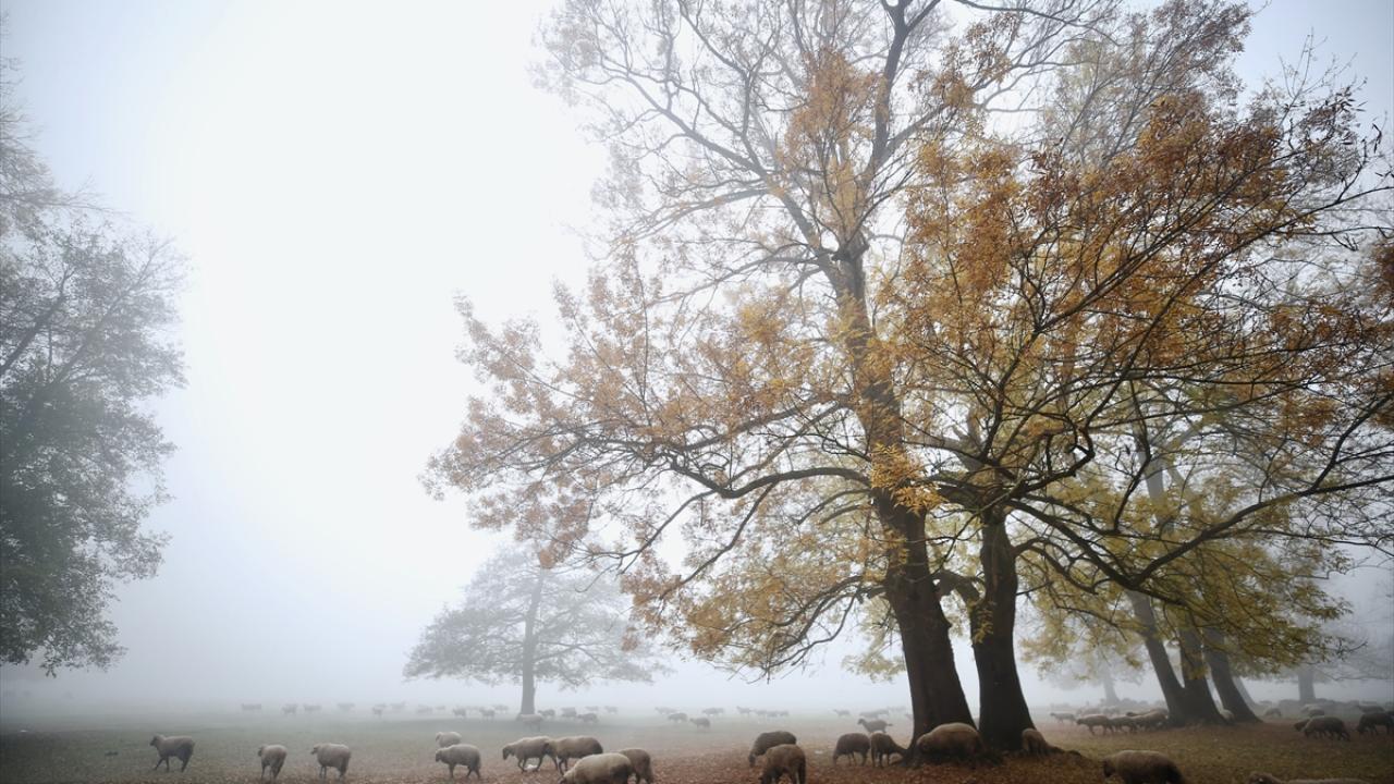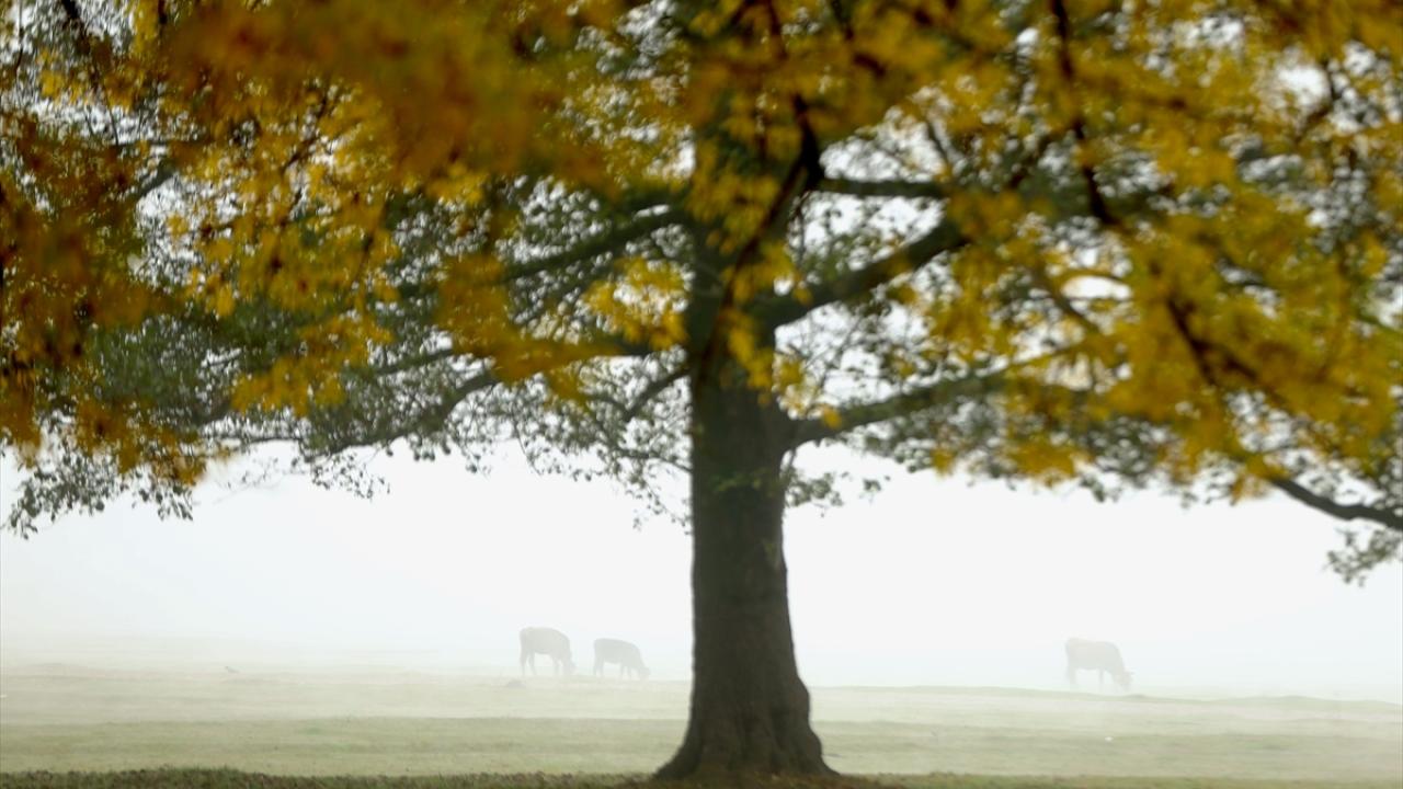 Her mevsim ziyaretçilerine ayrı güzellik sunan Gölyaka Kültür Park`taki çınar ağaçları, sonbahar renkleriyle sis altında etkileyici görünüme büründü.