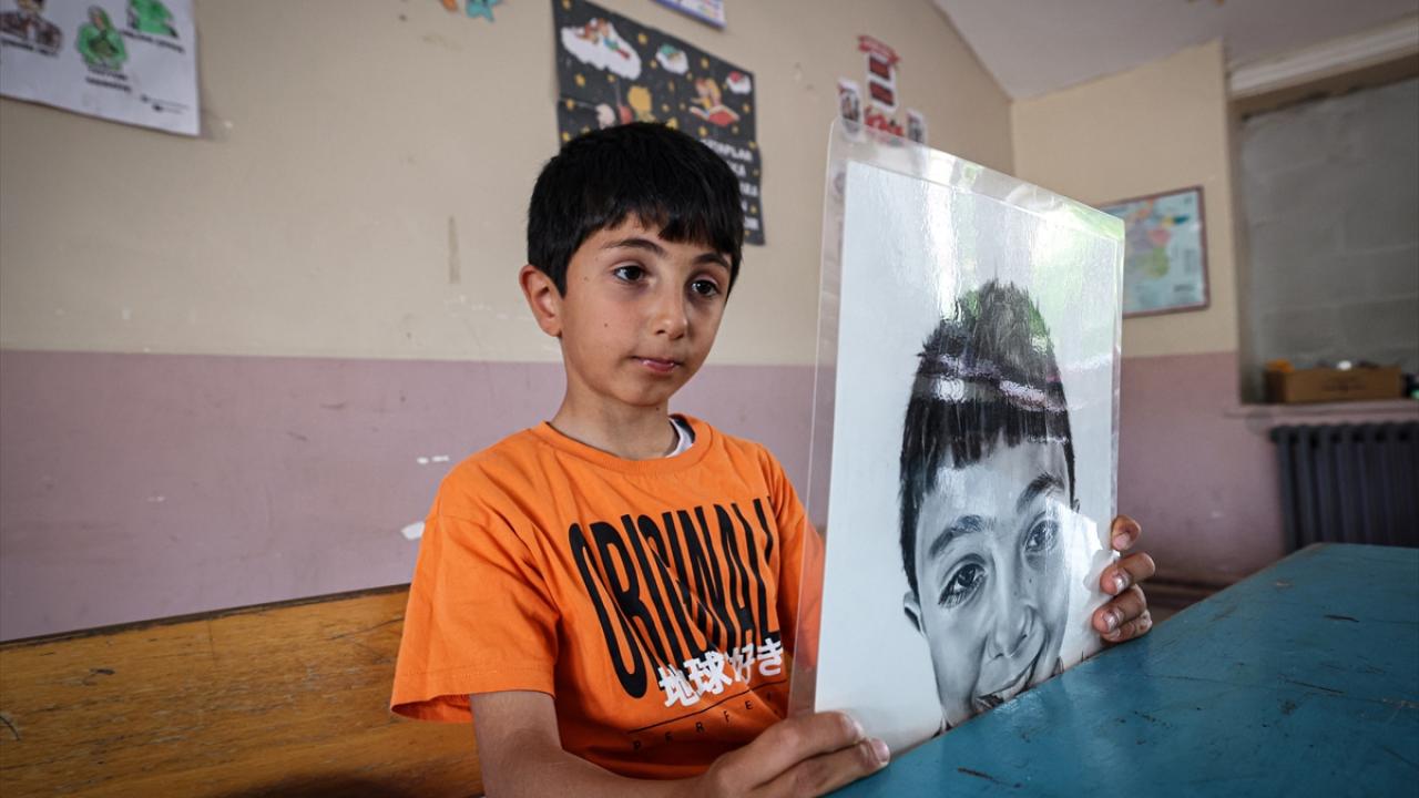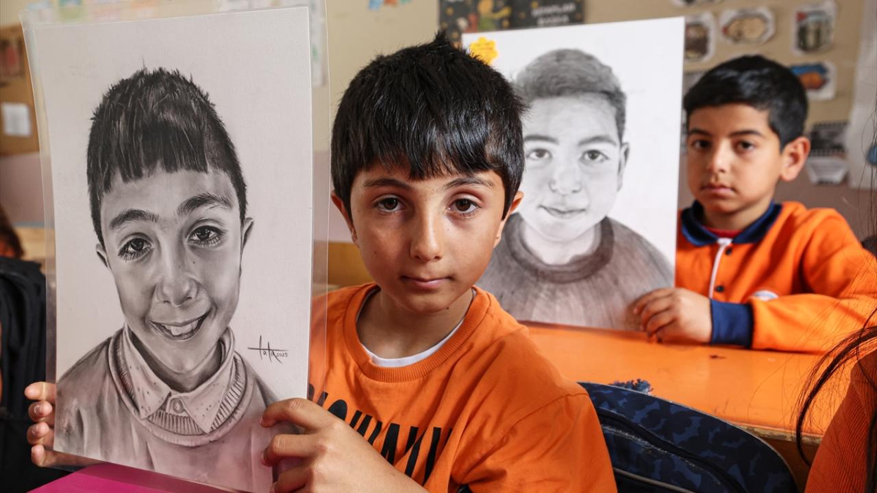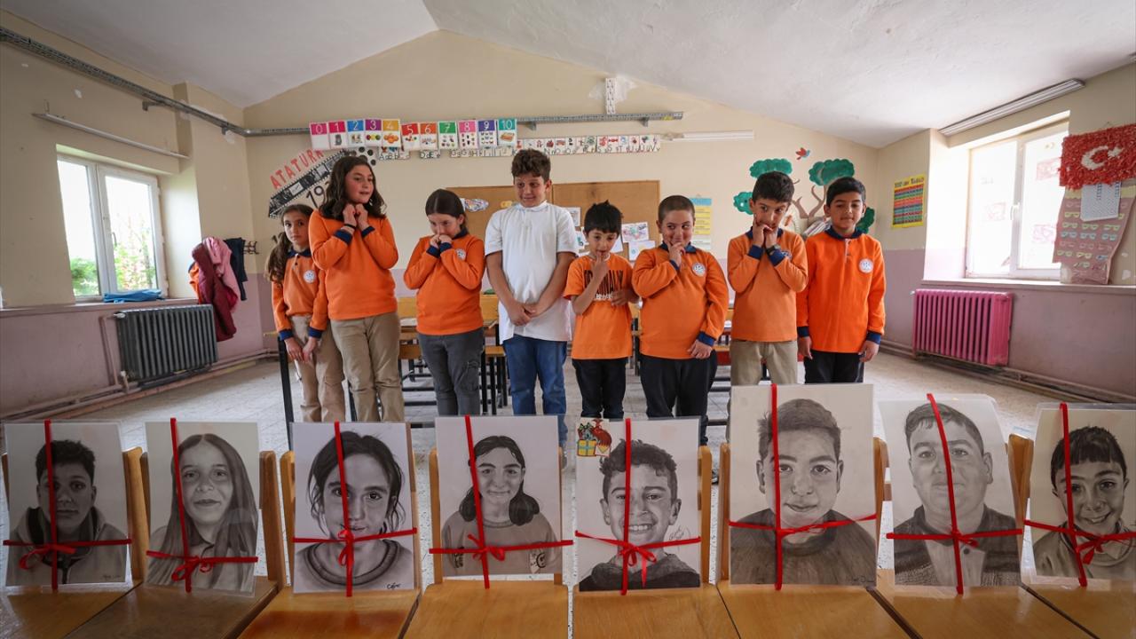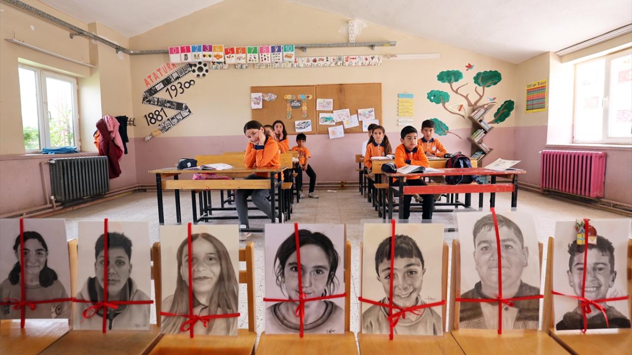 Gönüllü ressamlar, köy okulundaki öğrencilerin portrelerini karakalemle ölümsüzleştirdi