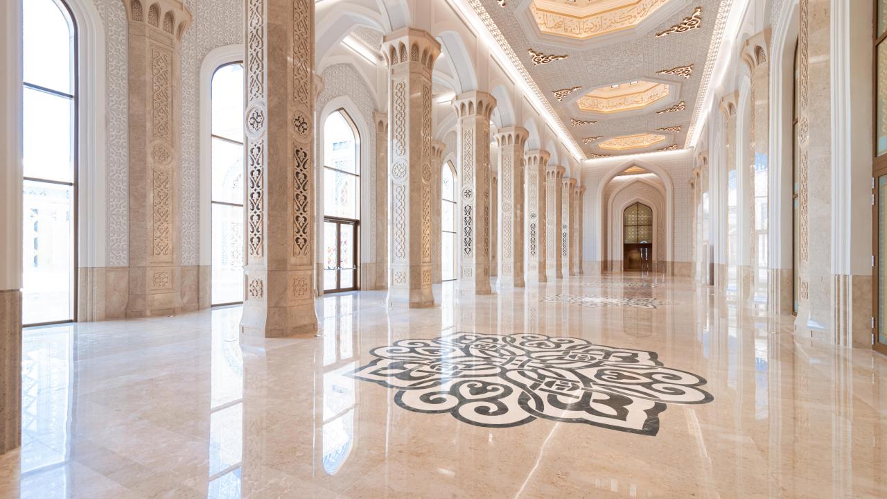 Ana müteahhitliğini Sembol İnşaat’ın üstlendiği bu proje, doğal taş mermer, altın varak, özel kristal, vitray cam, çini ve cam mozaik gibi doğal malzemeler kullanılarak hayata geçirildi. Mavi kubbelerin ferahlığının görkemli bir mimariyle birleştiği cami, Türkiye, Arap ülkeleri, İtalya, Almanya ve dünyanın diğer bölgelerinden uzmanlar ile birlikte Rixos Hotels & Sembol İnşaat Yönetim Kurulu Başkanı Fettah Tamince tarafından özenle çalışıldı.
