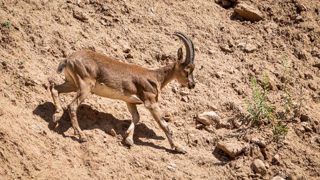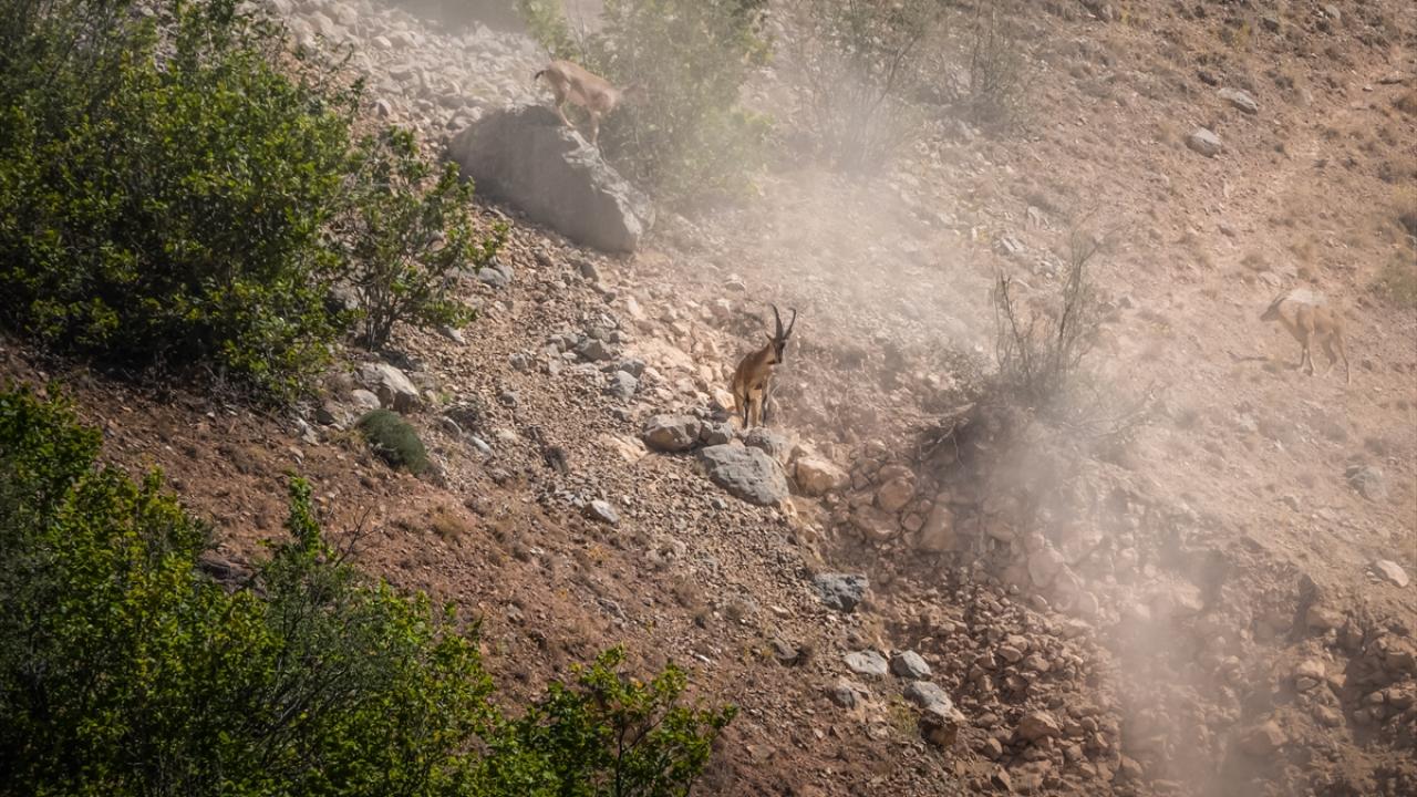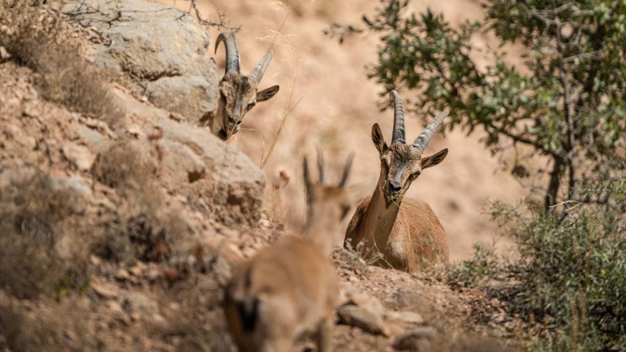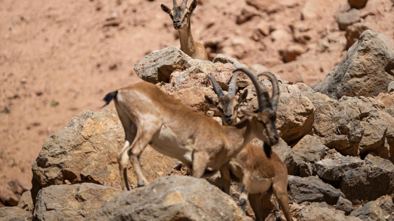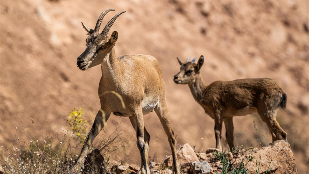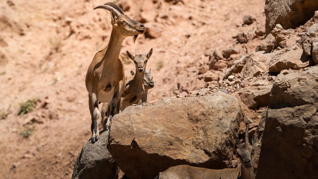 Zorlu arazi koşullarında beslenen ve zaman zaman yüksek kayalıklara tırmanan yaban keçileri, sürünün olgun üyeleri ve ilk kışını yaşayacak oğlaklarıyla yoluna devam ediyor.