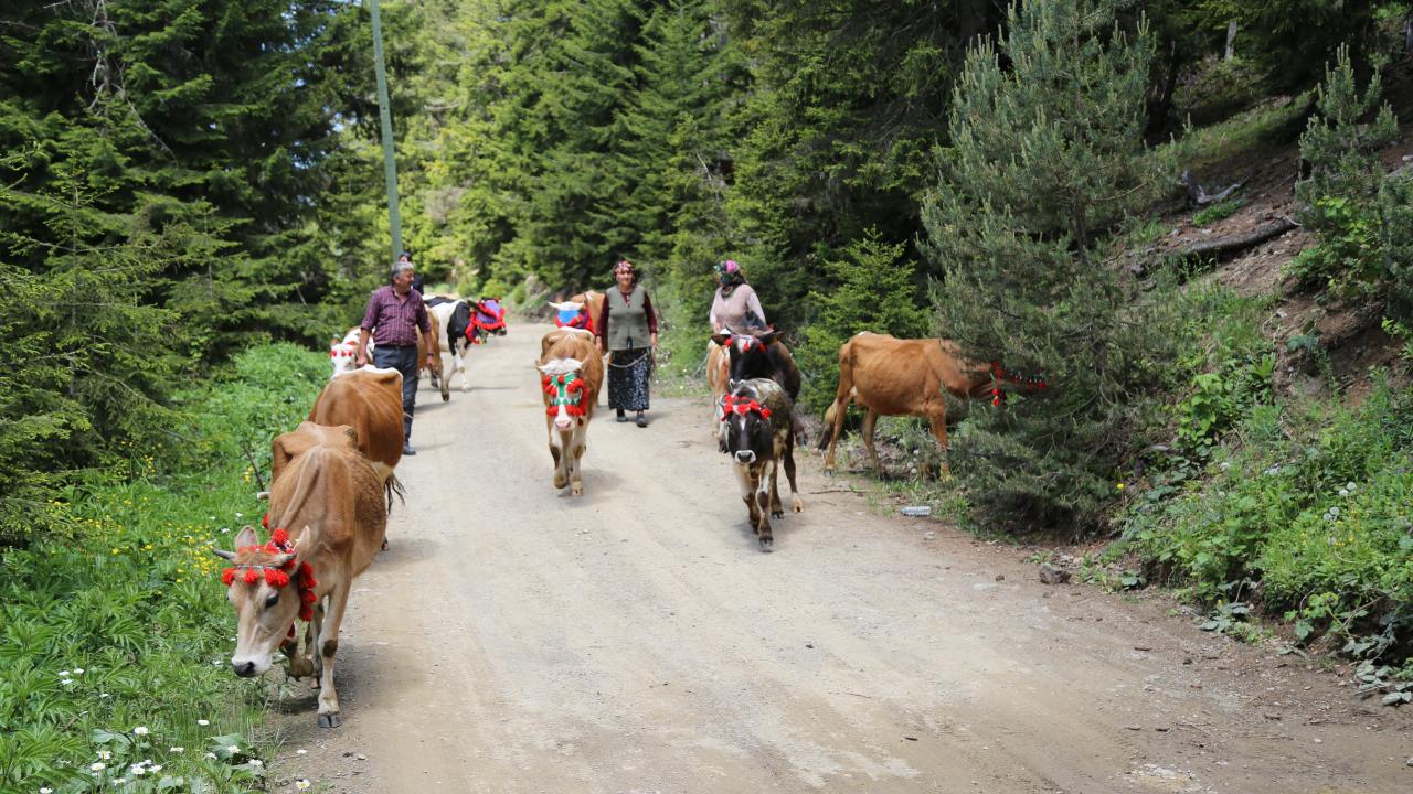Yayla göçü öncesi büyük ve küçükbaş hayvanlarını boncuklu ve püsküllü iplerle süsleyen yaylacılar, Alaçam Yaylası’na uzanan 20 kilometrelik yolu hayvanlarıyla birlikte yürüyerek kat ediyor.