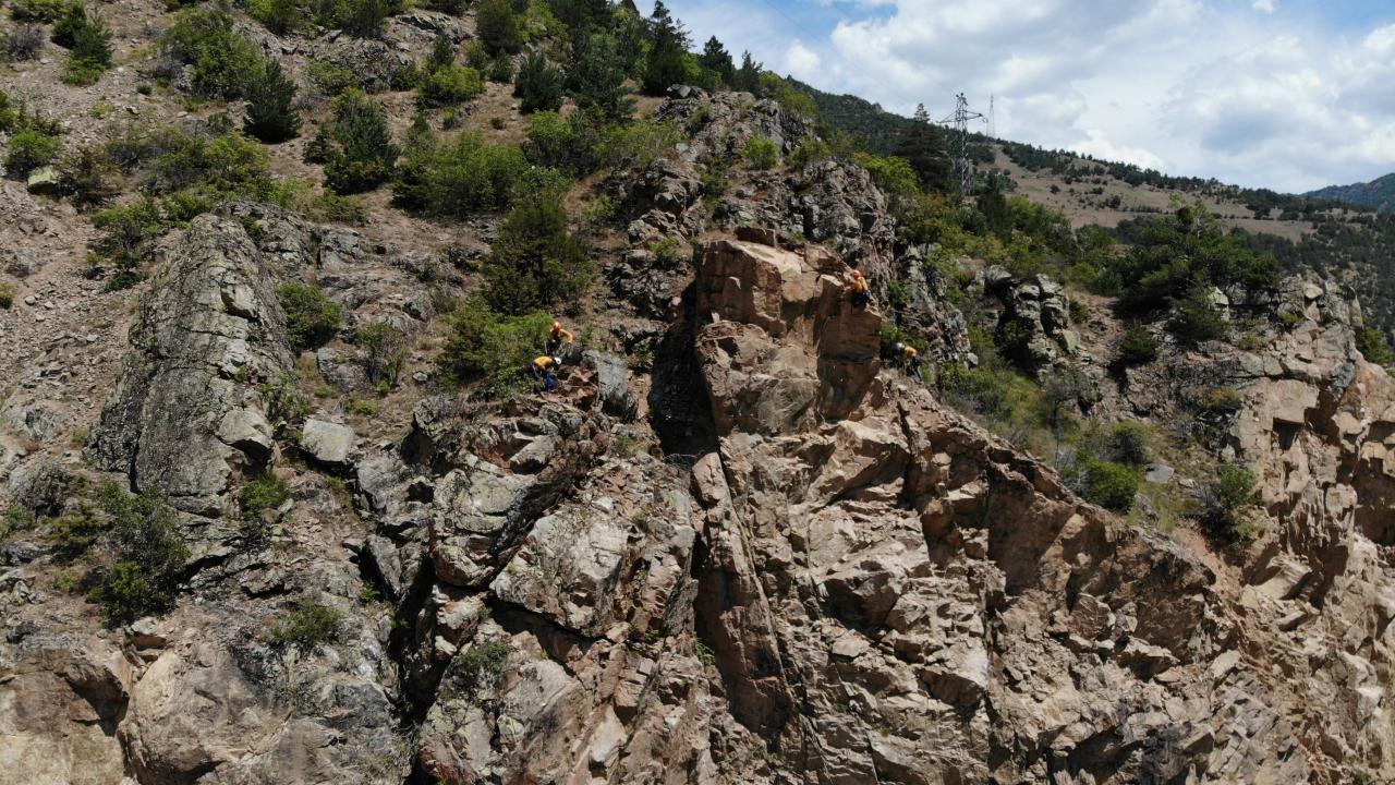 Gümüşhane’de yol kenarında felakete davetiye çıkaran devasa kayalar dağcılar tarafından düşürülüyor
