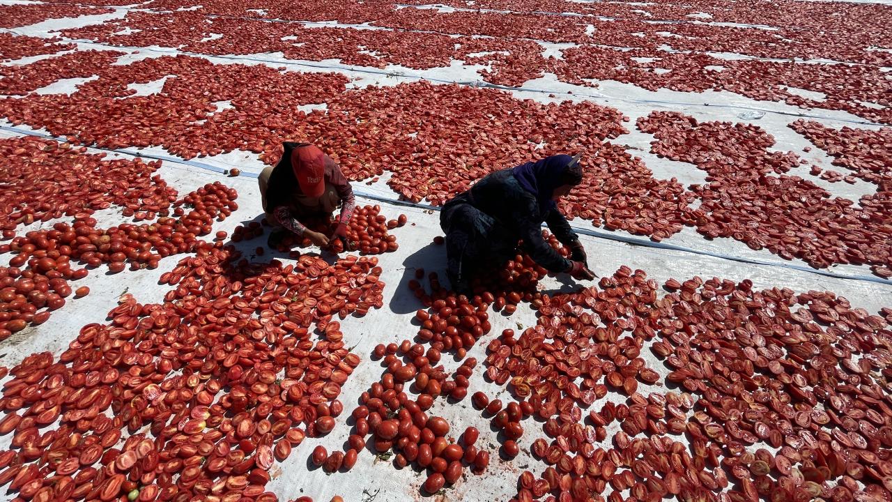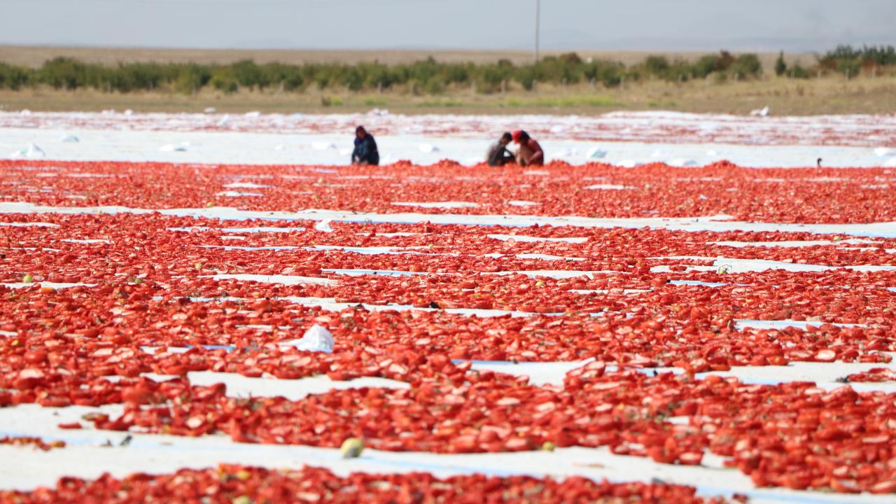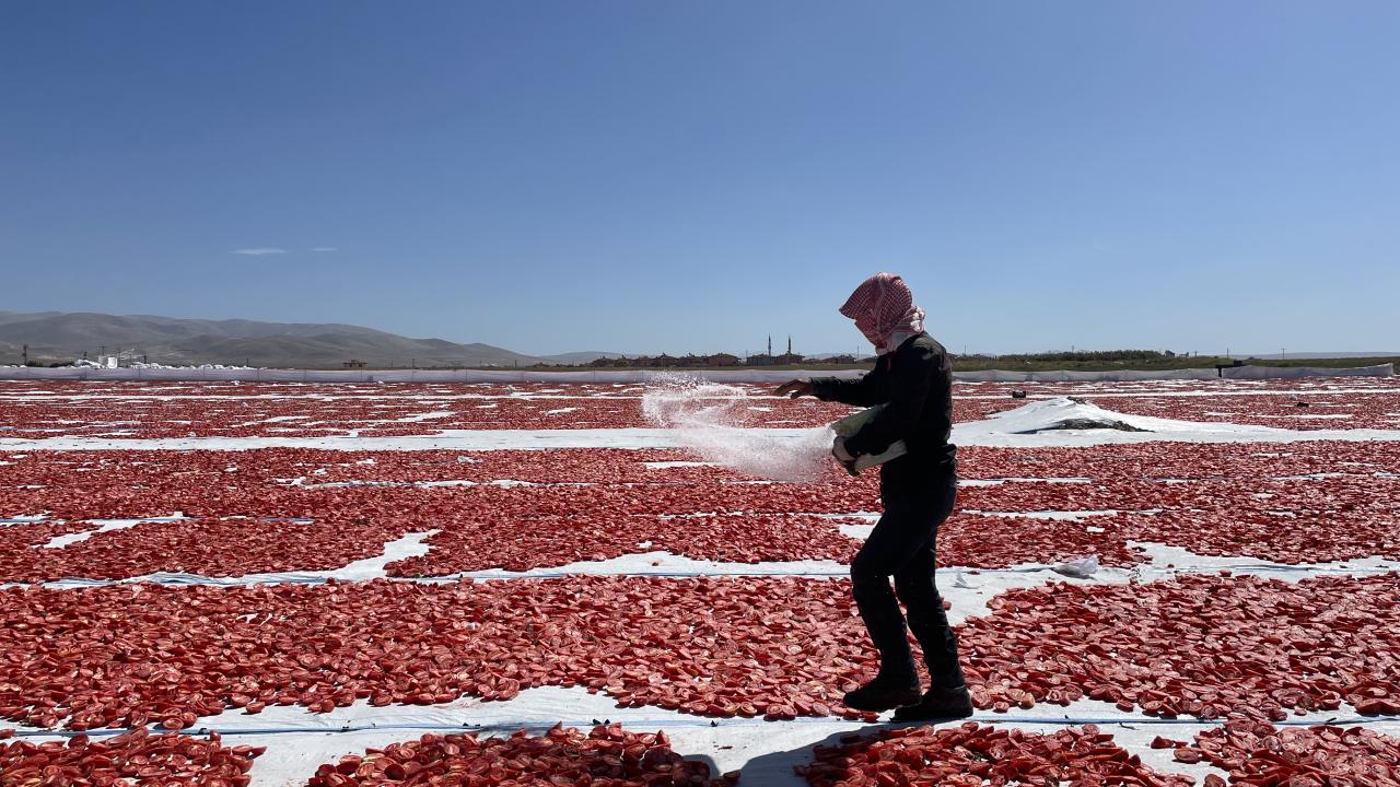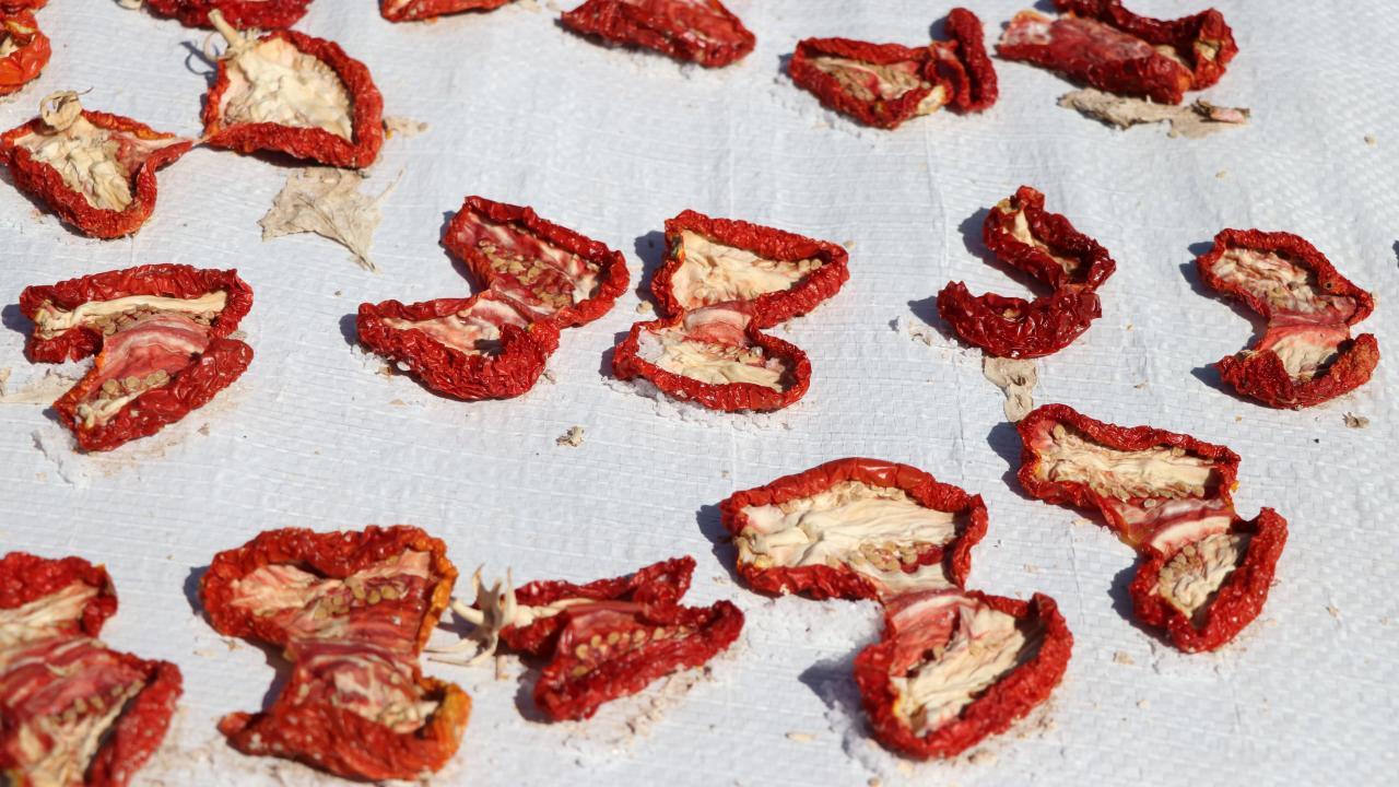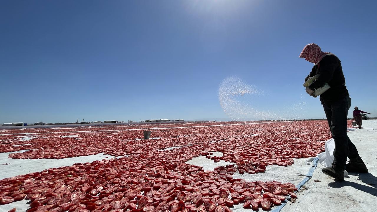 Günlük 100 ton domates, işçiler tarafından bıçakla ortadan bölünüp tuzlandıktan sonra açık alanda güneş altında kurumaya bırakılıyor.