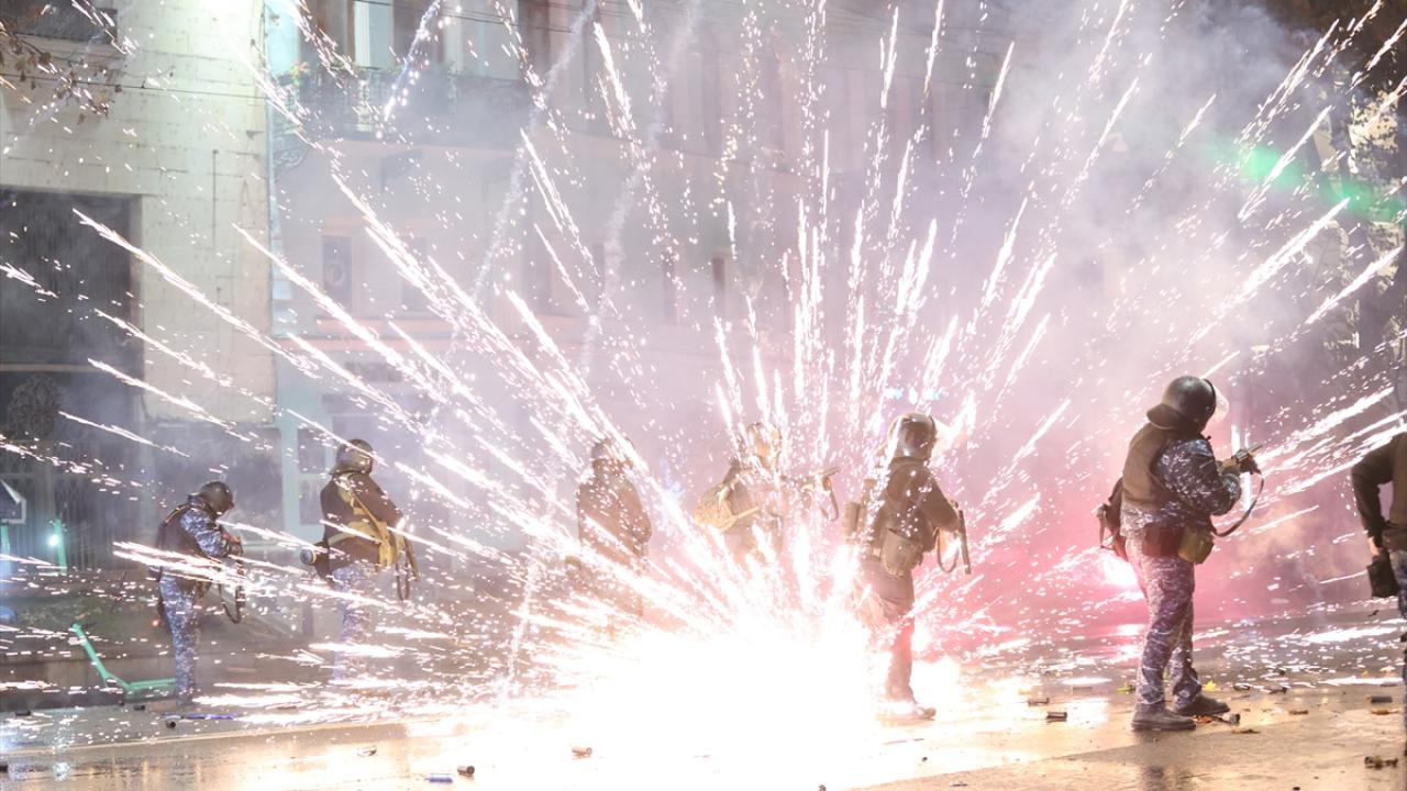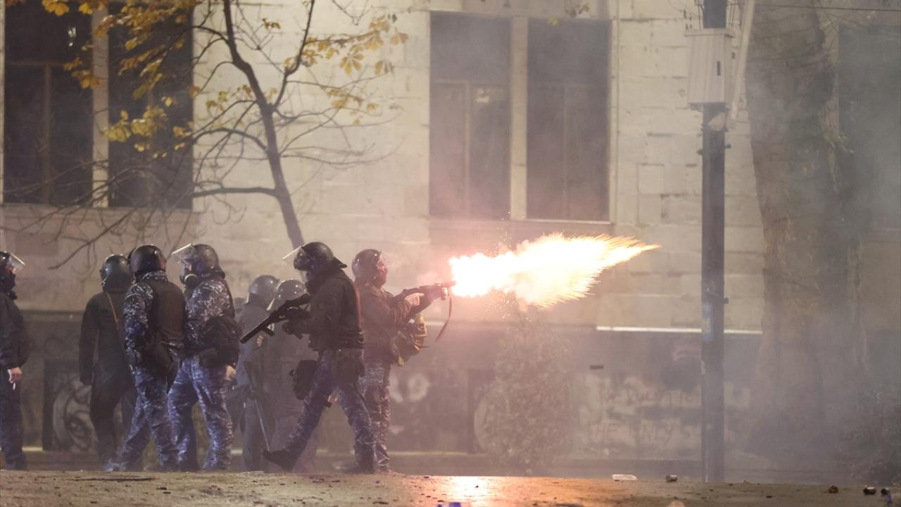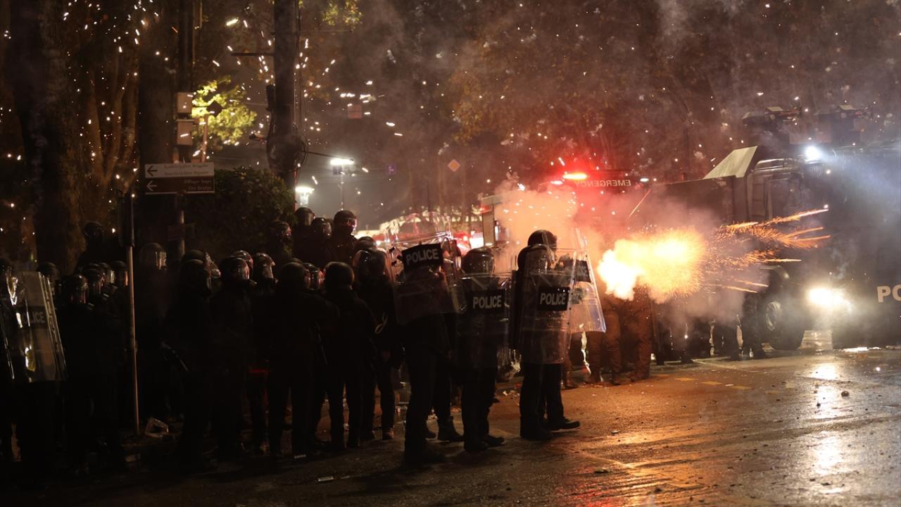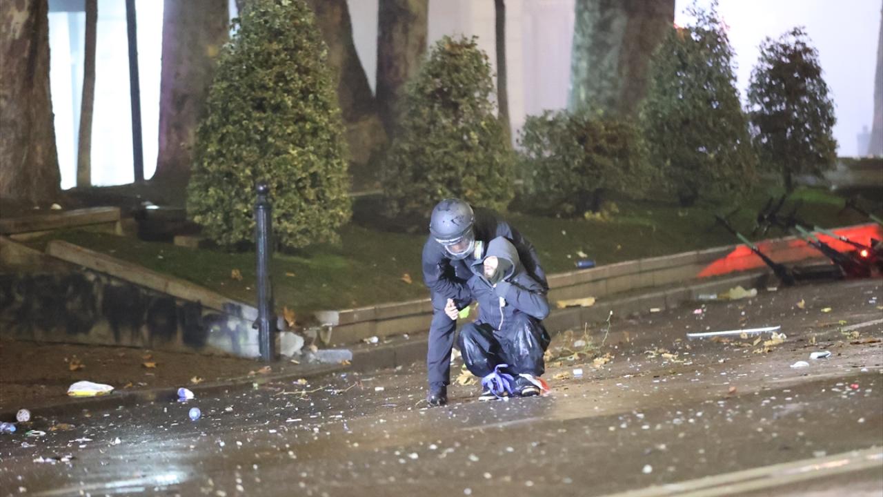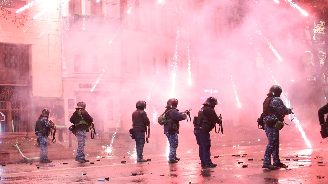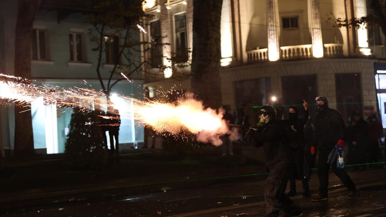 Gürcistan’da, Avrupa Birliği'ne (AB) katılım müzakerelerinin 2028’e kadar askıya alınmasına karşı devam eden gösterilerde yaşanan arbedede polis eylemcilere müdahale etti.