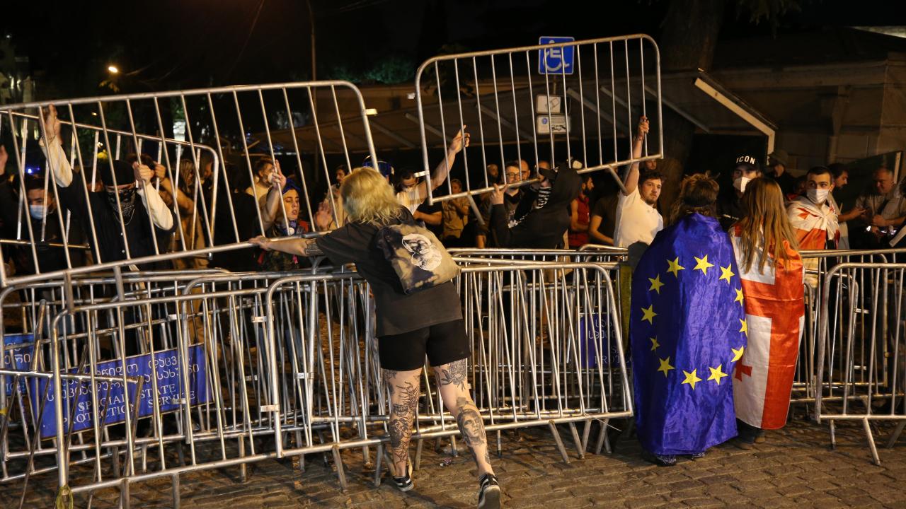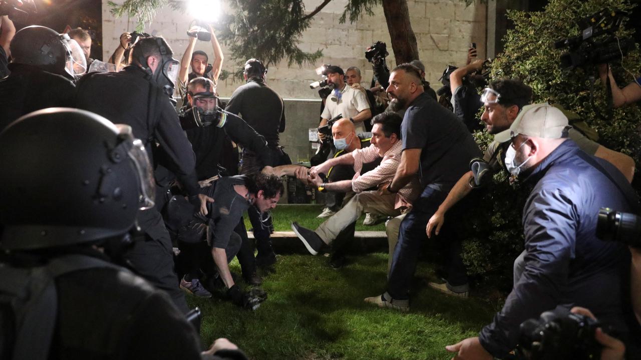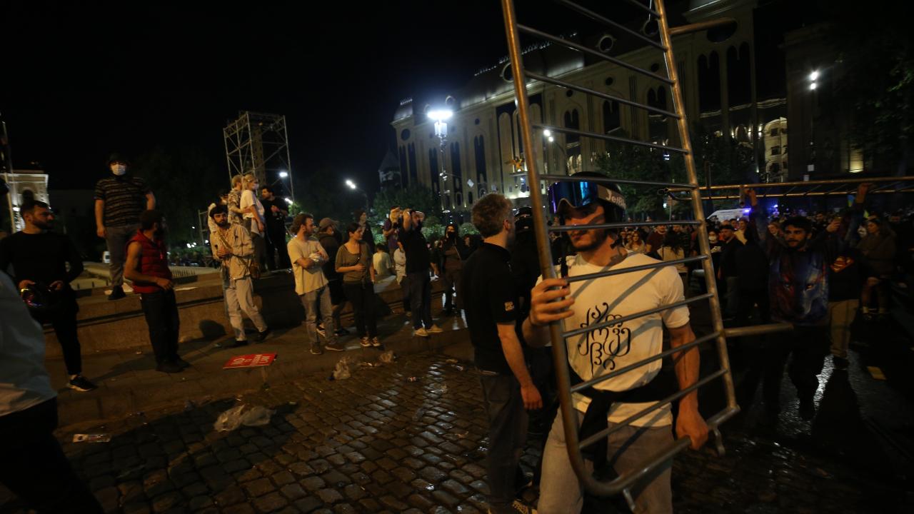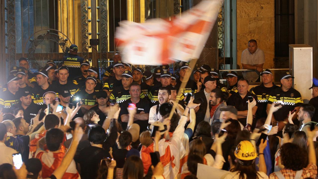 Tiflis`te gece saatlerinde Şota Rustaveli Caddesi`nde toplanan göstericiler, iktidardaki Gürcü Hayali Partisinin parlamentodaki milletvekillerinin dışarıya çıkışını engellemek için binanın girişlerini kapatmaya çalıştı.