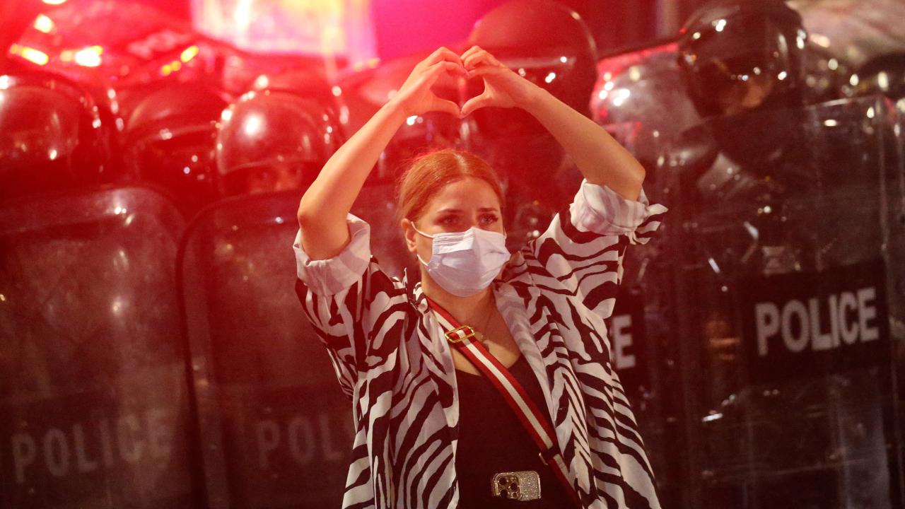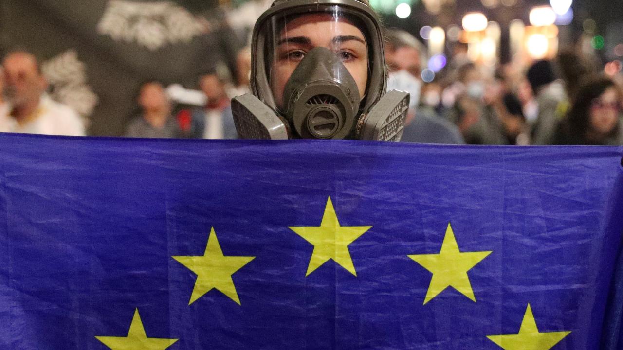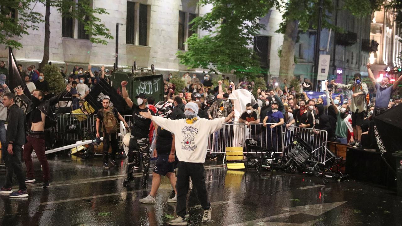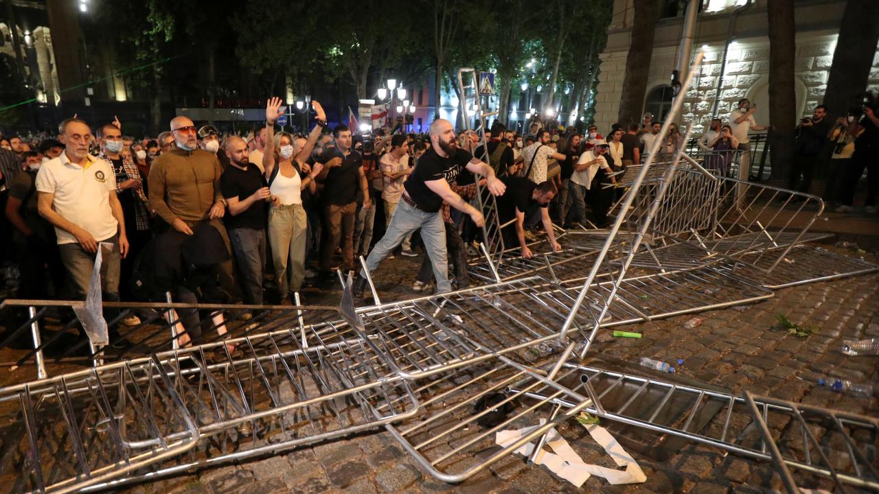 Tiflis`te gece saatlerinde Şota Rustaveli Caddesi`nde toplanan göstericiler, iktidardaki Gürcü Hayali Partisinin parlamentodaki milletvekillerinin dışarıya çıkışını engellemek için binanın girişlerini kapatmaya çalıştı.