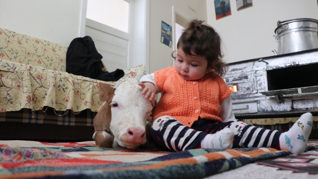 Üşümemesi için eve aldıkları buzağı minik Duru'nun arkadaşı oldu