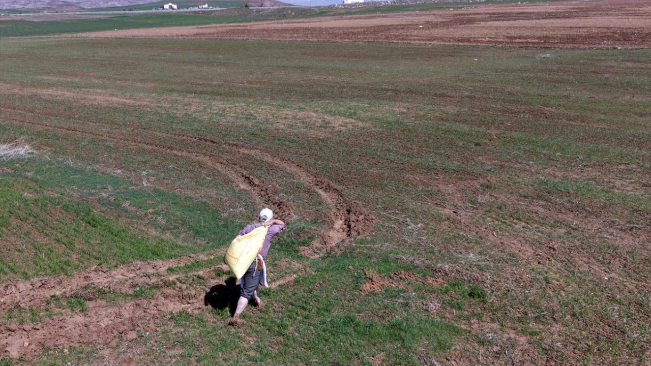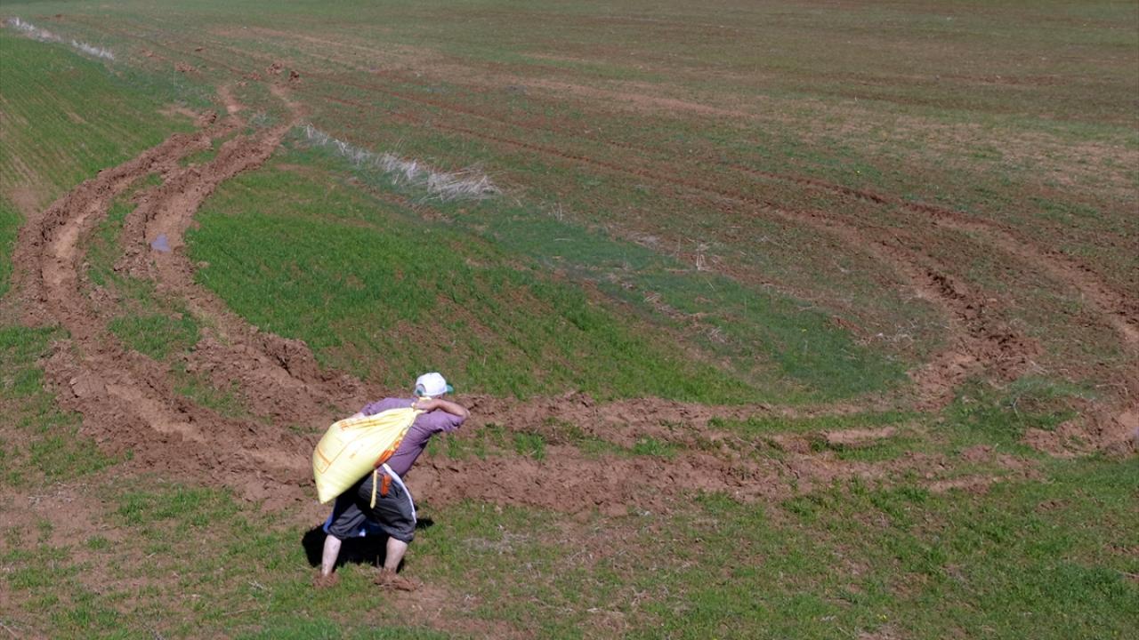 Bölgede üretim yapan bir çiftçinin gübre çuvallarını sırtında taşıyarak balçığa dönüşen tarlada yalın ayak ilerlediği anlar dronla kaydedildi.