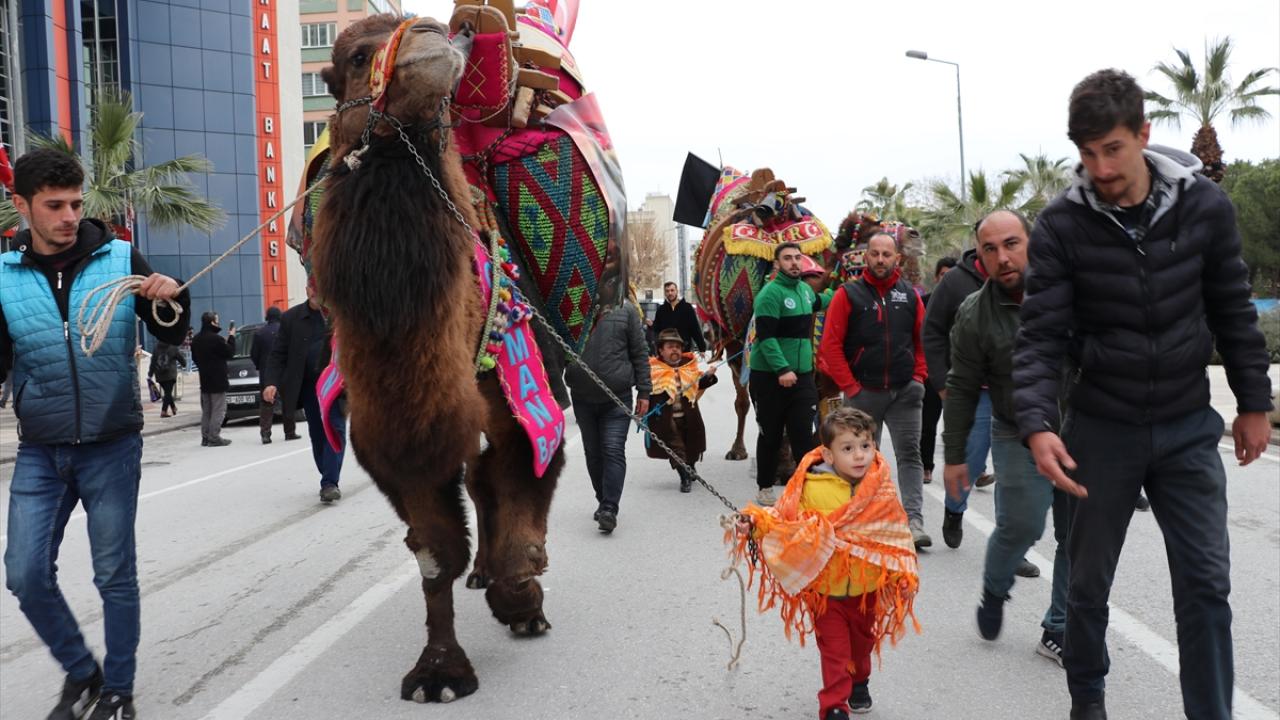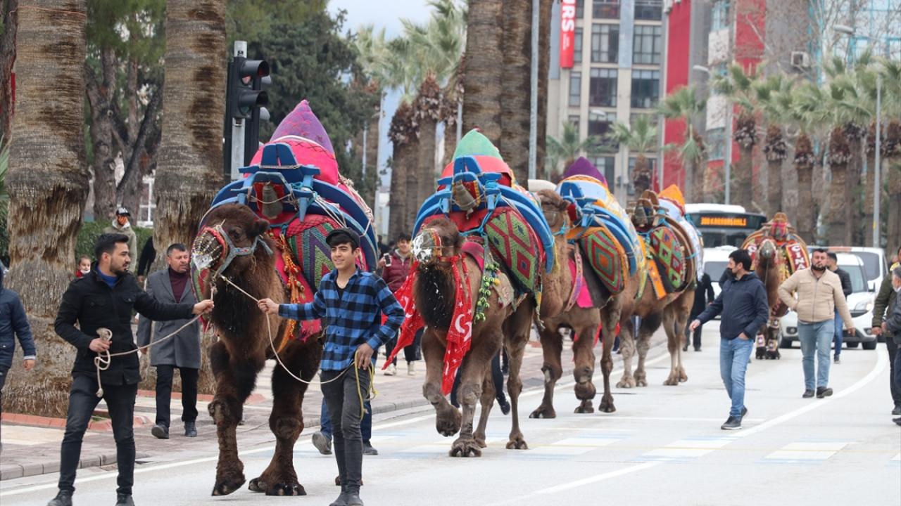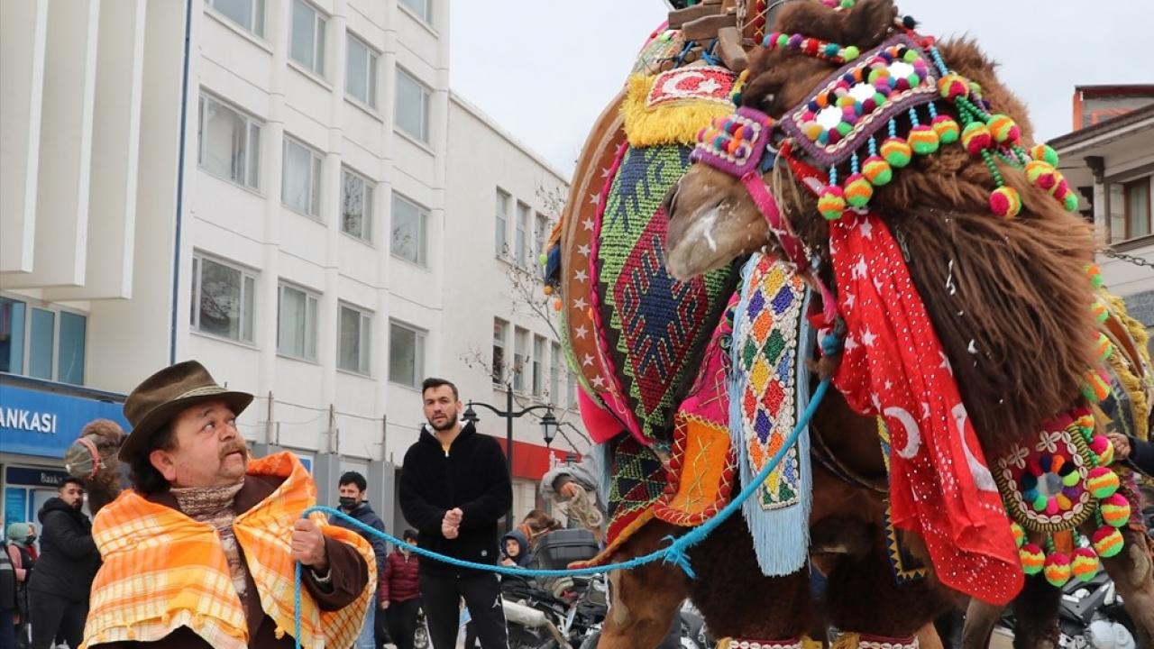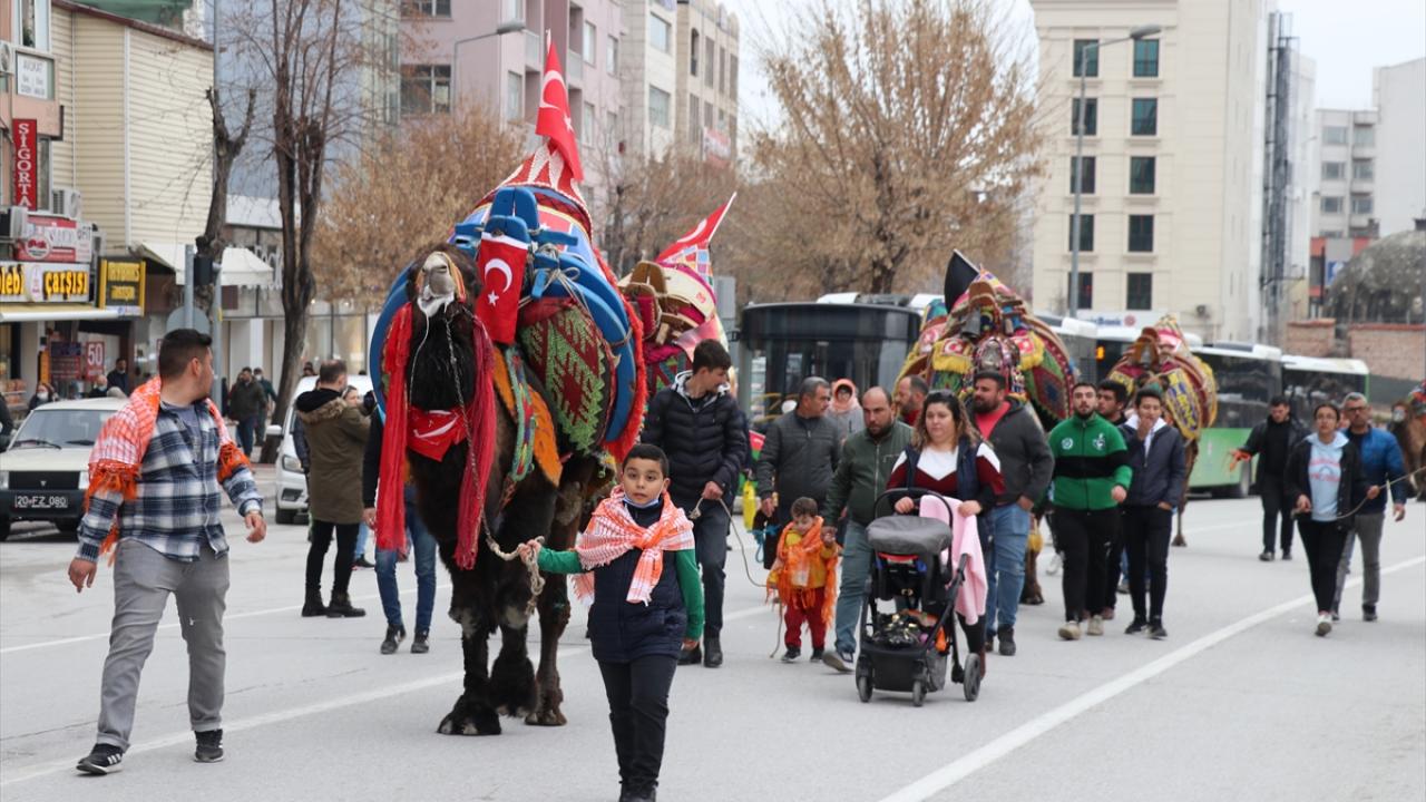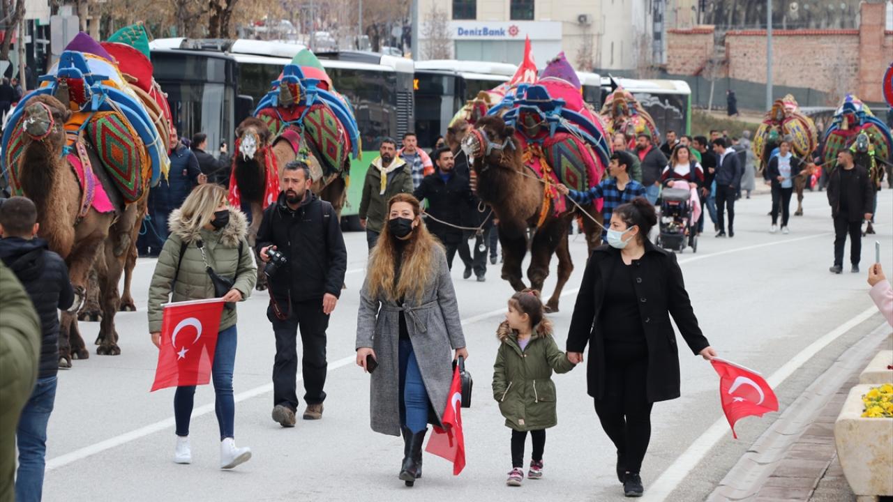 Türk bayrakları ve geleneksel süslerle donatılan develerin yürüyüşü, çevredekilerin ve özellikle çocukların ilgisini çekti.
