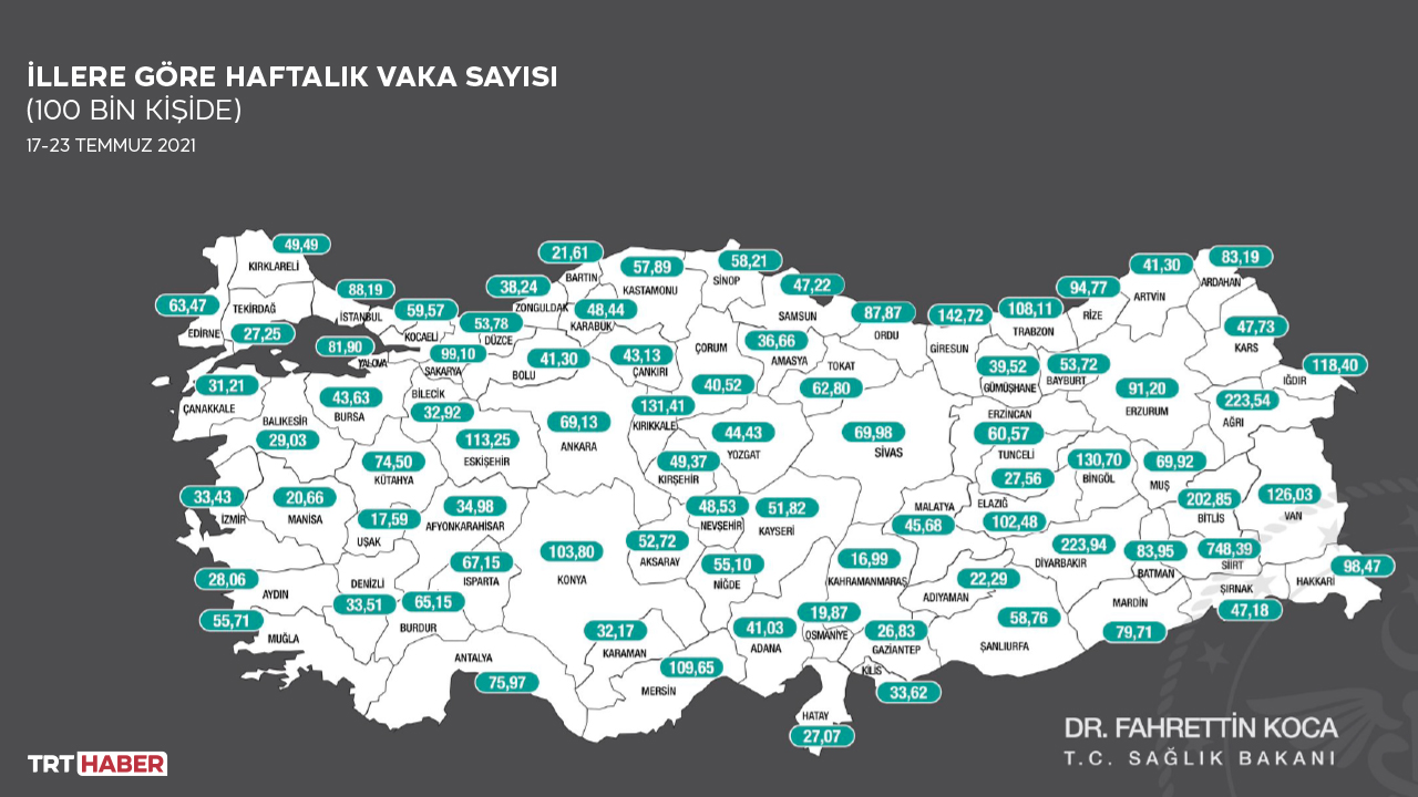 Sağlık Bakanı Fahrettin Koca, 17-23 Temmuz tarihli illere göre haftalık vaka haritasını paylaştı. İllere göre 17- 23 Temmuz tarihleri arasında COVID-19 vaka sayısı her 100 bin kişide İstanbul'da 88,19, Ankara'da 69,13, İzmir'de 33,43 oldu.