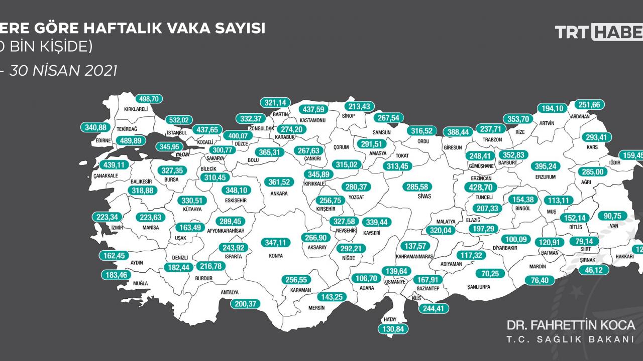 Sağlık Bakanı Fahrettin Koca, 24-30 Nisan arasında illere göre her 100 bin kişide görülen COVID-19 vaka sayılarını açıkladı. Bir önceki haftaya göre tüm illerde vaka sayıları azaldı.