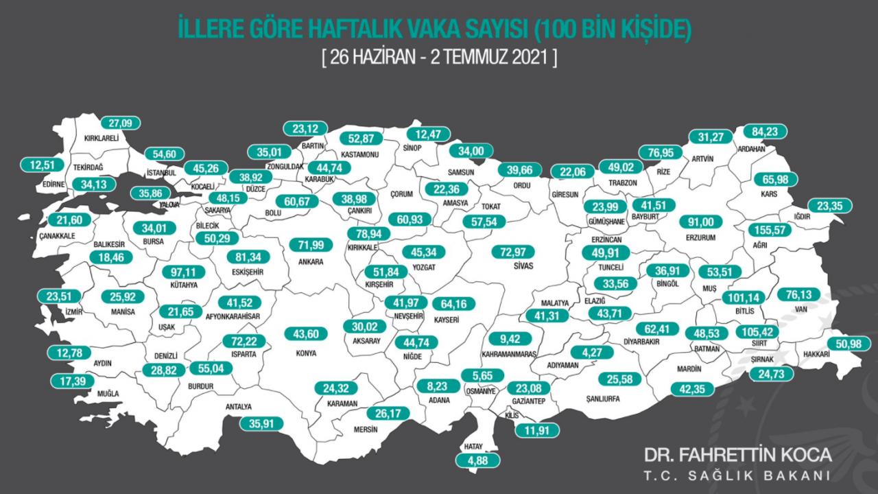 Sağlık Bakanı Fahrettin Koca, 26 Haziran-2 Temmuz'da illere göre her 100 bin kişide görülen COVID-19 vaka sayılarını açıkladı. En yüksek artış Ağrı'da yaşanırken, en düşük oran da Adıyaman'da gerçekleşti.