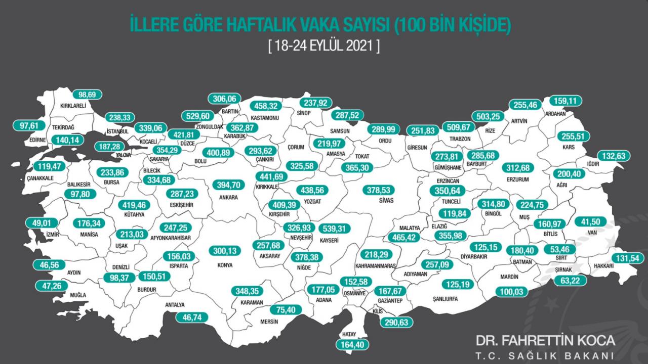 18-24 Eylül arasında 100 bin kişide görülen haftalık vaka haritası açıklandı. Kayseri, 539,31 ile en fazla vakanın görüldüğü il oldu. İşte il il son durum...