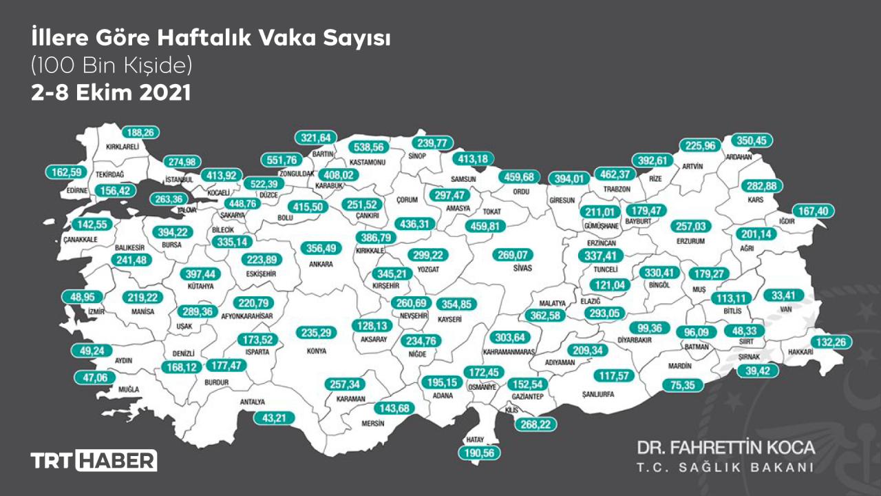 Sağlık Bakanı Fahrettin Koca, 2-8 Ekim arasında 100 bin kişide görülen haftalık vaka haritasını açıkladı. Zonguldak en fazla vakanın görüldüğü il oldu.