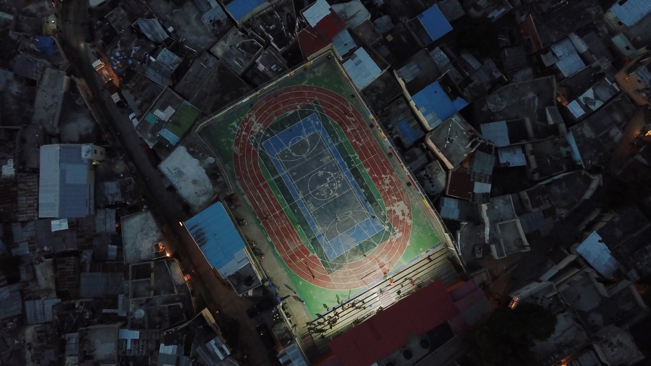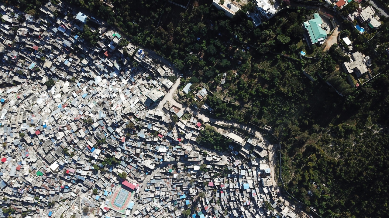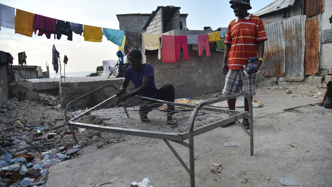 Haiti`ni Fort-National bölgesinde, küçük çimentodan evler, muşambadan üretilen derme çatma sığınaklar ve çöp dolu şeritler bulunuyor.