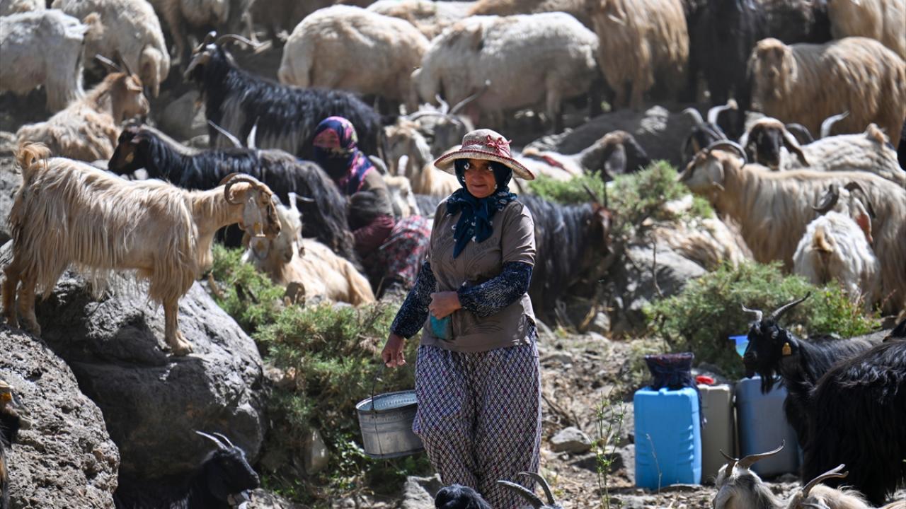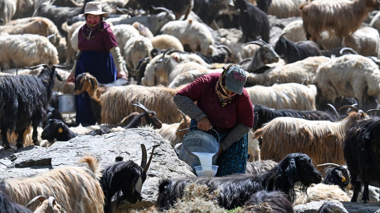 Engebeli arazide zorlu geçen yolculuğun ardından sağım işleminin yapıldığı noktaya ulaştırılan koyun ve keçiler, berivanlar (süt sağan kadınlar) tarafından sağılıyor.