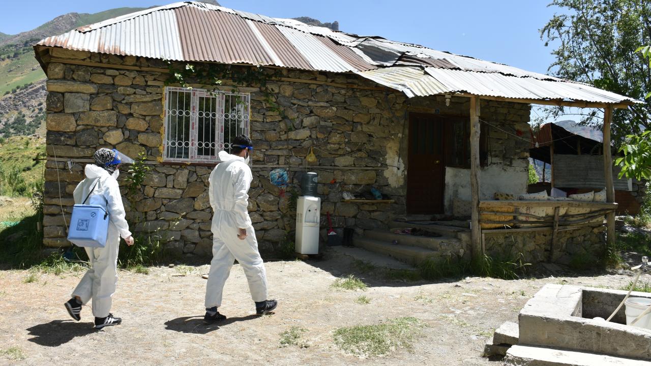 Araçla ulaşımın olmadığı evlere sıcak havaya rağmen tulumlarıyla yürüyerek giden sağlık çalışanları, Covid-19 tedbirleri altında vatandaşların aşısını yaparak aşılama oranını yükseltmek için çaba gösteriyor.
