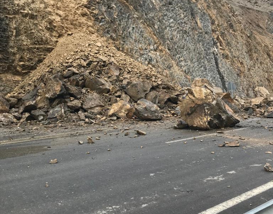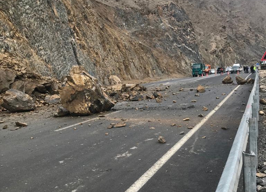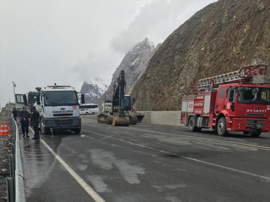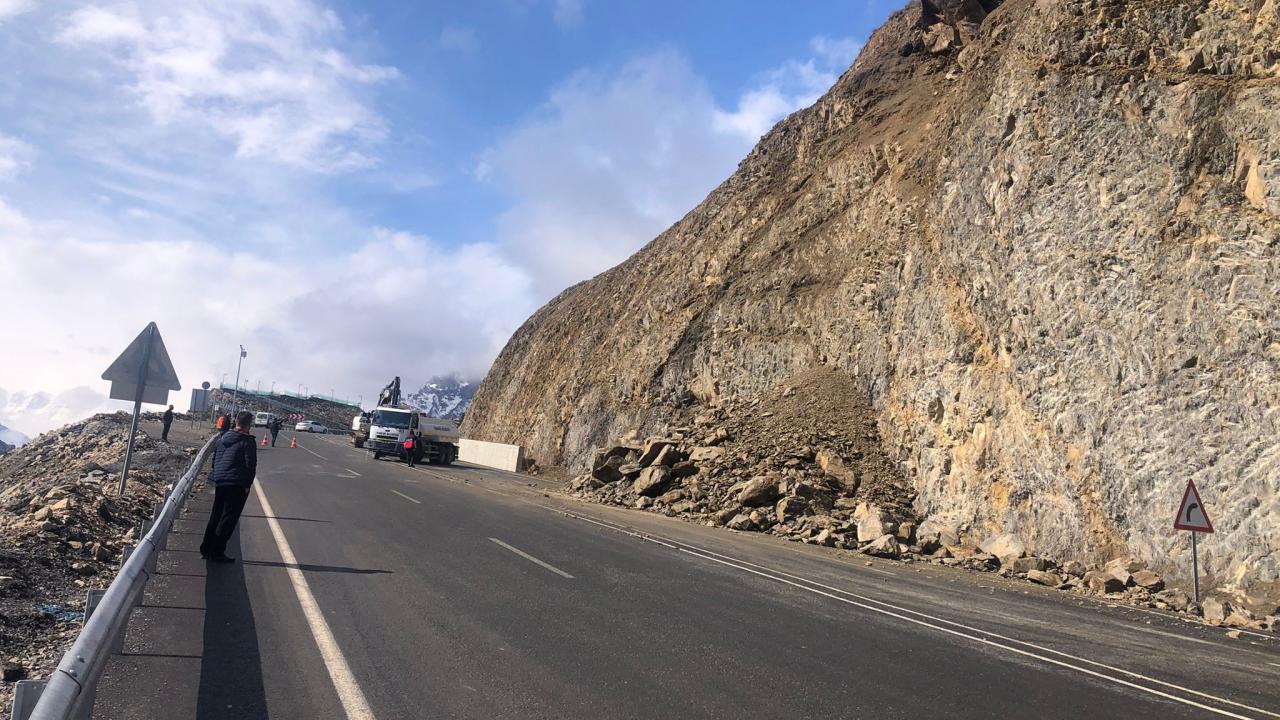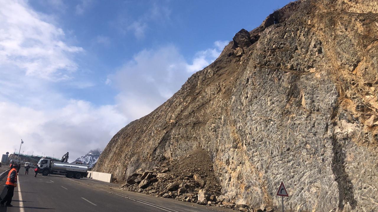 Hakkari'de dağdan kopan kayaların düştüğü yol, kısa süreliğine ulaşıma kapatıldı.