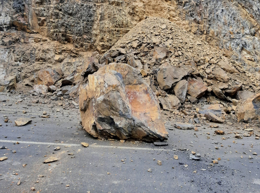Dağdan yuvarlanan kaya parçalarının ulaşımı engellediği yolda, Karayolları ekipleri iş makinesiyle çalışma başlattı.