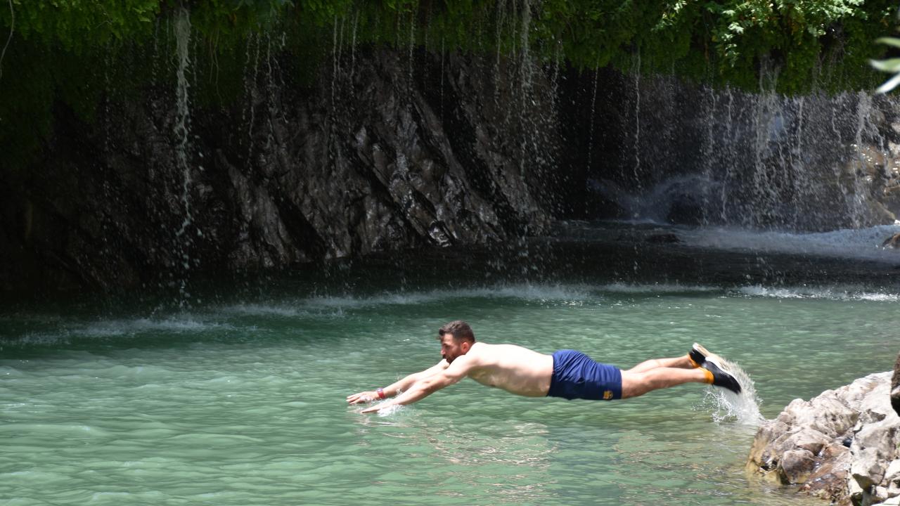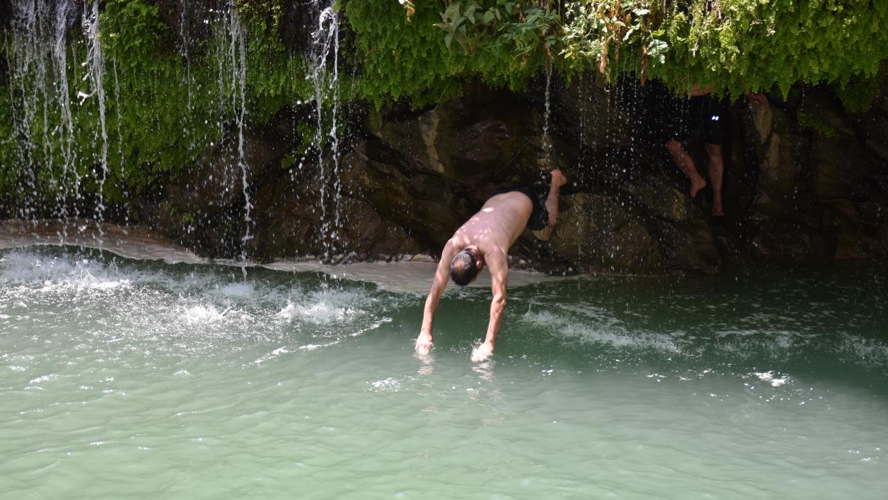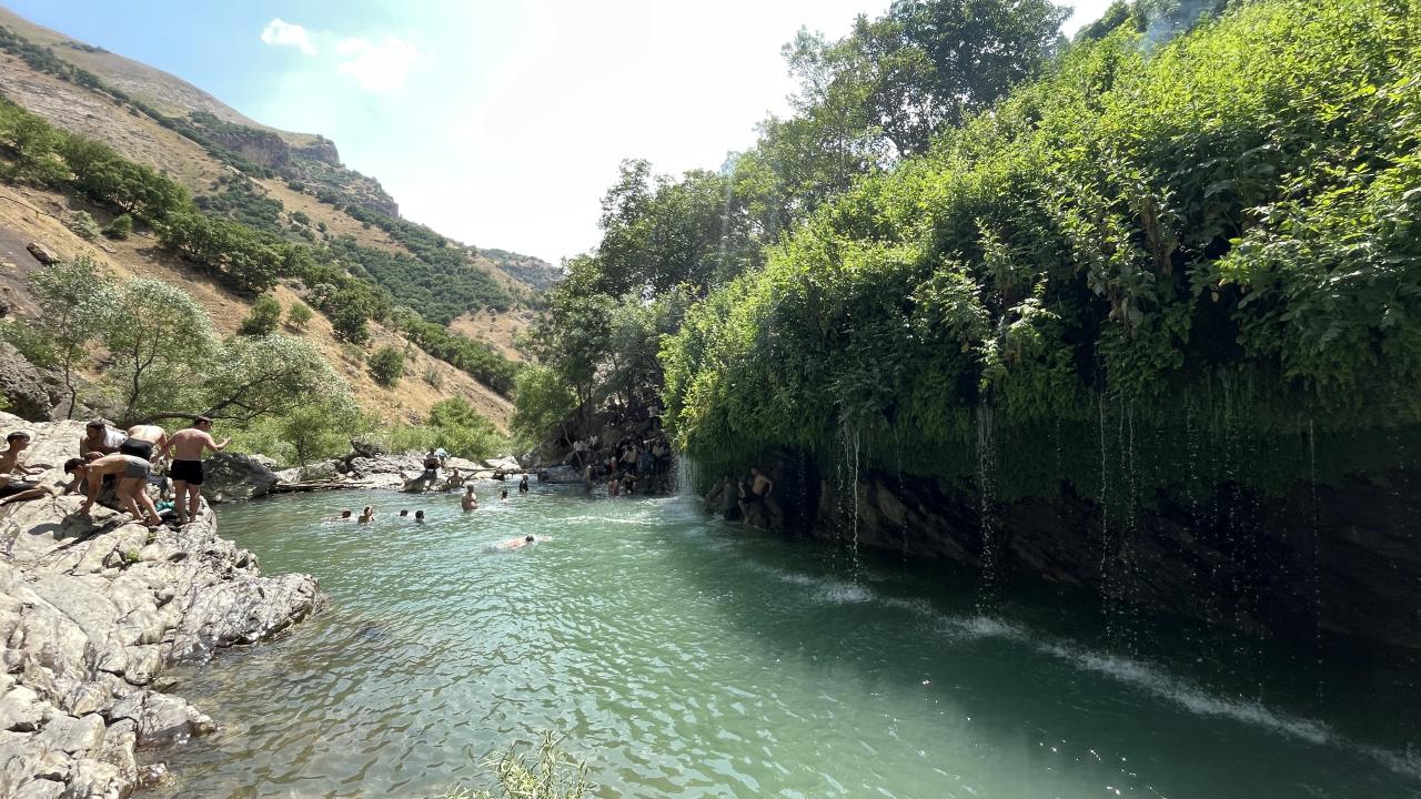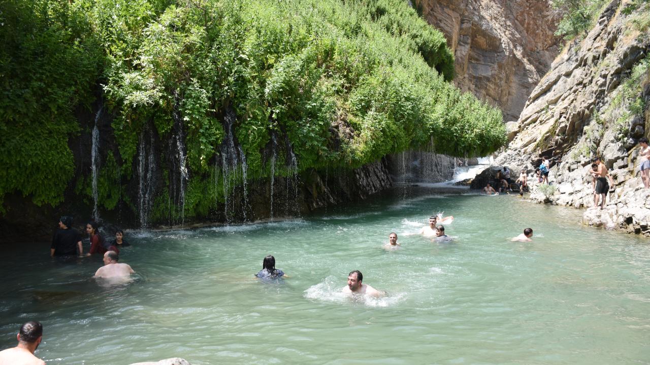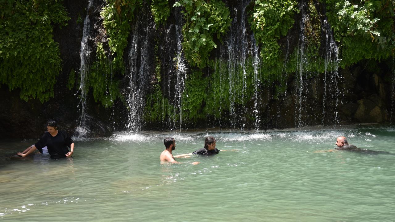 Doğayla iç içe zaman geçirmek için şelaleye gelenler, piknik yapıp, serin suda yüzerek serinlemeye çalışıyor.