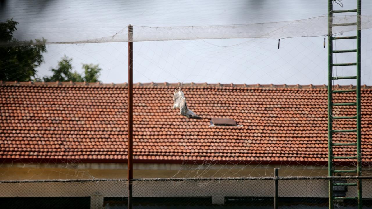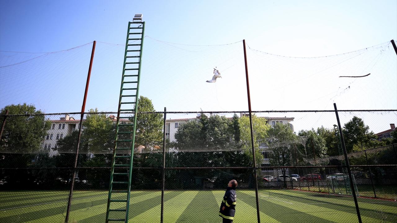 Mimar Sinan Mesleki ve Teknik Anadolu Lisesi bahçesindeki halı sahanın filesine takılan martıyı görenler, durumu 112 Acil Çağrı Merkezine bildirdi.