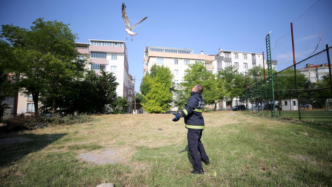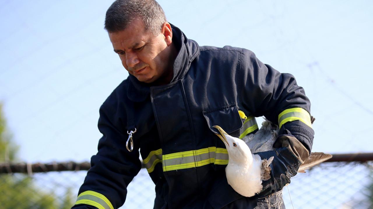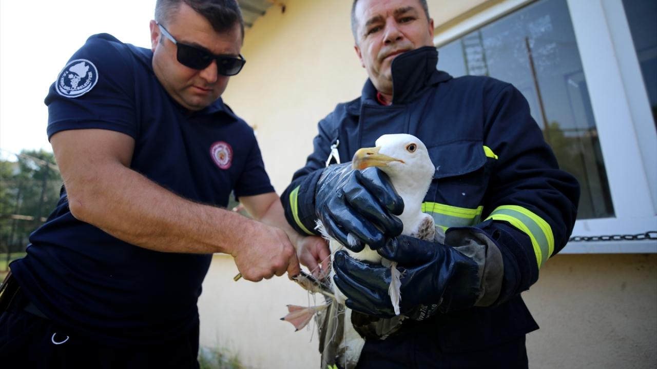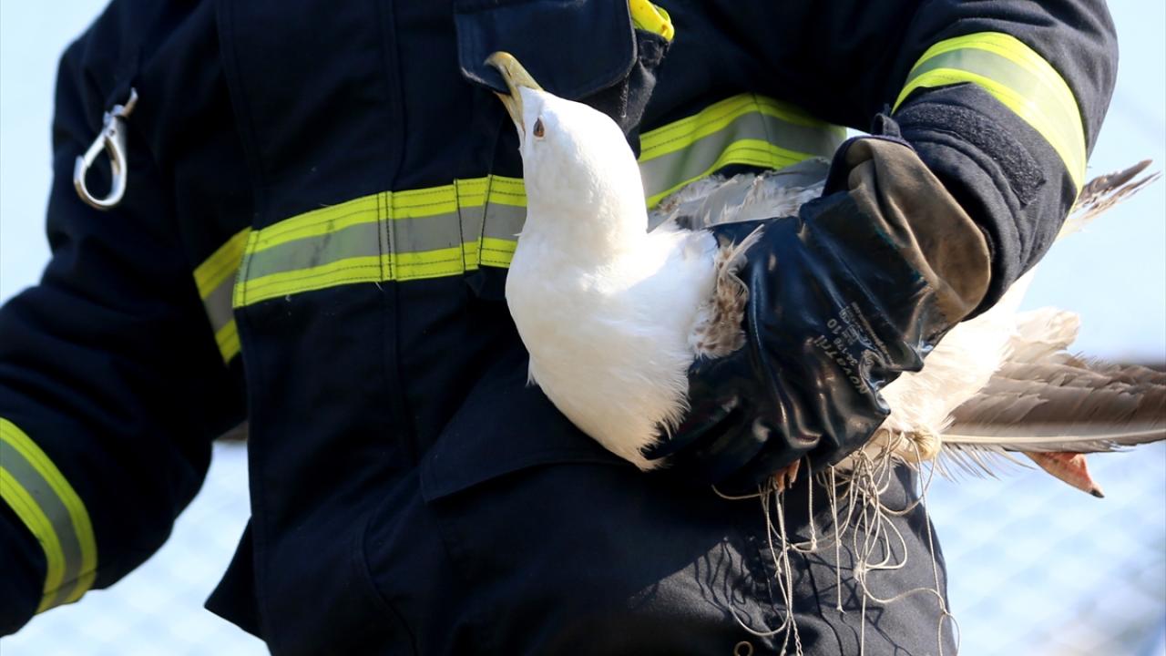 Kuşun ayağı ve boynuna takılan ipleri kesen itfaiye ekipleri, ardından martıyı salıverdi.